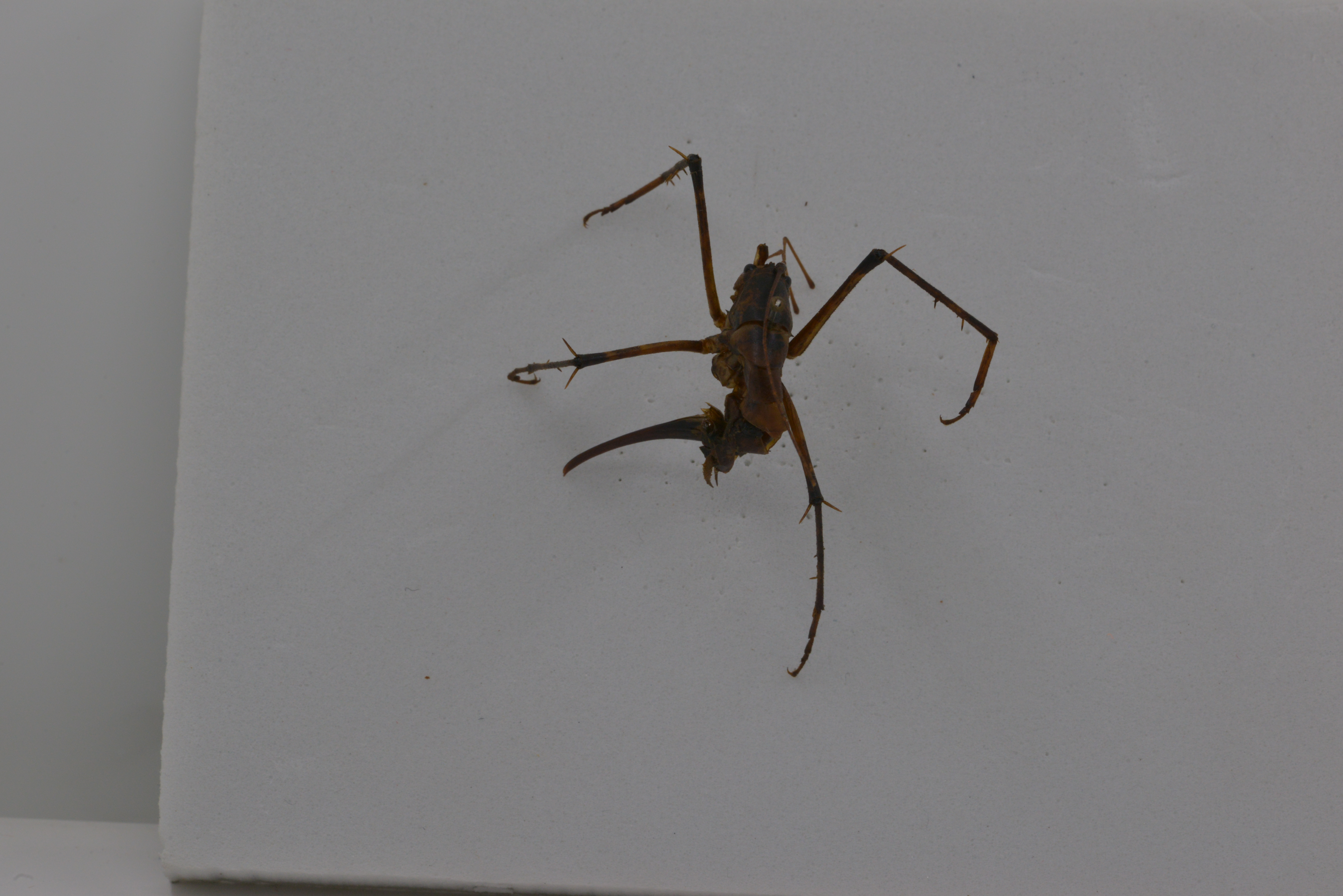Legs long and slender; fore femora about 2.7 times as long as the pronotum, beneath unarmed, internal knee lobewithout spines, genicular lobe with 1 long movable spur; fore tibia beneath with 2 external and 2 internal spurs,