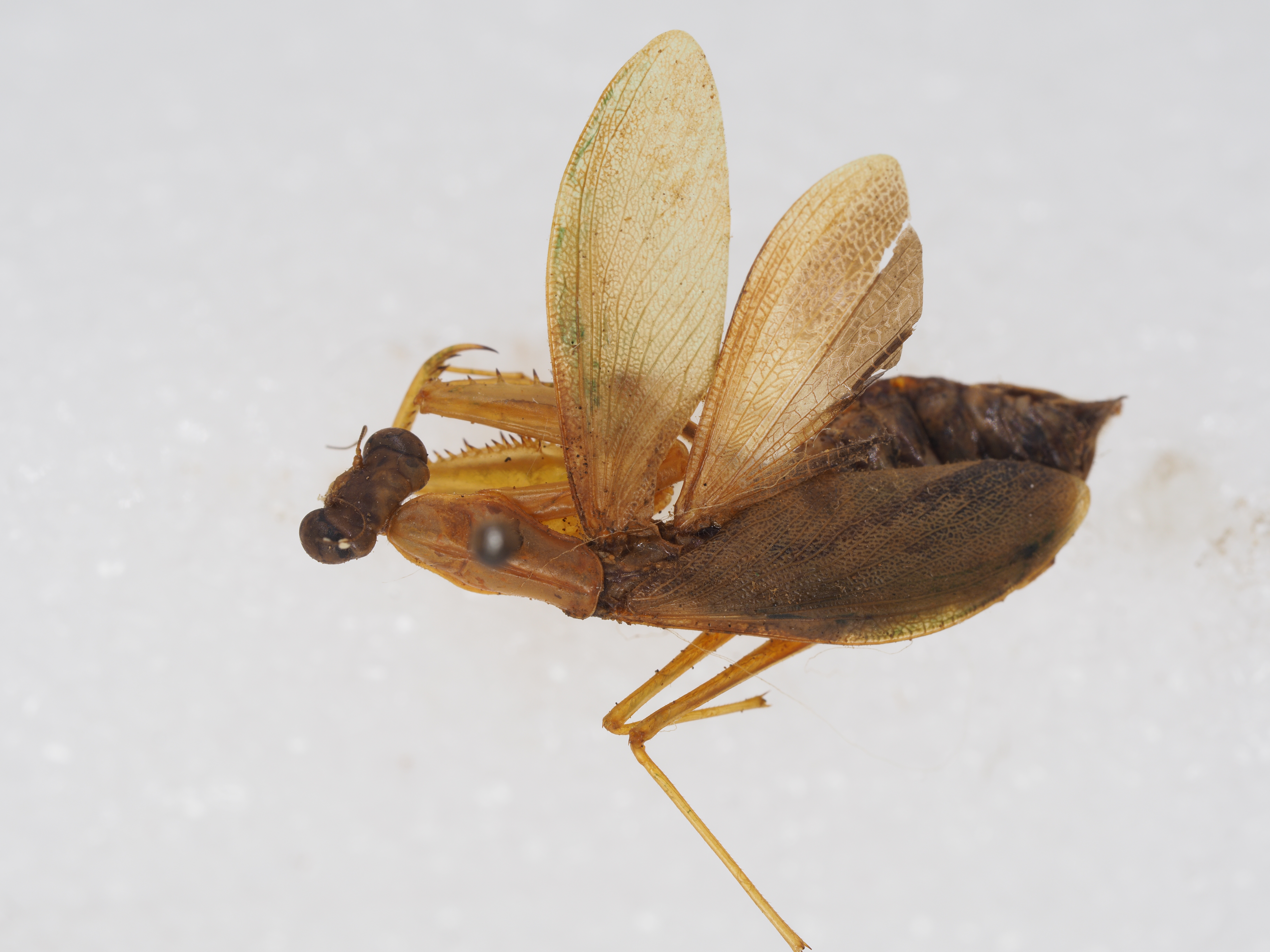 体色头部褐色。前胸背板黄褐色。前翅绿色,前缘域基部为黄褐色,臀膜烟黑色。后翅除前缘域外,沿外缘具有一横的烟黒色宽带,其余淡黄色。前足腿节淡黄色,各刺的端部为黒褐色前足跗基节黄色,各跗节的端部为淡褐色。