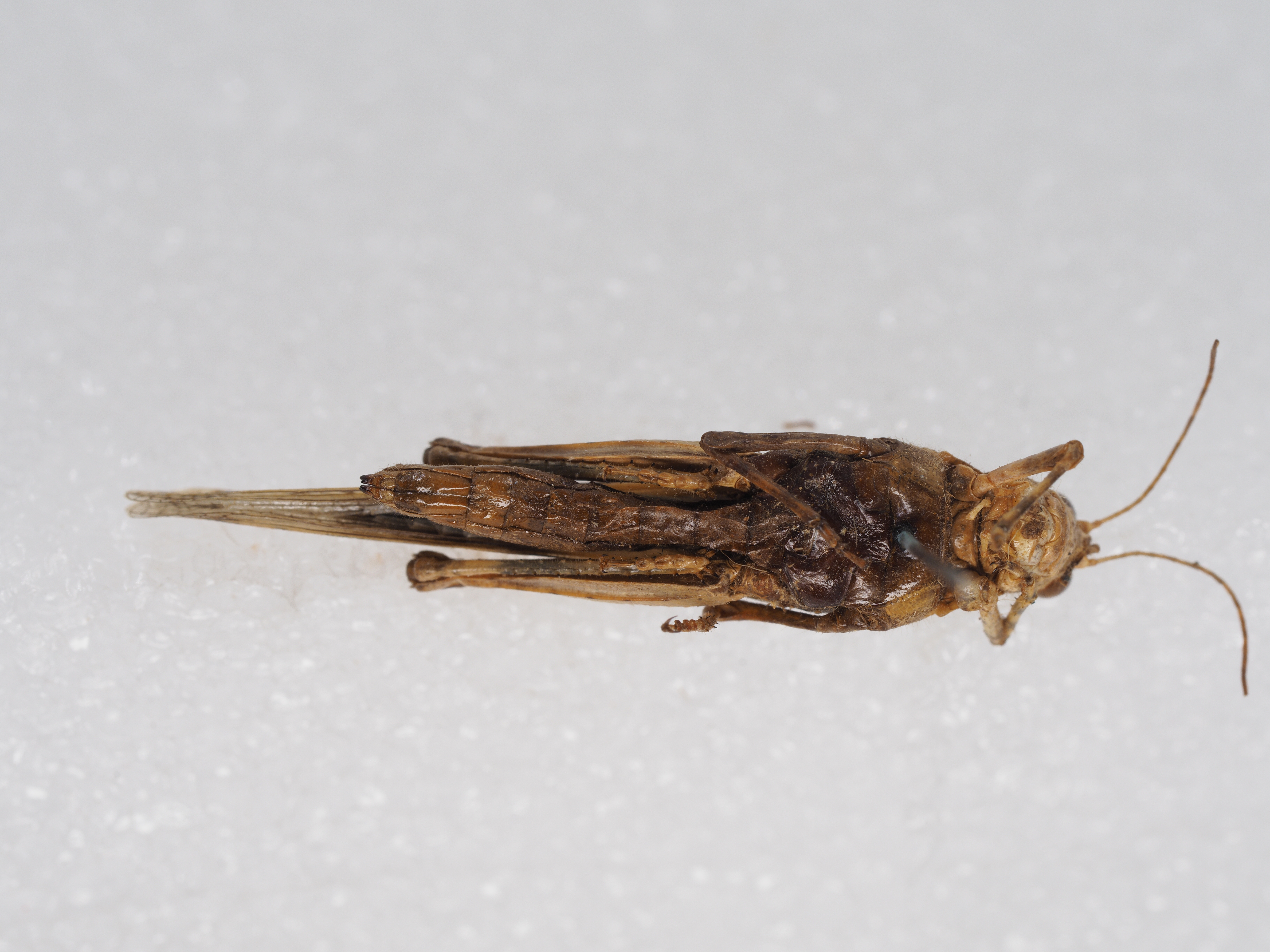 描述:雄性 体型中等。头短,侧面观略高于前胸背板。头顶短宽,两侧缘隆起明显,复眼间头顶的宽度约为触角间颜面隆起宽的2倍。头侧窝不明显。触角丝状,超过前胸背板的后缘。复眼卵圆形,略突出,垂直直径约为水平直径、眼下沟距离的1.2倍。前胸背板沟前区较缩狭,沟后区较宽平,后缘呈钝圆形,中隆线低、细,3条横沟明显,都割断中隆线,后横沟位于中部之前,沟后区的长度约为沟前区长的2倍,侧片的后下角圆,略渐尖。中胸腹板侧叶间之中隔较狭,中隔宽度近等于其长度。前翅狭长,超过后足胫节的端部,长约为宽的6.4倍,中脉域的中闰脉端部略靠近中脉,径分脉3分枝。后足股节匀称,股节的长度约为宽度的3.5—4.3倍。后足胫节略短于股节,外缘具刺7—8个,内缘具刺9—10个。后足跗节爪间中垫小,不达爪的中部。下生殖板短锥状,顶端钝圆。
