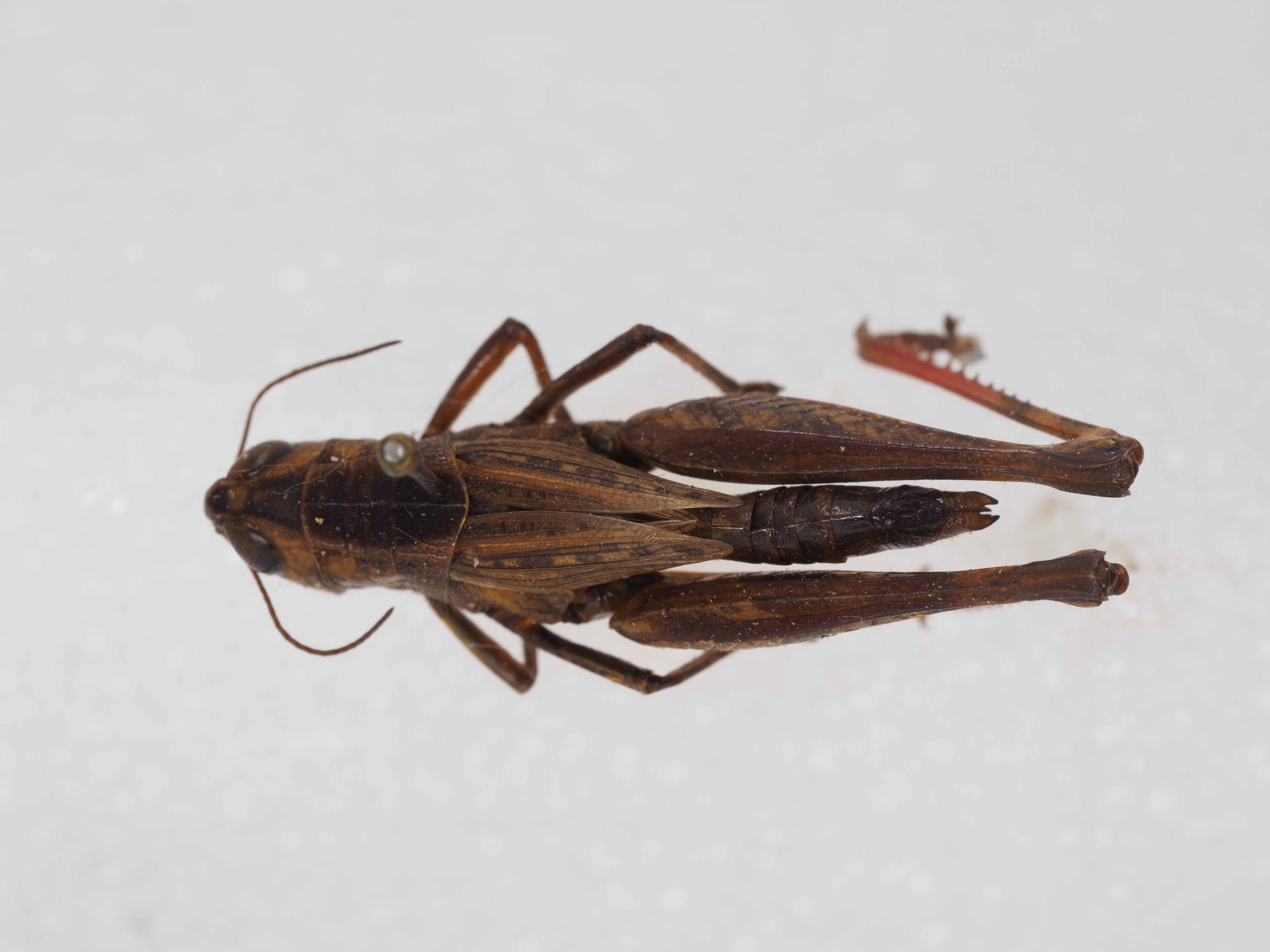 描述:雄性 体型中等偏小。头较短于前胸背板,头顶稍向前倾斜,背面略低凹,中隆线很弱,几乎不显。颜面侧观略向后倾斜,颜面隆起全长明显,边缘宽平,下端较宽,具粗大点刻。触角丝状,略超过前胸背板的后缘。复眼大,其垂直直径为水平直径的1.4倍,并为眼下沟长的2.5倍。前胸背板前缘较直,后缘中央略向后突出,中隆线明显,两侧隆线在前端相趋近,在沟后区较不明显,3条横沟均切断中隆线和侧隆线,后横沟位于中部之后,沟前区长为沟后区长的1.25倍。前胸背板侧叶下缘中部向下突出。前胸腹板突圆柱形,略向后倾斜,顶端圆形,略膨大。前、后翅较短,不到达后足股节的中部,刚超过腹部第4节背板的后缘,在腹部背面毗连。后足股节略粗壮,上侧中隆线具细齿,下膝侧片端部圆形。后足胫节上侧内缘具刺9个,外缘具刺10个,缺外端刺。后足跗节第1节的长约等于第2、3节的长度之和。肛上板宽舌形,基部中央具纵沟。尾须长锥形,端部尖细,略向内屈。下生殖板圆锥形,顶端略尖。