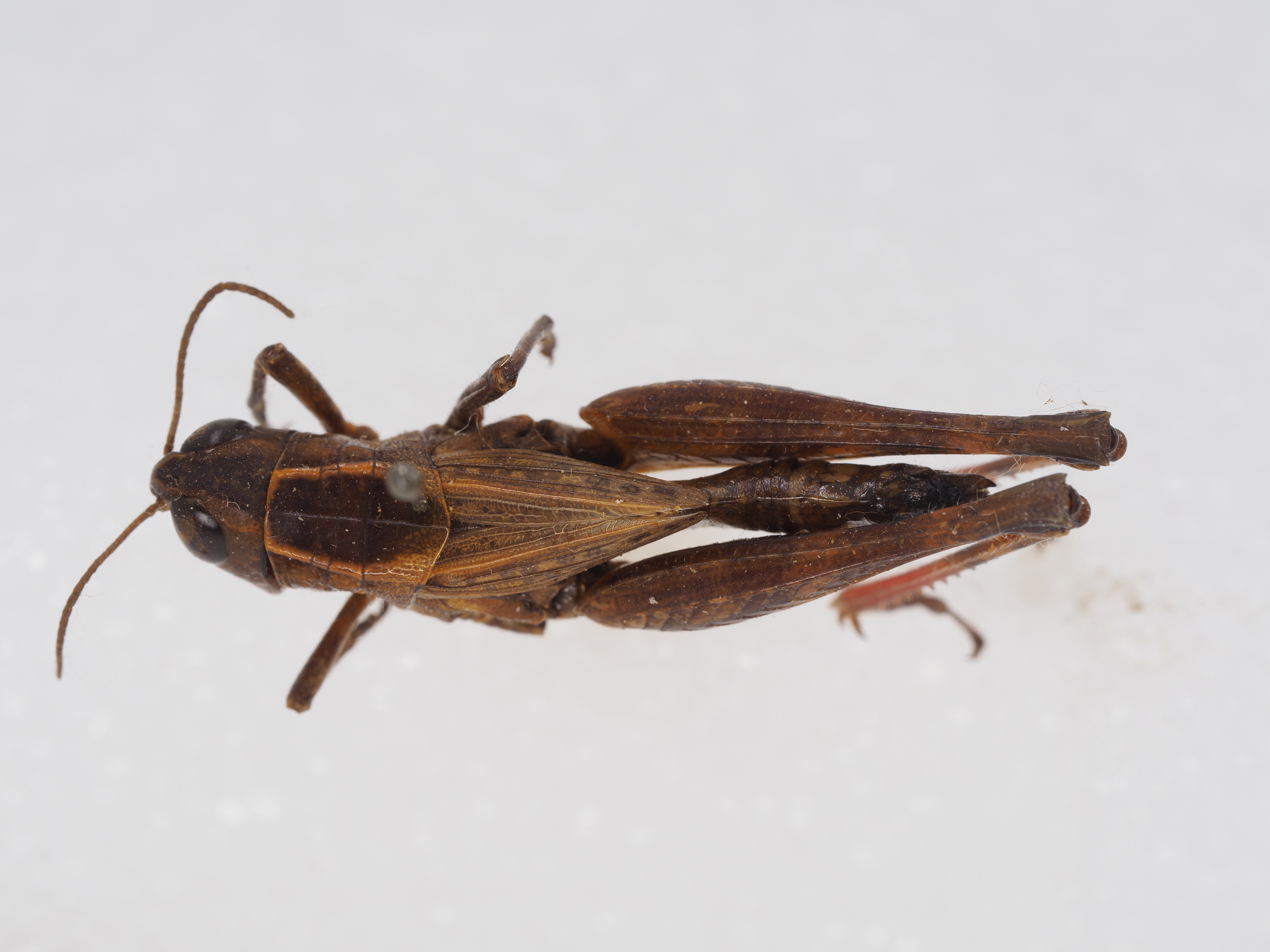 体色:体暗褐色。头部具不规则的暗色小圆斑。头顶和前胸背板背面黑色,沿侧隆线为黄褐色。前翅散布黑褐色斑点,后翅本色透明。后足股节黄褐色,上侧和内侧具2个黑褐色斑纹,外侧中区具3个黑褐色斜斑纹,膝部除下侧膝片外为黑色,底侧淡黄色。后足胫节基半部黄褐色,具2个黑色环纹,端半部血红色。后足跗节基部红色,余为黄褐色。雌性同雄性体色基本相似,但黑褐色斑纹没有雄性明显。