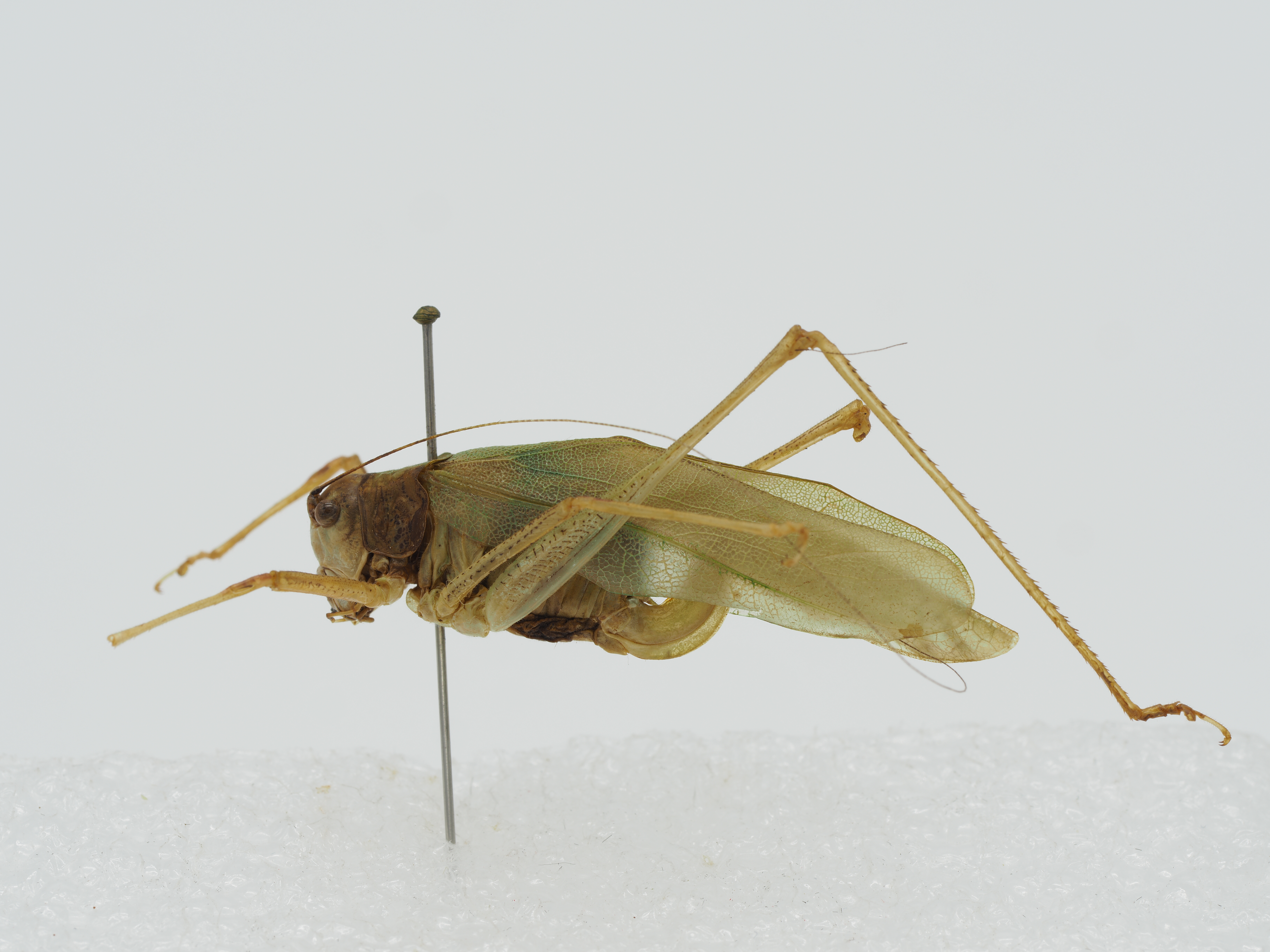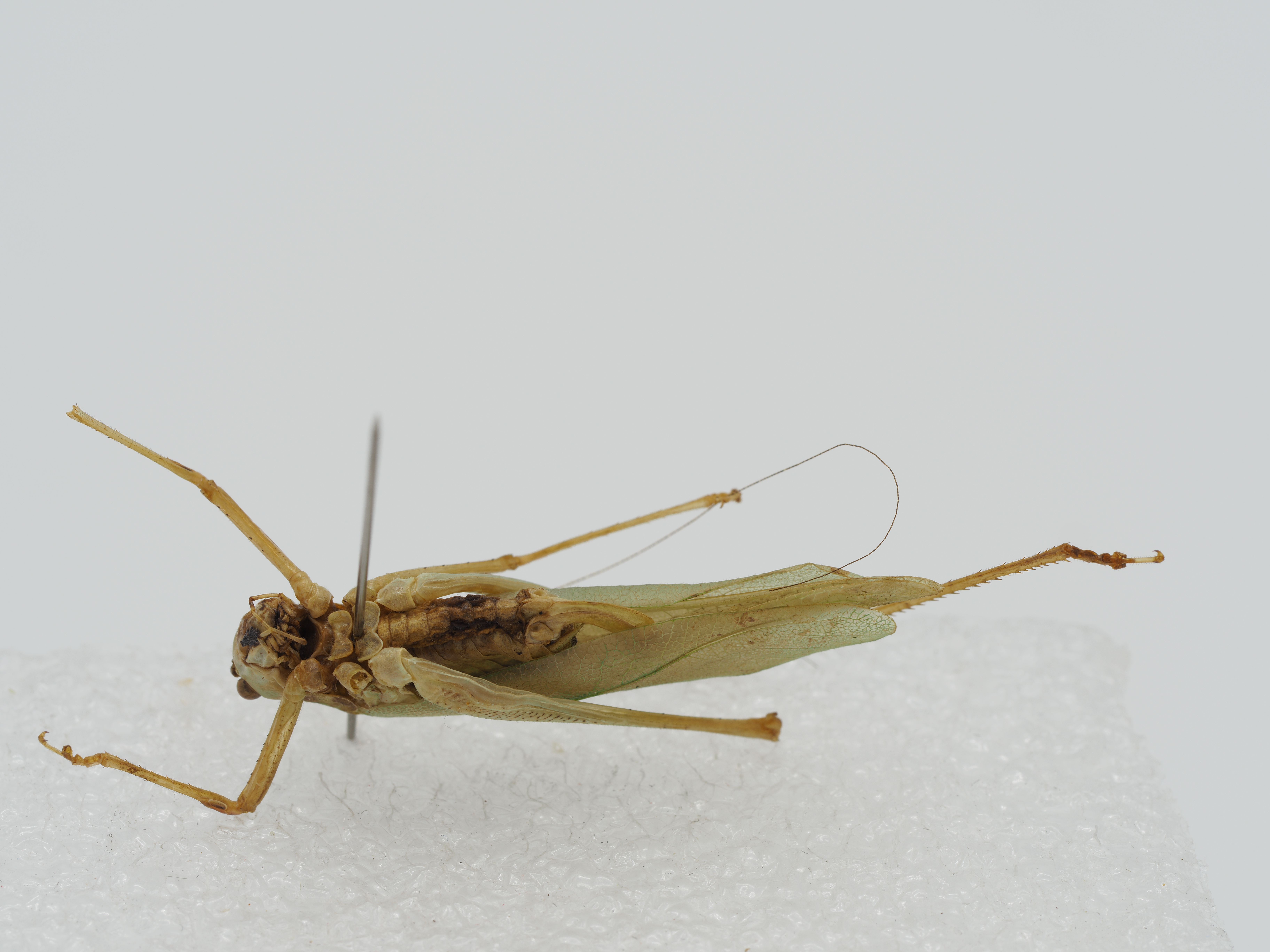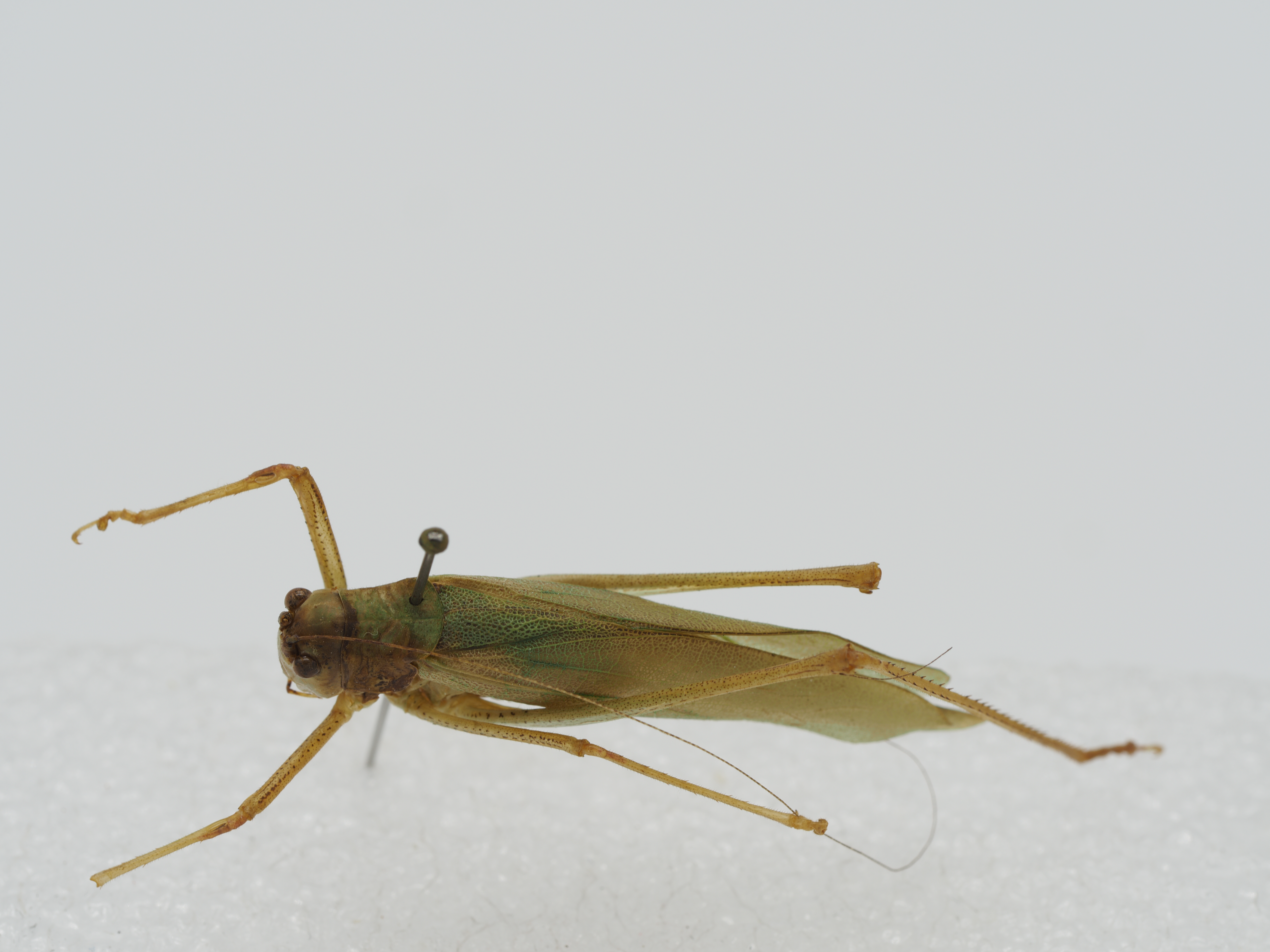 体 绿 色 ,腹部背面中央具较宽的黑色纵带。各 足 股 节 内 、外 两 侧 具 暗 褐 色 斑 点 或 斜 条 纹 。