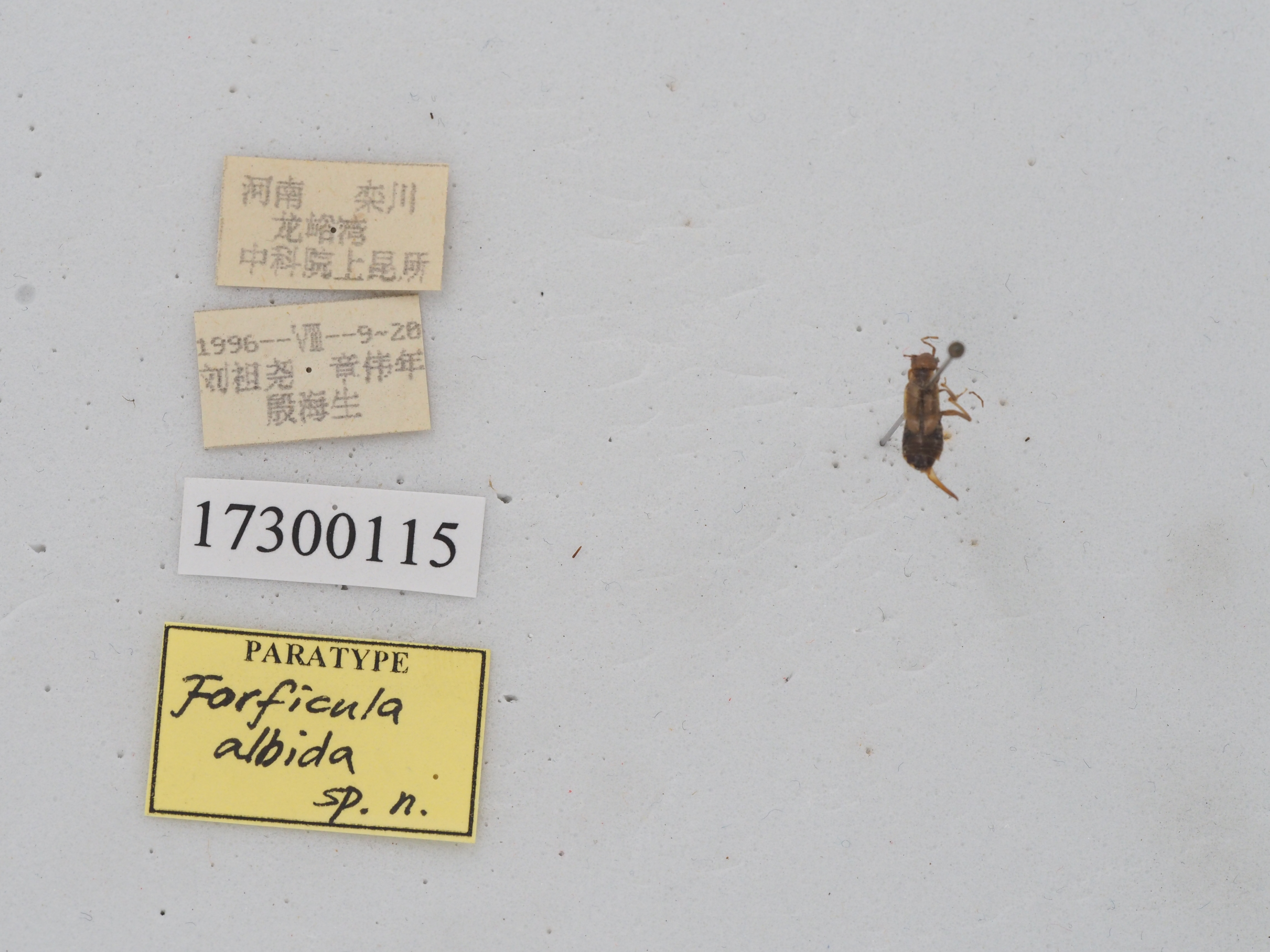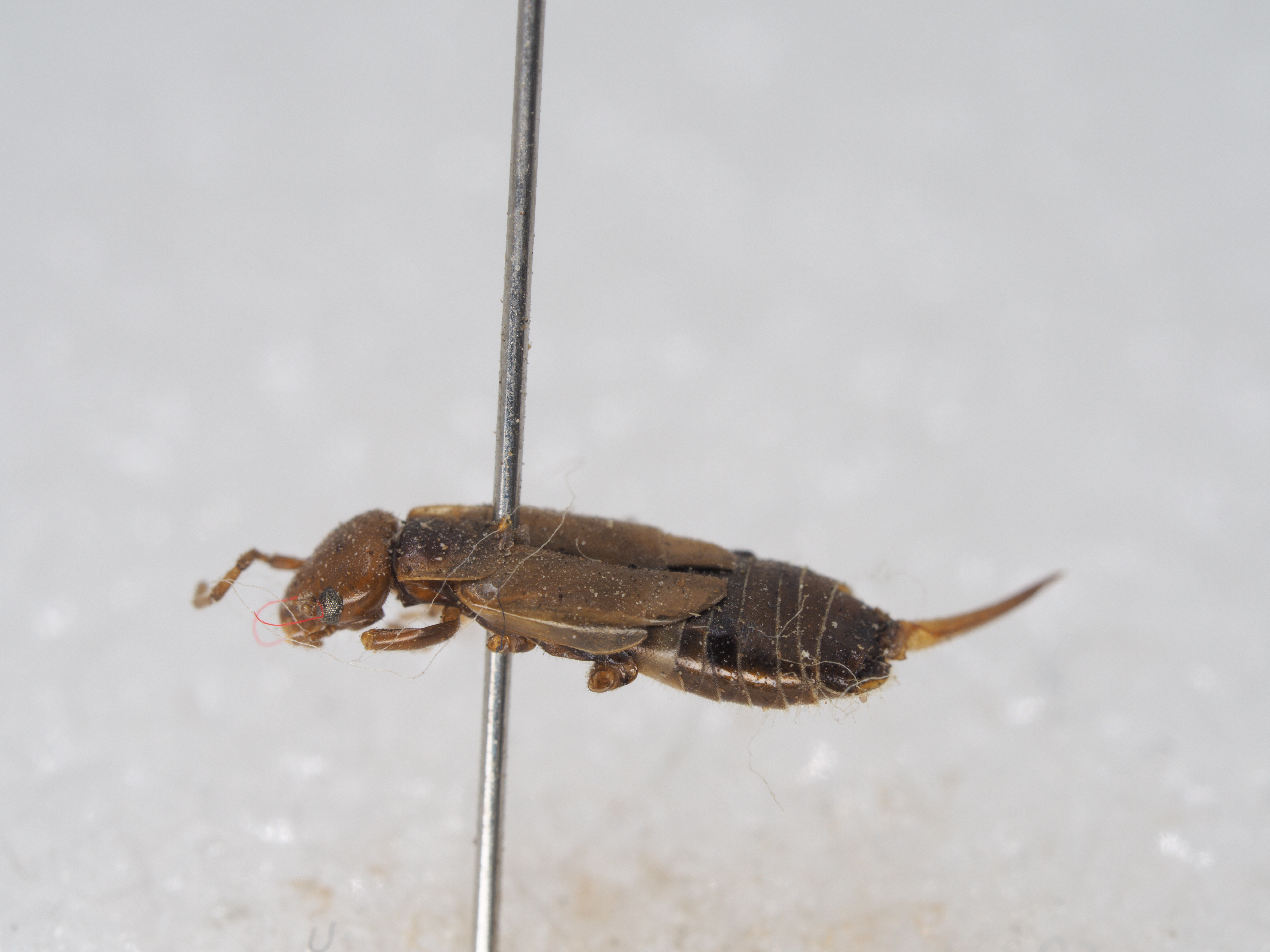 表面具极弱的刻点后翅长于前翅。足较粗壮。腹部狭长,中部稍扩宽,表面具较密的细刻点,第3、第4节两侧具腺褶。雄性第10腹节背板横宽,背面中央微凹陷,两侧具弱的隆丘肛上板突出,端部截形或微圆尾铗微内弯,基部扩宽部分约占全长的l/3(图6-8-2)端角呈钝角形(短铗型)或直角形(长铗型),内缘齿不明显阳基端叶较长。雌性尾铗较直,几乎毗连,内缘缺细齿(图6-8-4))