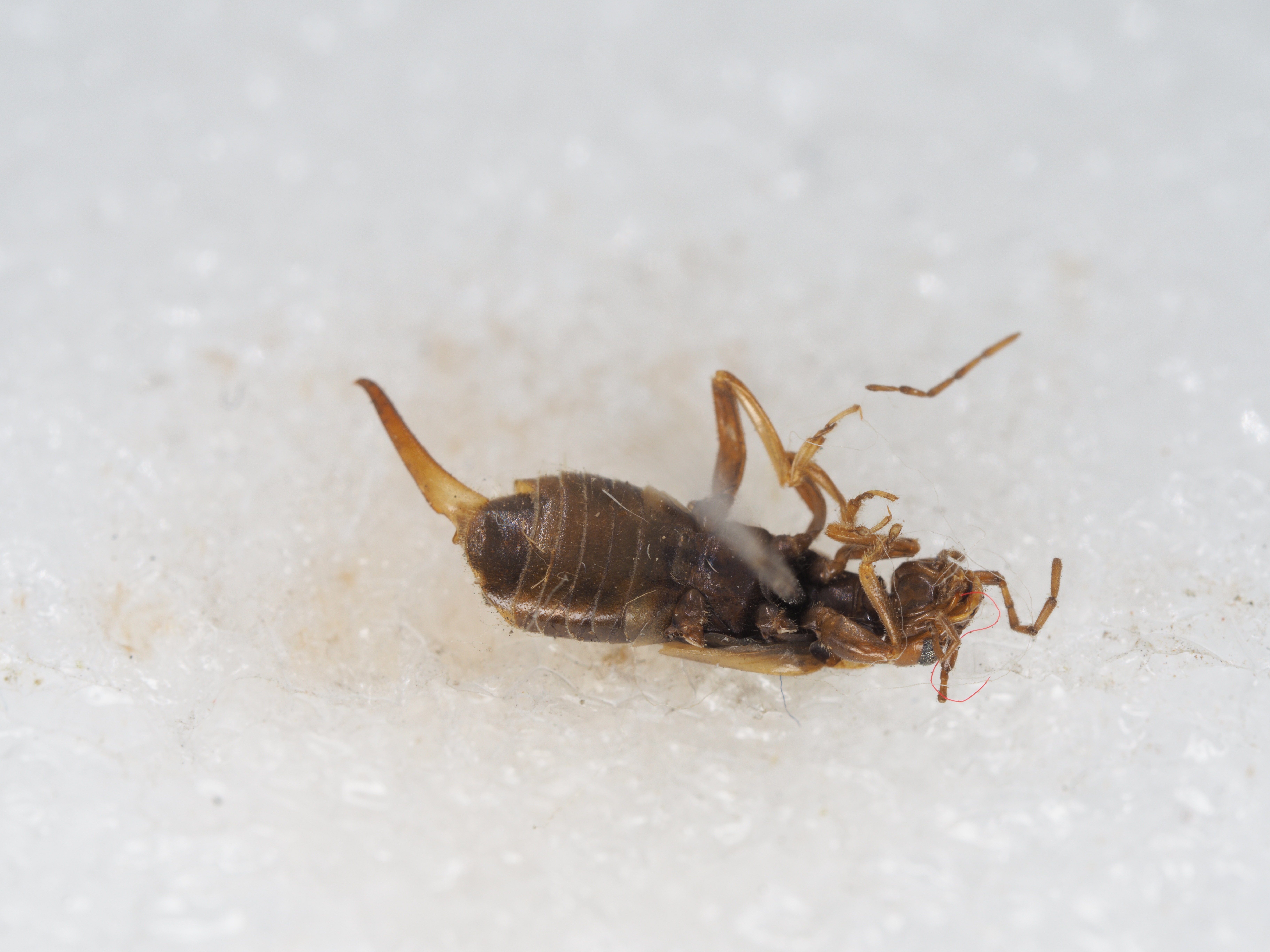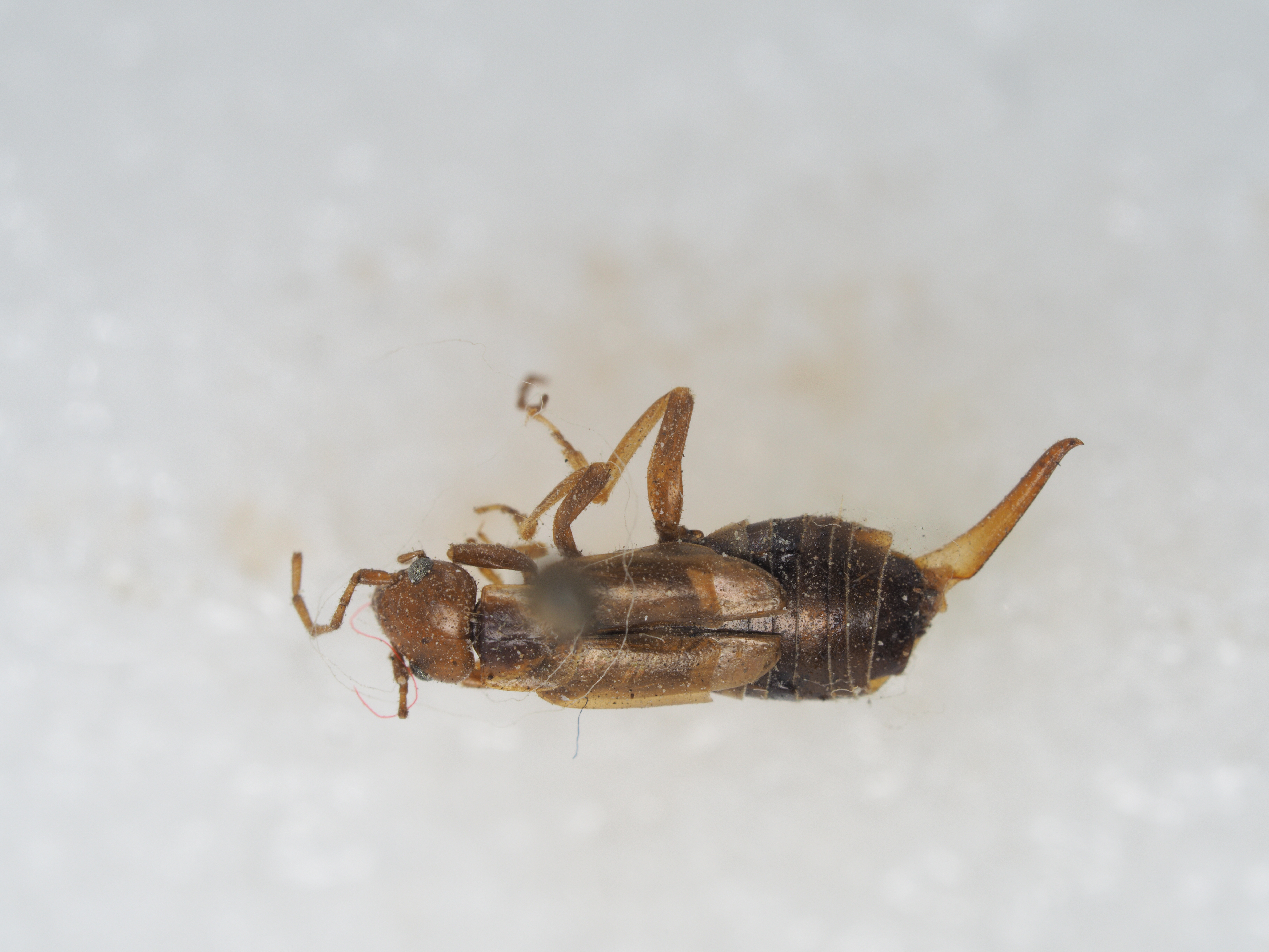 体暗黑褐色。头部暗赤褐色,前胸背板暗黑色,侧缘淡色。前翅和后翅污褐黄色。足黄褐色至褐色,尾铗黑褐色,基部黄白色。