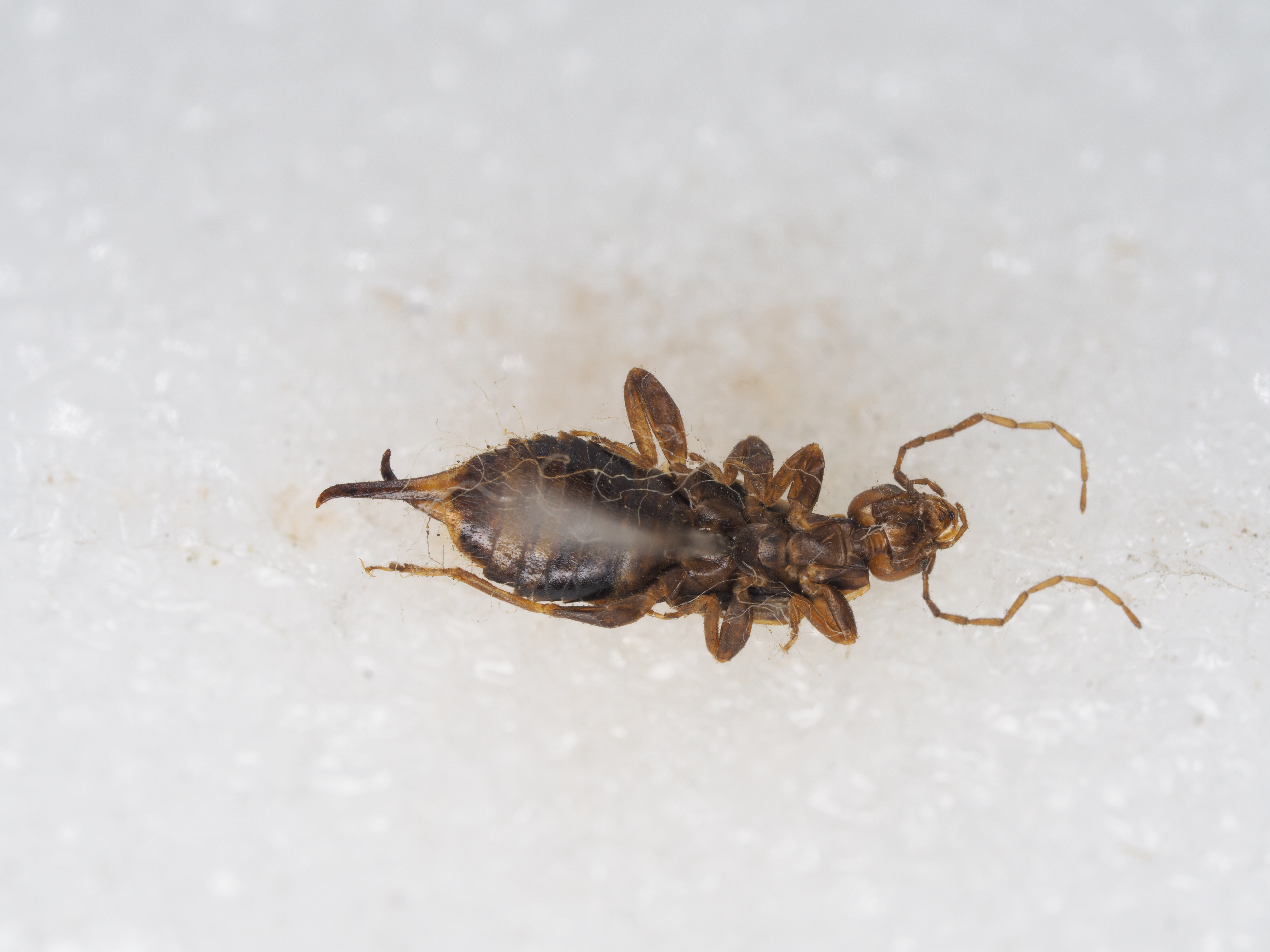 体暗黑褐色。头部暗赤褐色,前胸背板暗黑色,侧缘淡色。前翅和后翅污褐黄色。足黄褐色至褐色,尾铗黑褐色,基部黄白色。