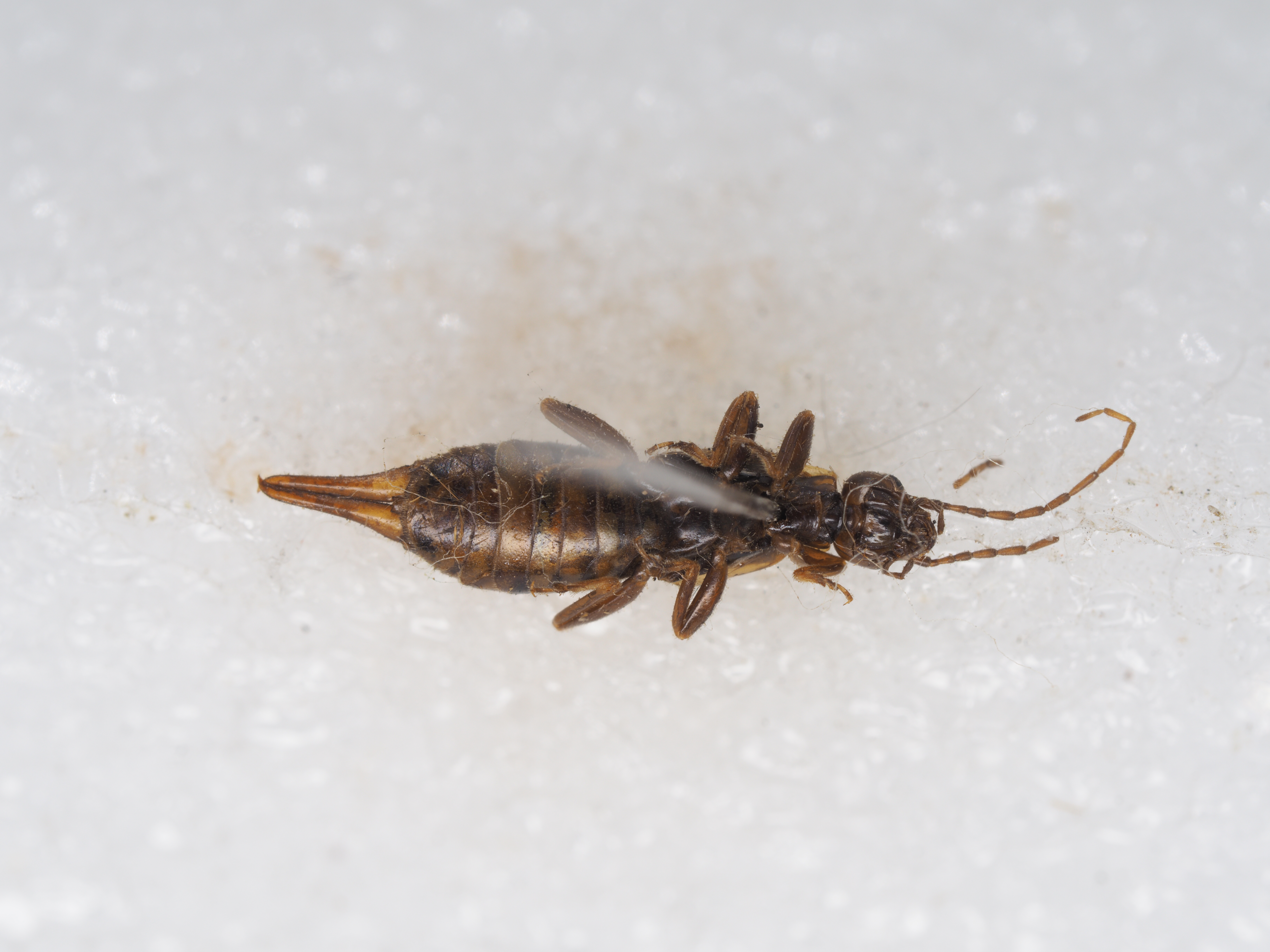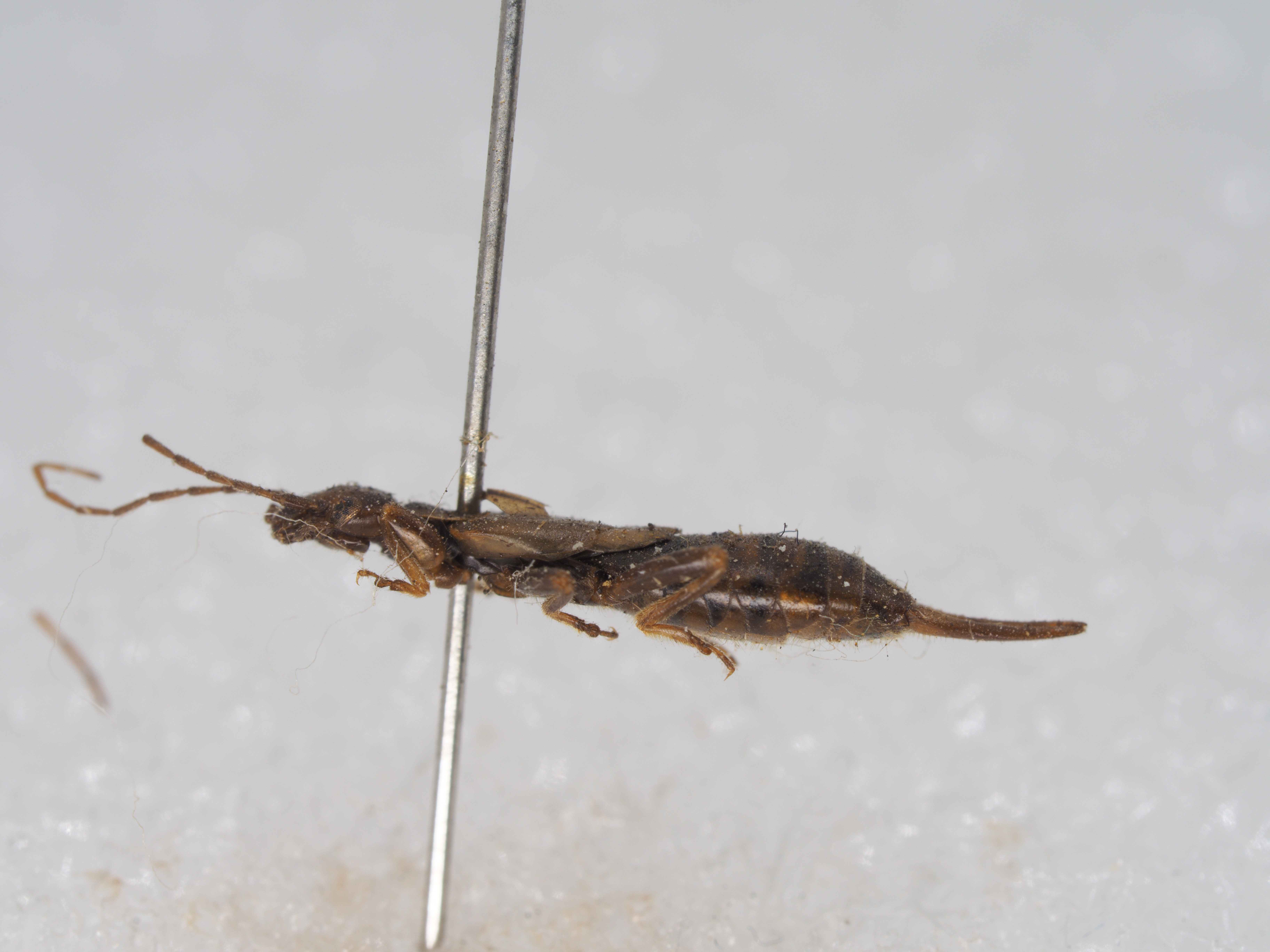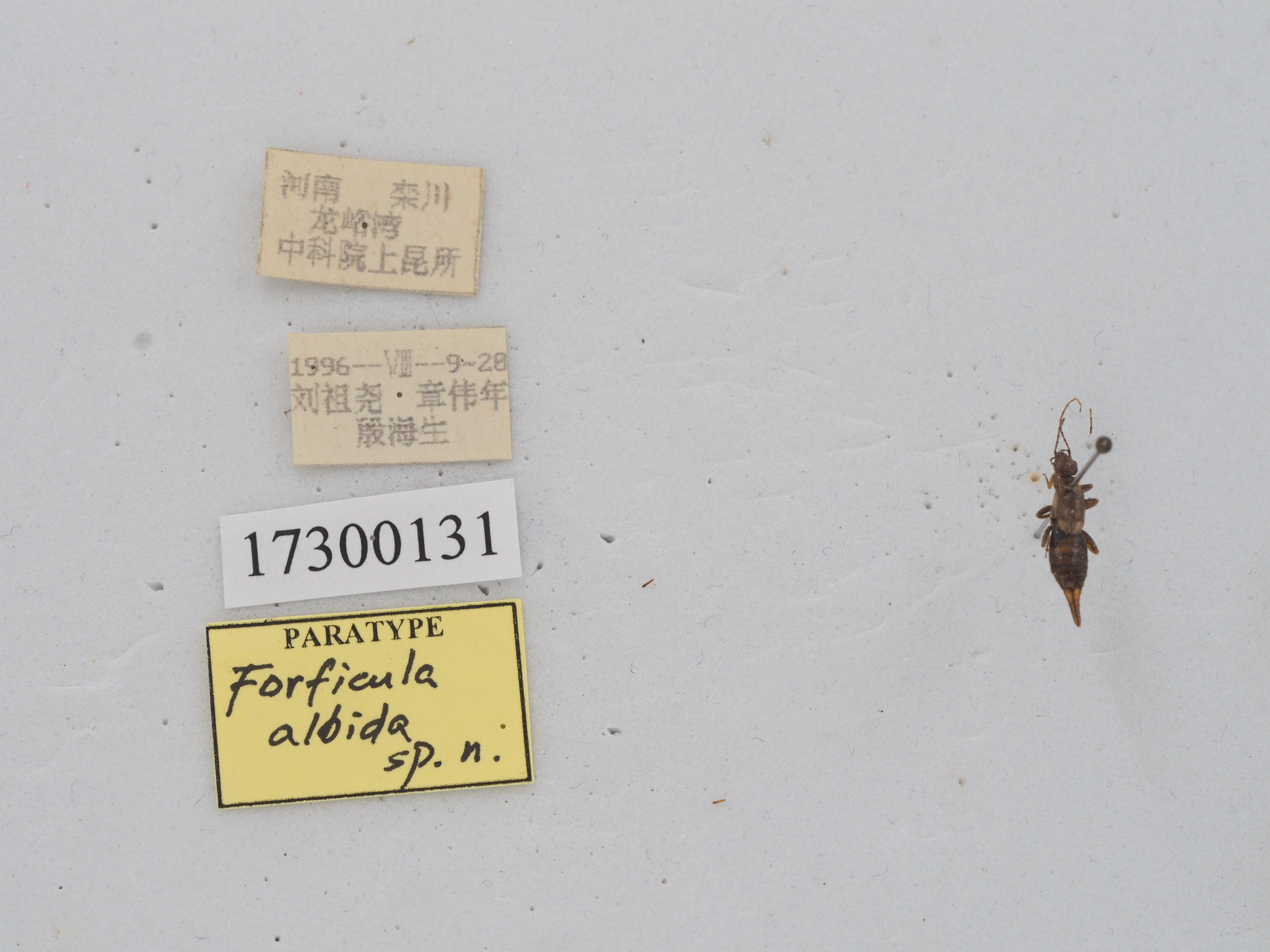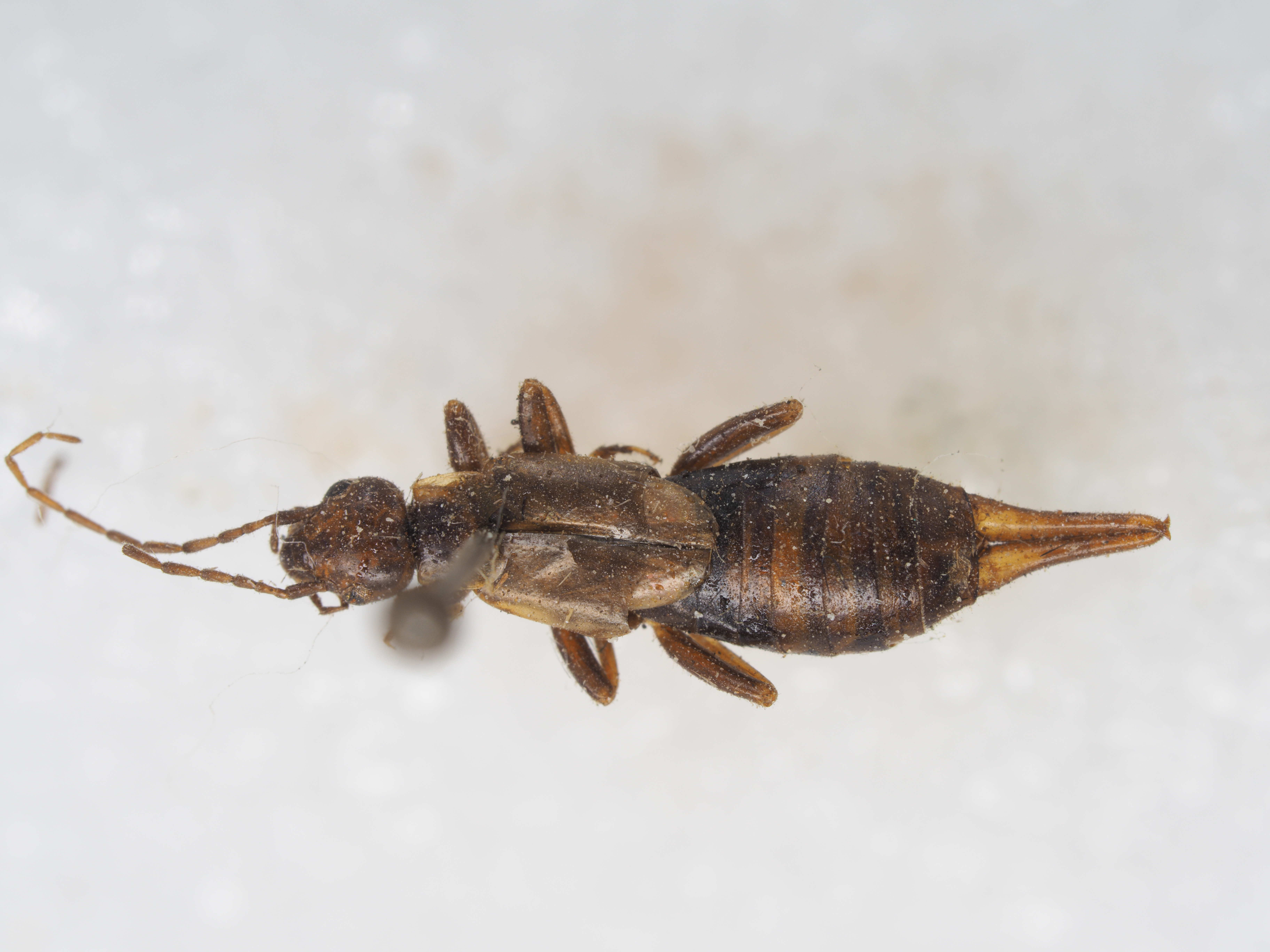 表面具极弱的刻点后翅长于前翅。足较粗壮。腹部狭长,中部稍扩宽,表面具较密的细刻点,第3、第4节两侧具腺褶。雄性第10腹节背板横宽,背面中央微凹陷,两侧具弱的隆丘肛上板突出,端部截形或微圆尾铗微内弯,基部扩宽部分约占全长的l/3(图6-8-2)端角呈钝角形(短铗型)或直角形(长铗型),内缘齿不明显阳基端叶较长。雌性尾铗较直,几乎毗连,内缘缺细齿(图6-8-4))