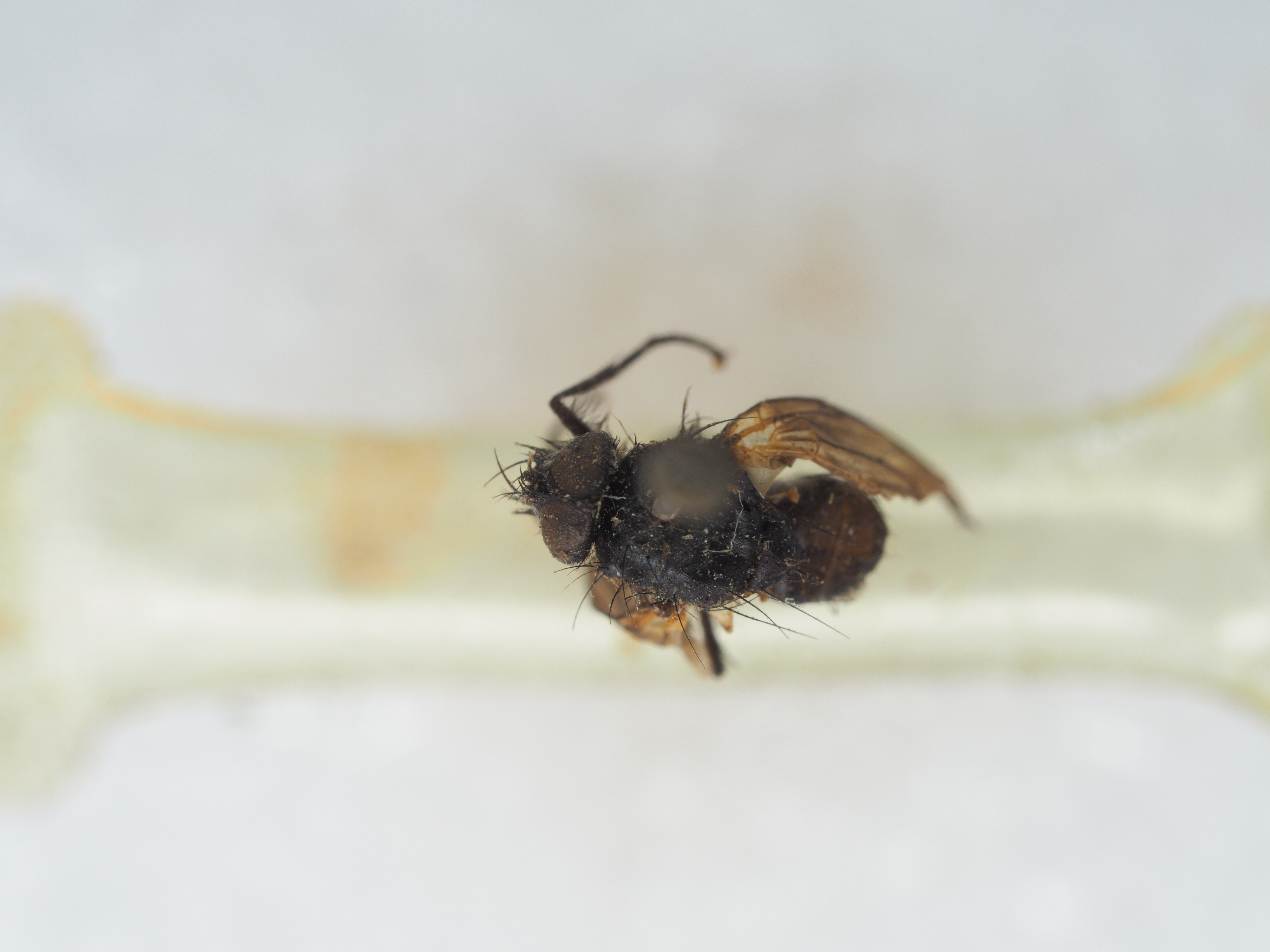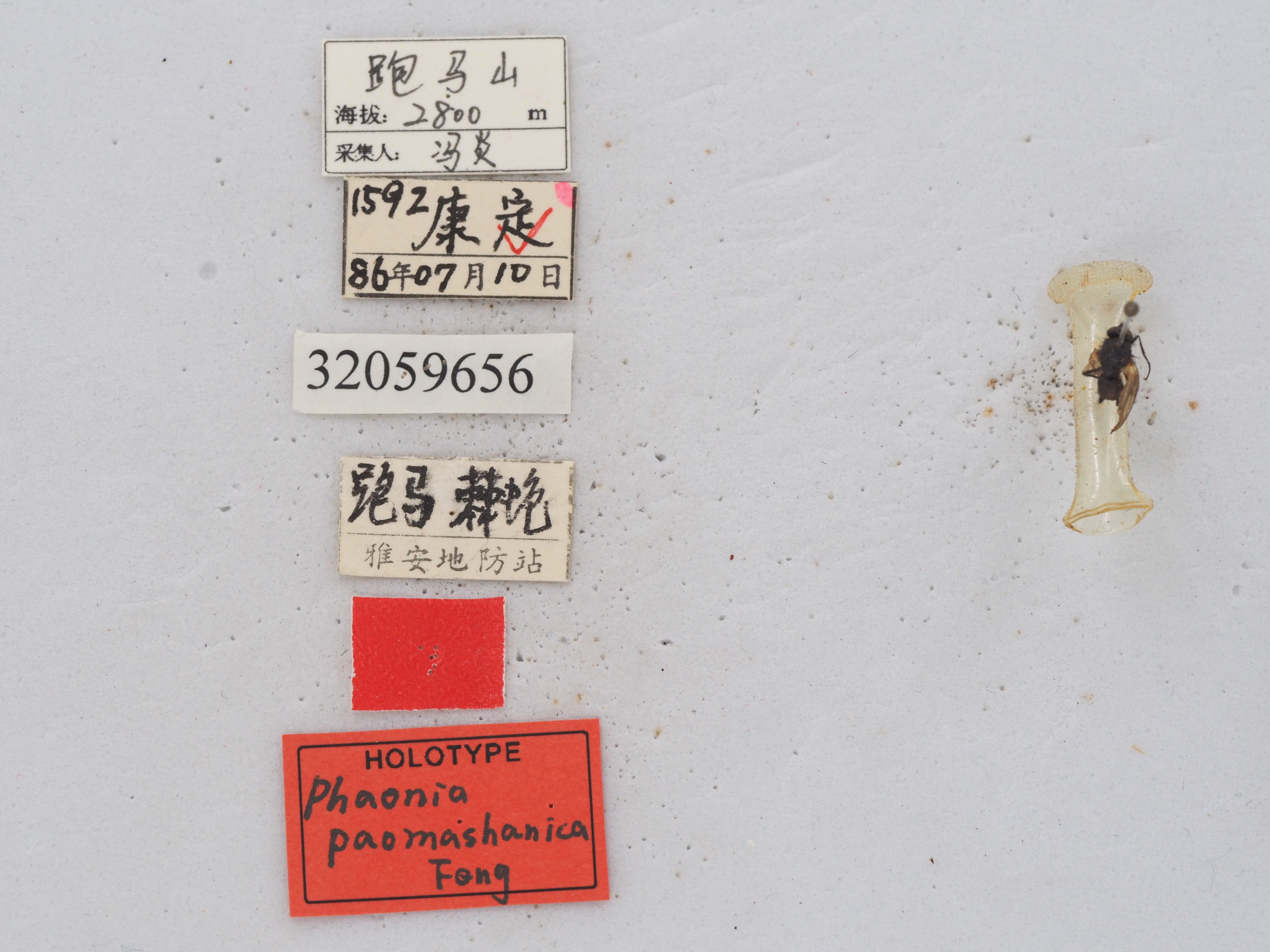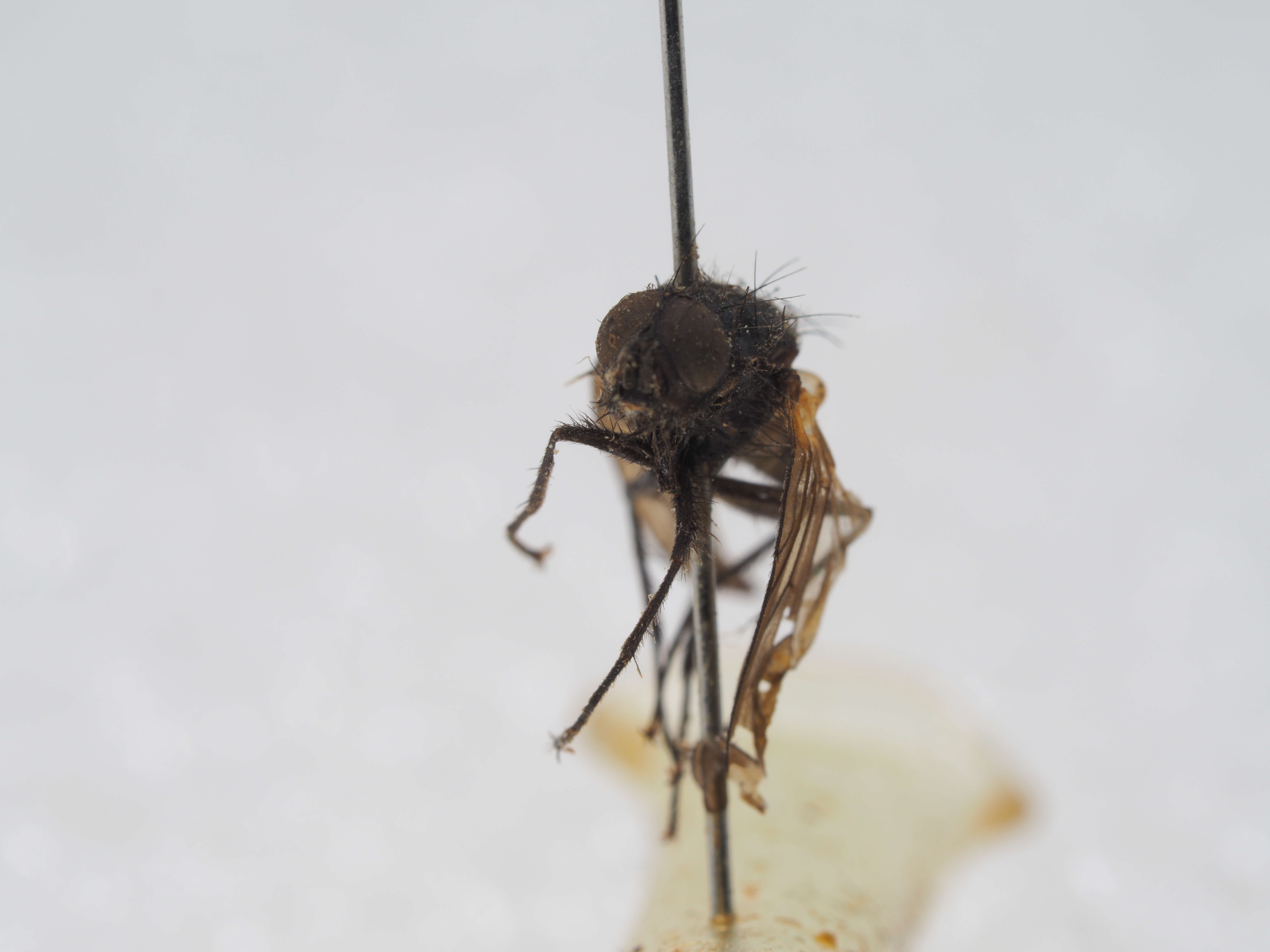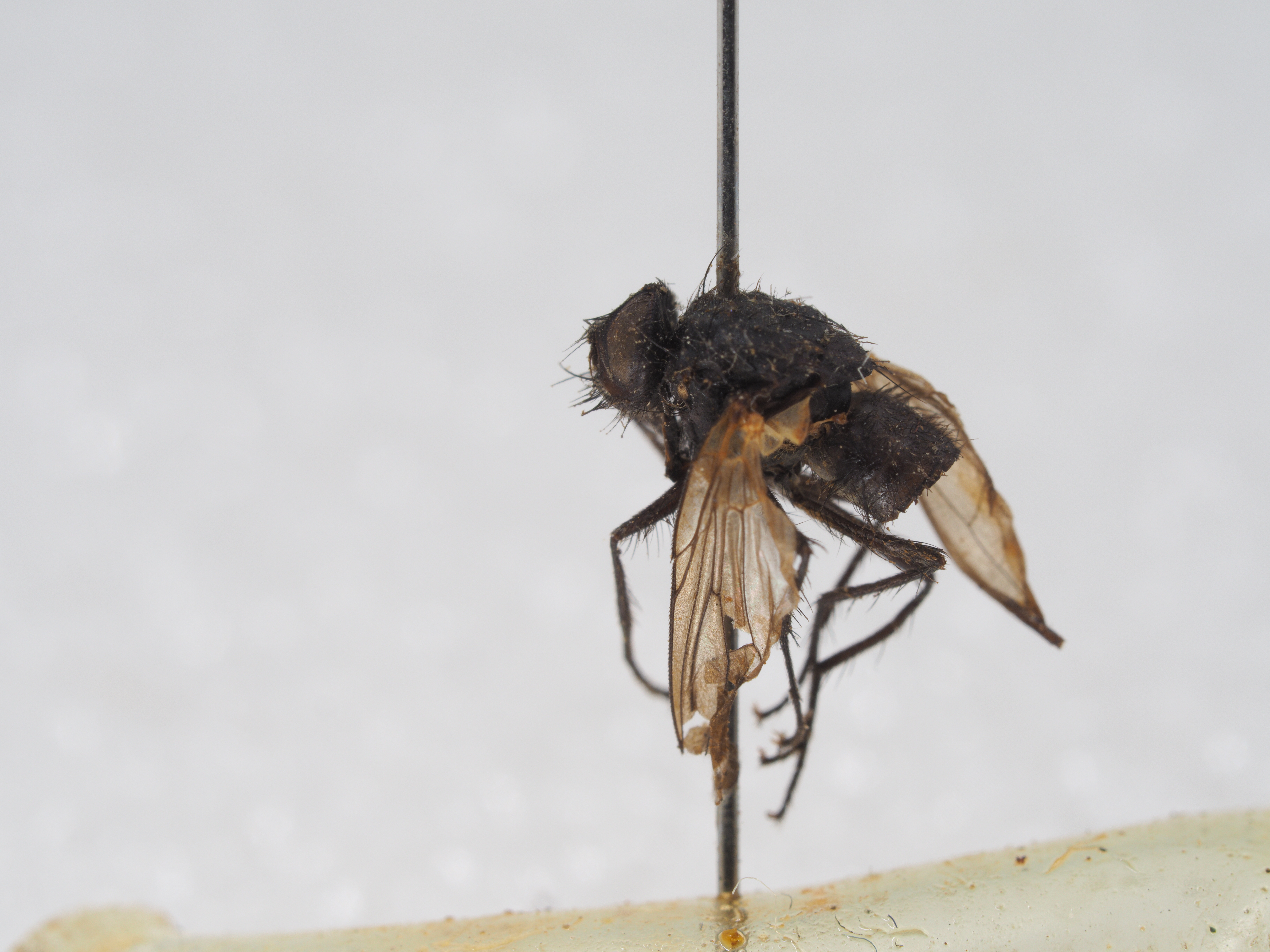 描述:雄:体长6 .0mm , 体足均黑。眼具密长毛;额约等于前单眼宽;下眶鬃7 ;侧颜为触角第3节的1 .2 倍宽;触角黑, 第3 节长为宽的2 .5 倍, 芒长羽状;中颜板凹入, 上部无颜脊;口前缘略突出于额前缘;下颚须黑而细长;前颏长为高3 倍;颊毛及下后头毛黑, 颊部为眼1/4 高。胸部具薄粉被, 无斑条;前盾片中部具小毛12 列;中鬃0 +1 , 背中鬃2 +4 , 翅内鬃0 +2 , 翅前鬃为后背侧片鬃2 倍长;小盾片背中线短于小盾沟长, 缘鬃4 , 缘鬃外侧无小毛, 侧、腹面裸;背侧片及后气门前肋具毛;前胸基腹片、翅侧片及下侧片裸;气门大, 棕褐色;腹侧片鬃1 :2 。翅烟褐色, 翅肩鳞及前缘基鳞黑;径脉结节裸, r4+5与m1+2两脉在端段平行。r -m 横脉加粗,m -m 横脉几乎直;腋瓣棕黄;平衡棒红棕。足全黑, 前胫节具后鬃2 ;中股仅基半具前腹鬃1 列(弱), 后腹鬃6 根(长大), 在后腹鬃列的外上方具后鬃1 列, 中径具后鬃及后腹鬃各3 ;后股具前腹、前背鬃各1 列, 基部具几根毛状后腹鬃;后胫具前腹鬃3 , 前背鬃2 , 后背鬃1 , 另在亚基位具前背、后背鬃各1 。腹部具青灰粉被, 第3 、4 背板具黑条, 无侧斑, 第4 、5 背板各具1 列后缘鬃和心鬃, 第6 背板及第1 腹板裸。雌:不详。