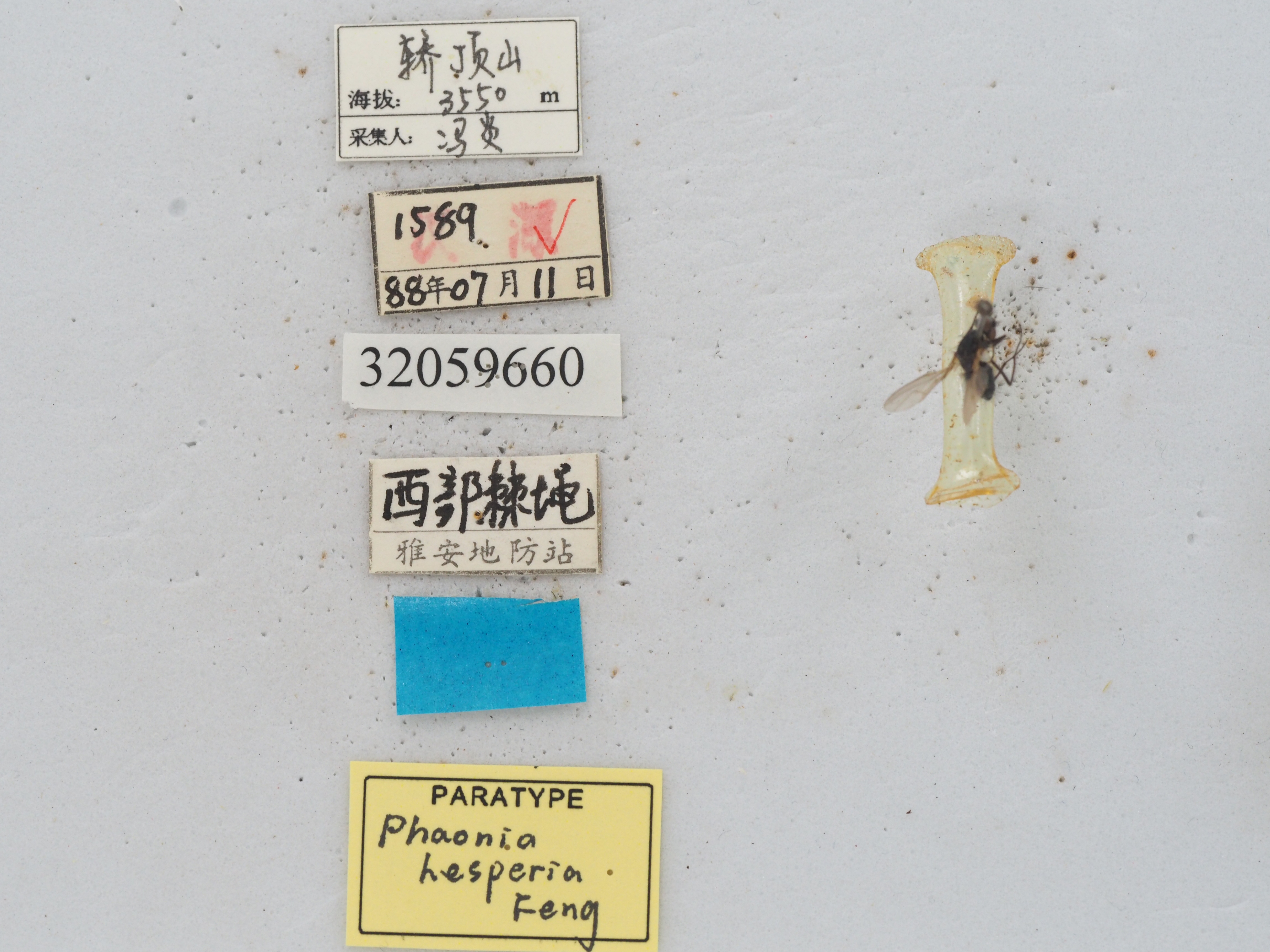 描述:雄:体长6.0 -7.0mm , 体足全黑。眼具密长毛;额为前单眼2 倍宽或稍狭, 间额消失;在侧额全长度内具下眶鬃11 -13 ;侧颜为触角第3 节宽的1 .2 倍;触角黑, 第3 节中段细缢, 其长为宽的2 .5 倍, 亦为第2 节长的2 倍, 芒长羽状;中颜板凹入, 上部具低平颜脊;口前缘突出于额前缘或相齐;颊毛及下后头毛黑, 口缘鬃4 列;颊部为眼的1/3 高, 下颚须黑, 棍棒状;前颏长为高3 倍。胸黑, 具青灰粉被和4 宽黑条, 后者中间1 对达小盾沟;前盾片中部具小毛8 列;中鬃0 +1 , 背中鬃2 +4 , 翅内鬃0 +2 , 翅前鬃为后背侧片鬃长的2 倍;小盾片黑, 背中线略短于小盾沟长, 缘鬃2 , 缘鬃外侧具小毛1 列, 侧、腹面裸;气门大, 黑褐色;背侧片及后气门前肋具毛;前胸基腹片、翅侧片、下侧片及后胸侧板前区均裸;腹侧片鬃1 :2 。翅棕黄, 翅肩鳞及前缘基鳞黑褐;径脉结节裸, r4+5与m1 +2两脉在翅缘背离, m -m 横脉微弯, 腋瓣污白;平衡棒淡红棕。足全黑;前胫具后鬃2 , 其长度为该胫节的1/2 长;中股具细而短的前腹、后腹鬃各1列, 在后腹鬃列的紧外上方具后鬃1 列, 该鬃列仅端半部5 -6 根长大;中胫具后鬃和后腹鬃各2 , 亚端位具后背鬃1 ;后股具前腹、前背鬃各1 列, 前者仅端半6 根长大;后胫微弯, 具前腹鬃7-8 , 前背鬃1 列(仅中段2 根长大), 后背鬃1 , 另在亚基位具前背、后背鬃各1 。腹黑, 具浓青灰粉被, 第3 、4 背板具窄纵条。无侧斑, 第4 、5 背板具后缘鬃, 后者具2 列心鬃;第6 背板及第1 腹板裸;第5 腹板侧叶内缘棕黄。雌:不详。