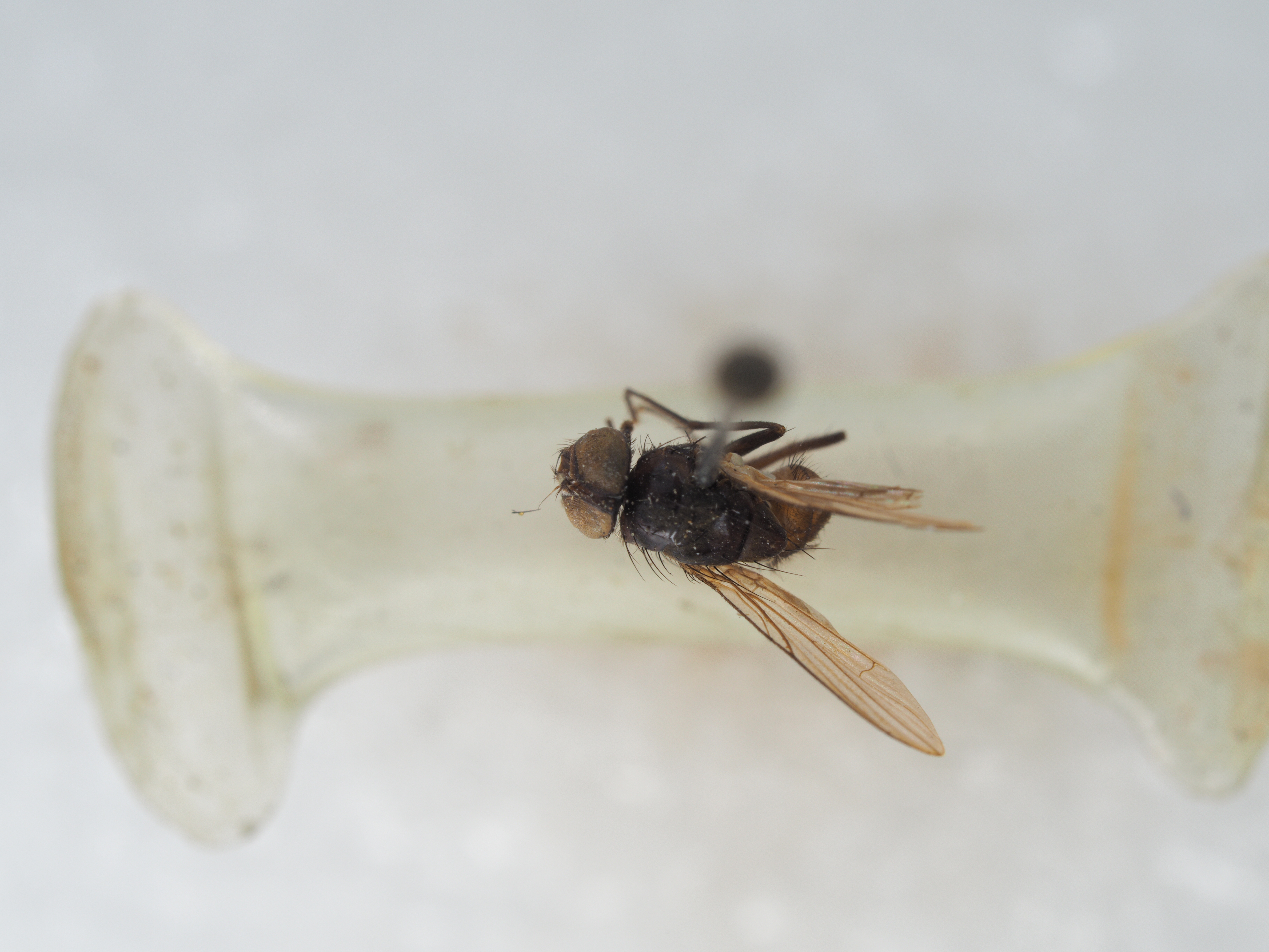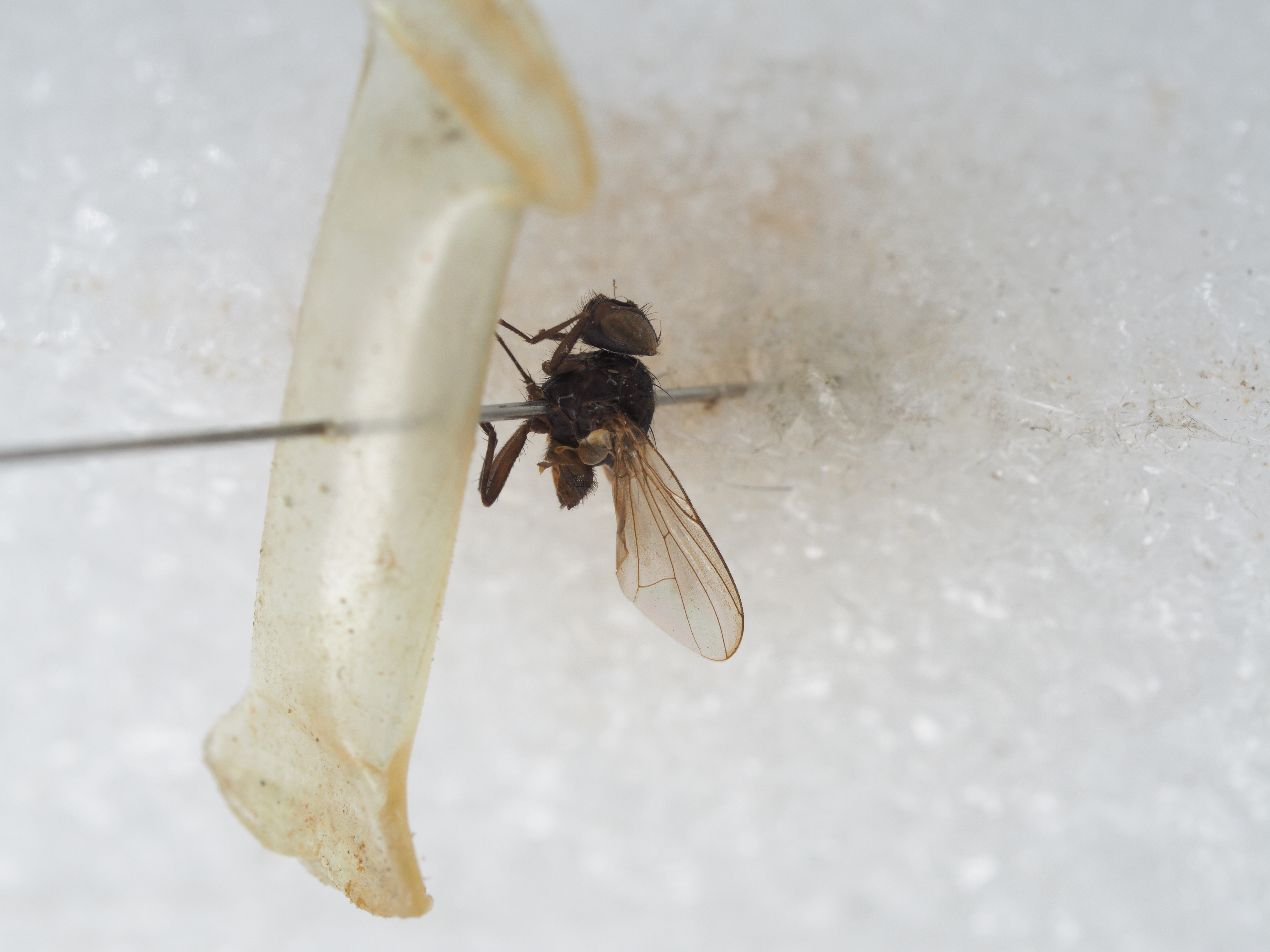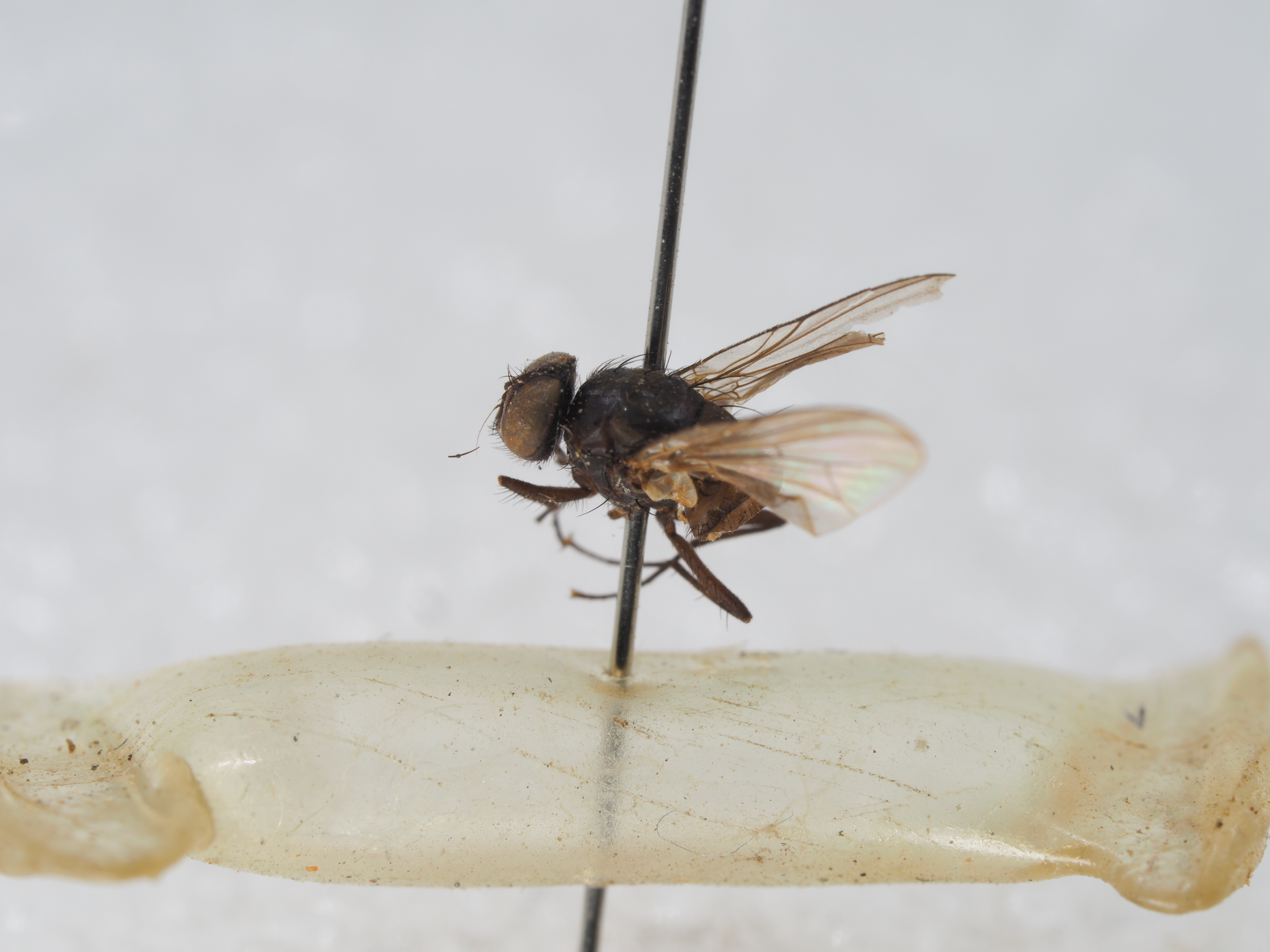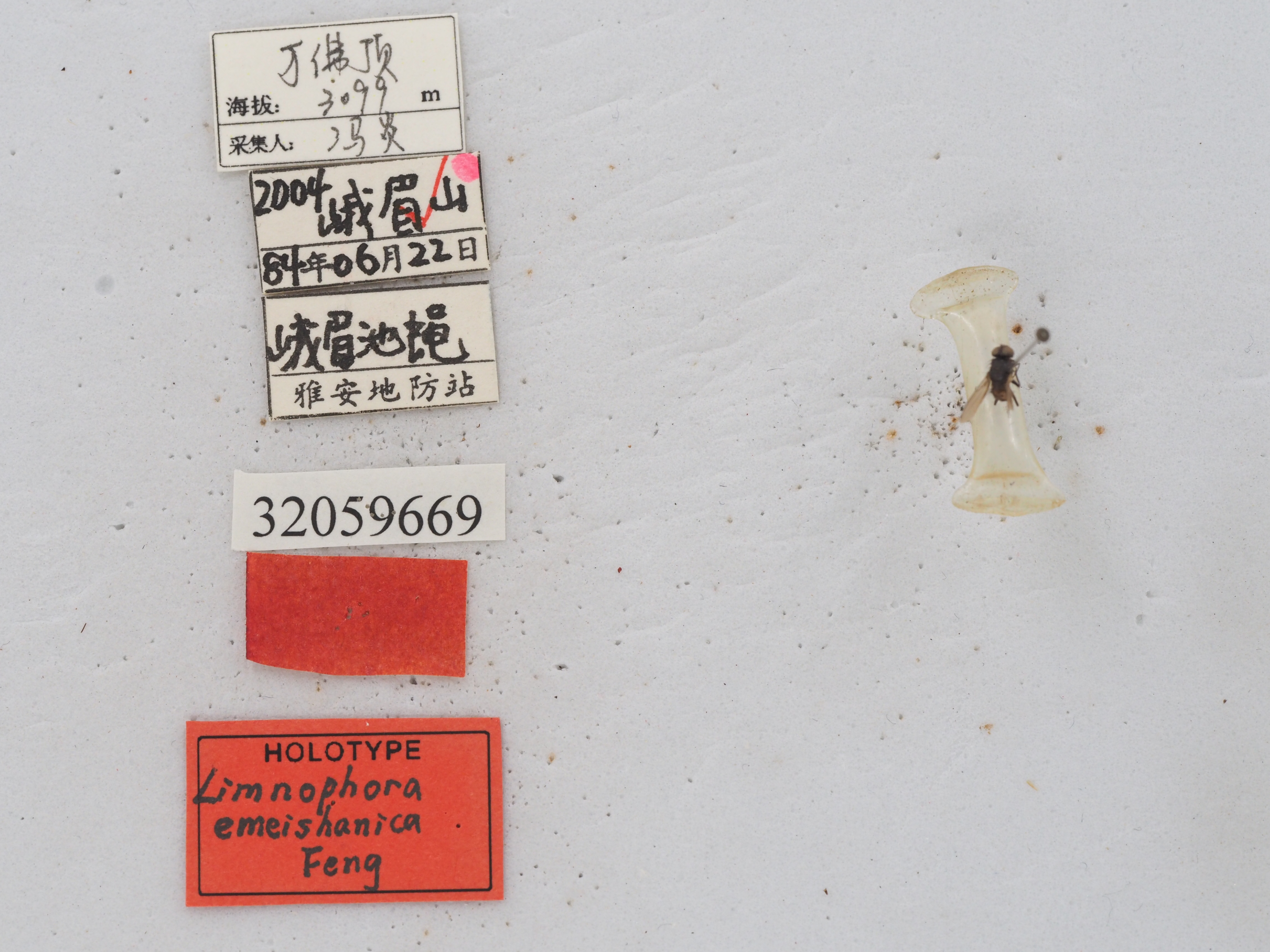 描述:雄:体长5. 0mm。眼裸;头的上半部略偏;额为头的1 /10宽, 亦略宽于触角第3节;间额宽略窄于触角第3节;额鬃5;侧颜略狭于触角第3节宽;触角除第3节末端略带黄色外均暗, 第3节长为宽2. 5倍, 芒具毳毛;中颜板微凹, 上部具狭而低的颜脊;口前缘不突出;颊毛及下后头毛黑, 颊部往前去变狭, 因而使下侧颜变宽, 颊为眼的1 /8高;下颚须黑, 细长;前颏长为高4倍, 喙齿明显。胸暗, 胸背几乎无粉被, 各侧板具浓灰白粉被;前盾片沿背中鬃具黑条, 正中及两侧具黄褐色条;后盾片具倒“山”字形黄褐色大形斑, 其余部分黑;中鬃0 +1, 背中鬃2 +3, 翅内鬃0 +1, 翅前鬃毛状;前胸基腹片具毛;前胸侧板中央凹陷、背侧片、翅侧片及下侧片均裸;小盾片暗, 背面除端部2 /3正中具1黑斑外, 其余均为黄褐色;缘鬃2, 心鬃不明显, 侧面及腹面裸;气门小, 黄白色, 后气门洞开;腹侧片鬃1∶2。翅肩鳞及前缘基鳞黑, 径脉结节背、腹面具毛, m1 +2脉端段直, m -m 横脉几乎直;腋瓣包括缘缨在内淡棕色, 半透明;平衡棒黄白色。各足暗色稍微发黄;前径无后鬃, 端位背端鬃1, 其长度约等于该胫粗, 无端位后腹鬃;中股基半具前背鬃1列, 基部1 /5具前腹鬃2;中胫具后鬃2;后足基节后面裸;后股端1 /3具前腹鬃2, 基2 /3具前背鬃1列;后胫具前腹、前背鬃各1。腹暗, 短梯形, 具浓灰白粉被;第3、4背板各具1对三角形黑斑, 第5背板在后部1 /3处具1对痕迹状的斑, 第6背板裸, 第7、8合腹节具1列后缘鬃;第1腹板裸, 第5腹板略呈长方形;雄阳茎端阳体向上钩曲。雌:未知。