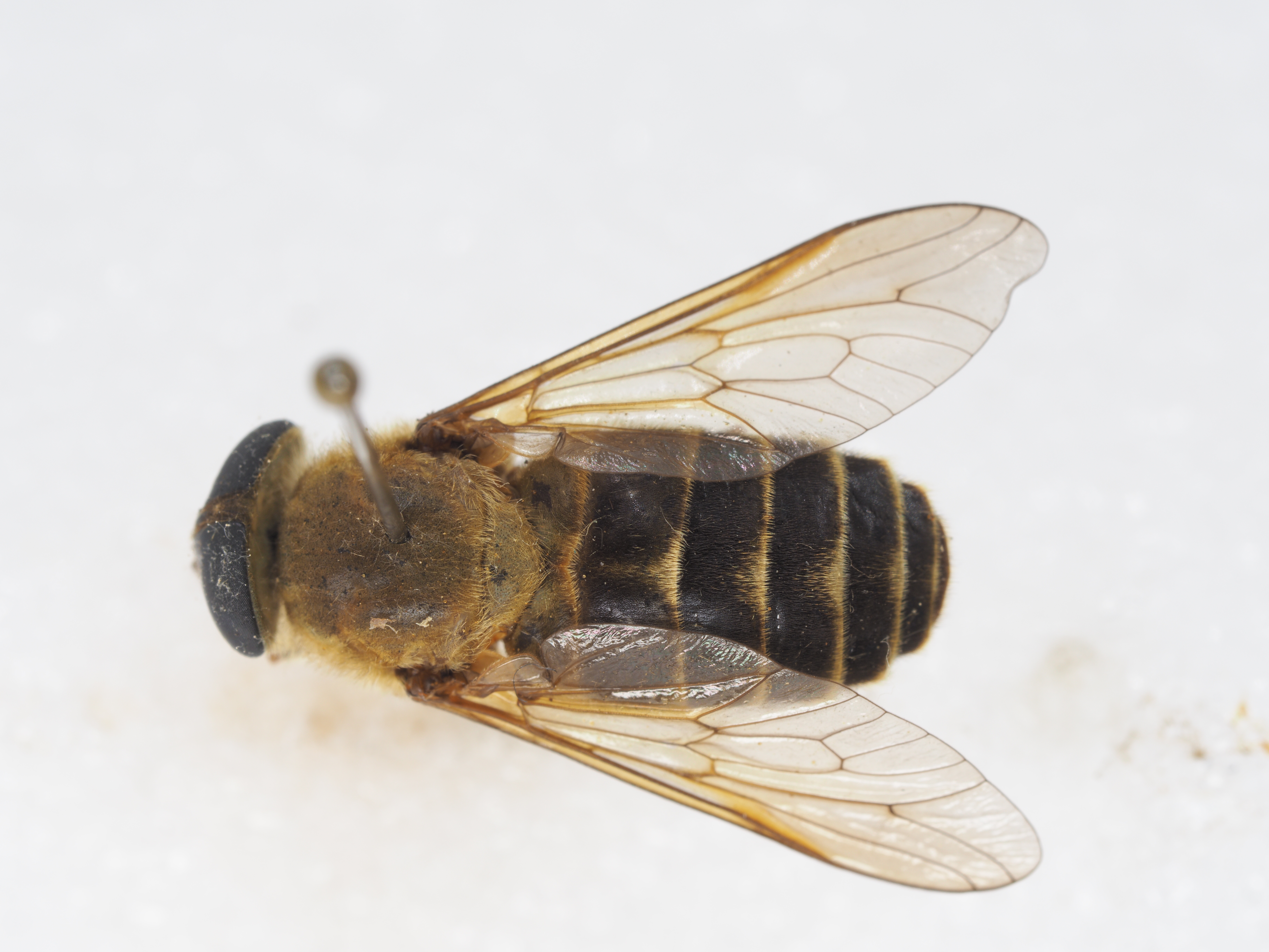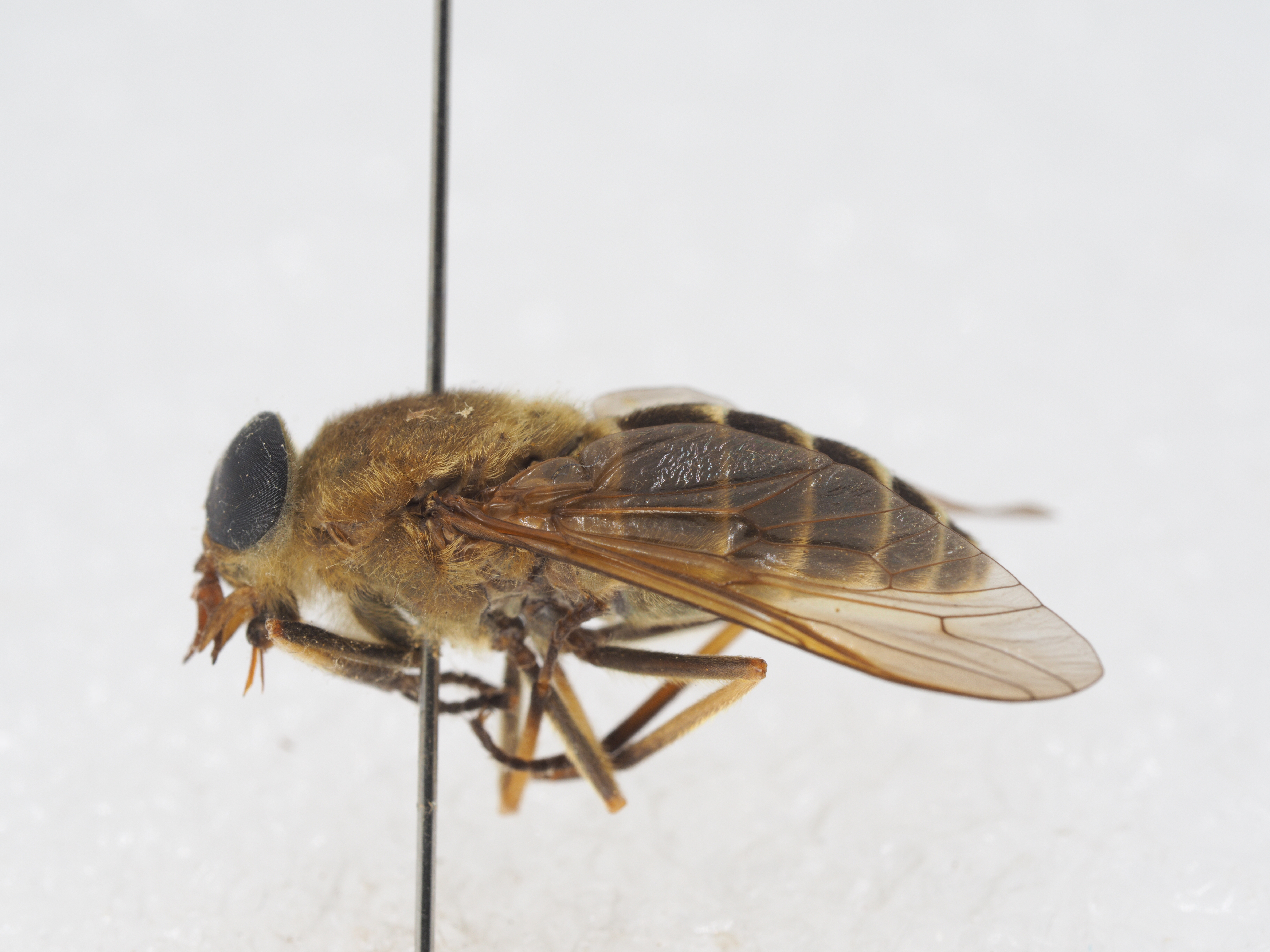 头部:眼光裸有3条紫色带;额暗棕色,高度约为基部宽度的6.5倍,顶 端约为基部宽1.5倍,着生黑毛和少量黄色毛。基胛黑色,近椭圆形,长 约为宽的2倍,接触亚胛,与眼分离,中胛矛状,与基胛连接处变窄,中胛两侧有一对黑色线条。亚胛暗棕色。颜和颊覆灰棕色粉被,上部与亚胛 同色,下部色较浅,着生黑色毛和黄色毛,口毛黄色。触角棕色,柄节和梗