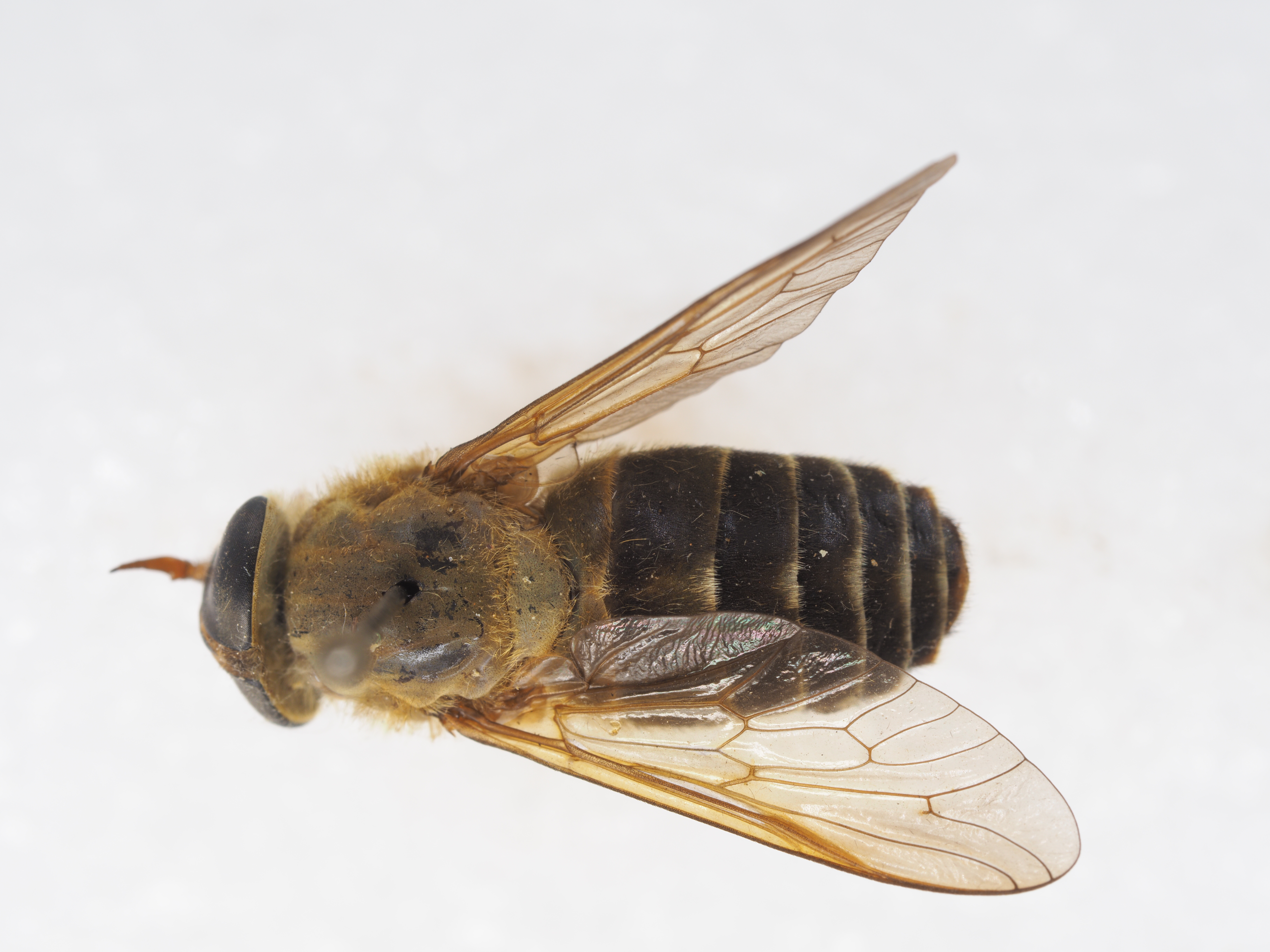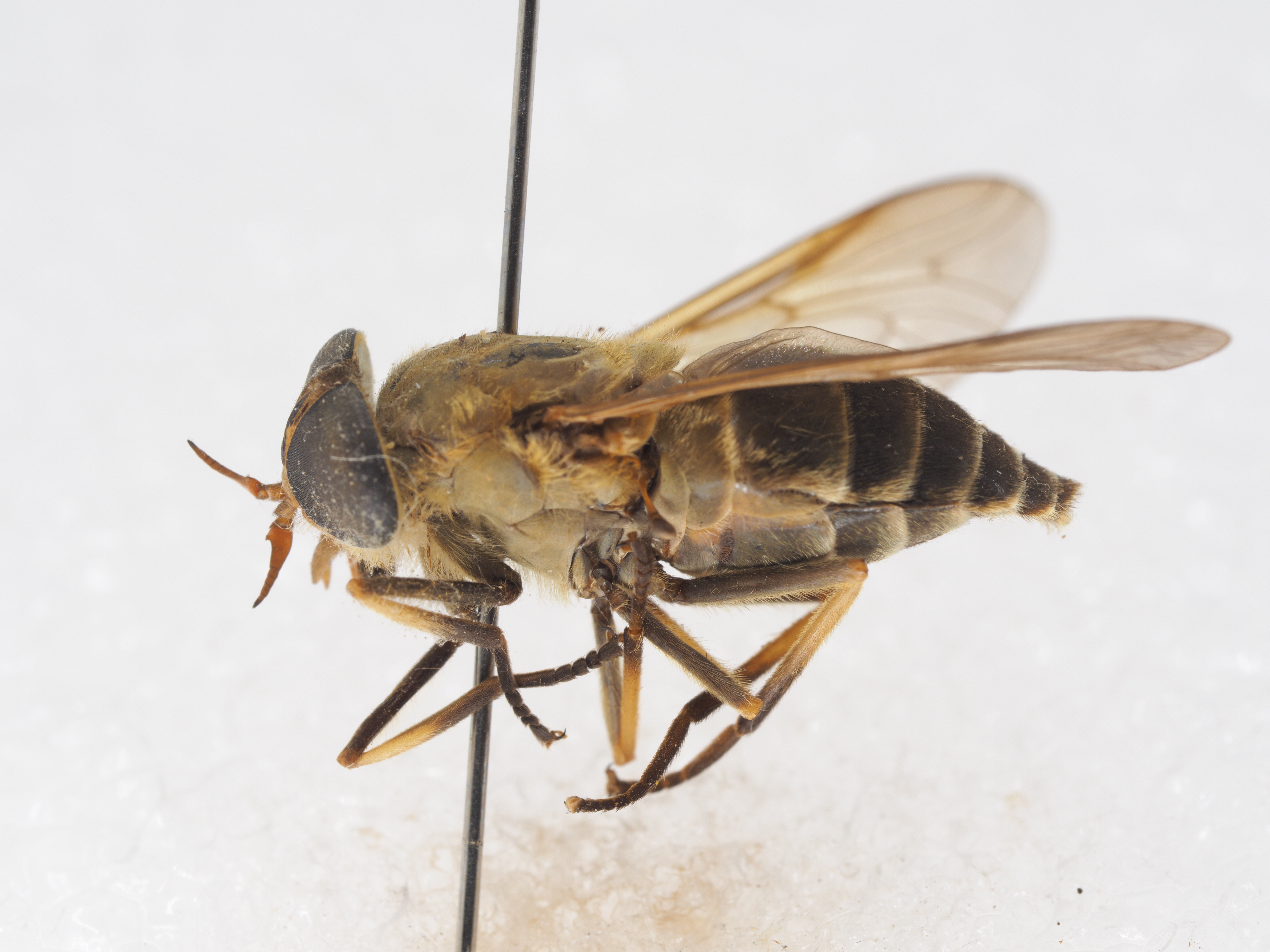 头部:眼光裸有3条紫色带;额暗棕色,高度约为基部宽度的6.5倍,顶 端约为基部宽1.5倍,着生黑毛和少量黄色毛。基胛黑色,近椭圆形,长 约为宽的2倍,接触亚胛,与眼分离,中胛矛状,与基胛连接处变窄,中胛两侧有一对黑色线条。亚胛暗棕色。颜和颊覆灰棕色粉被,上部与亚胛 同色,下部色较浅,着生黑色毛和黄色毛,口毛黄色。触角棕色,柄节和梗