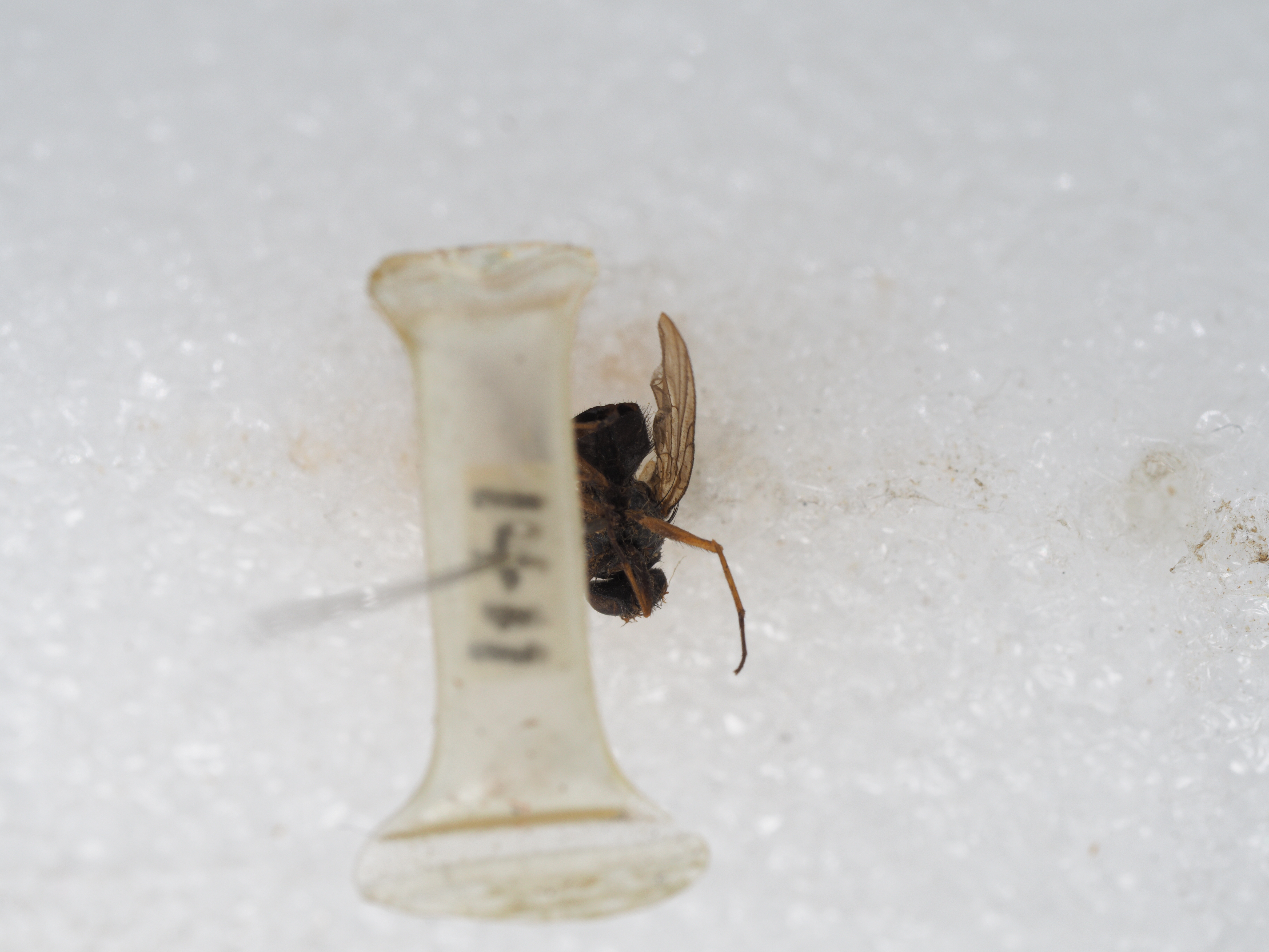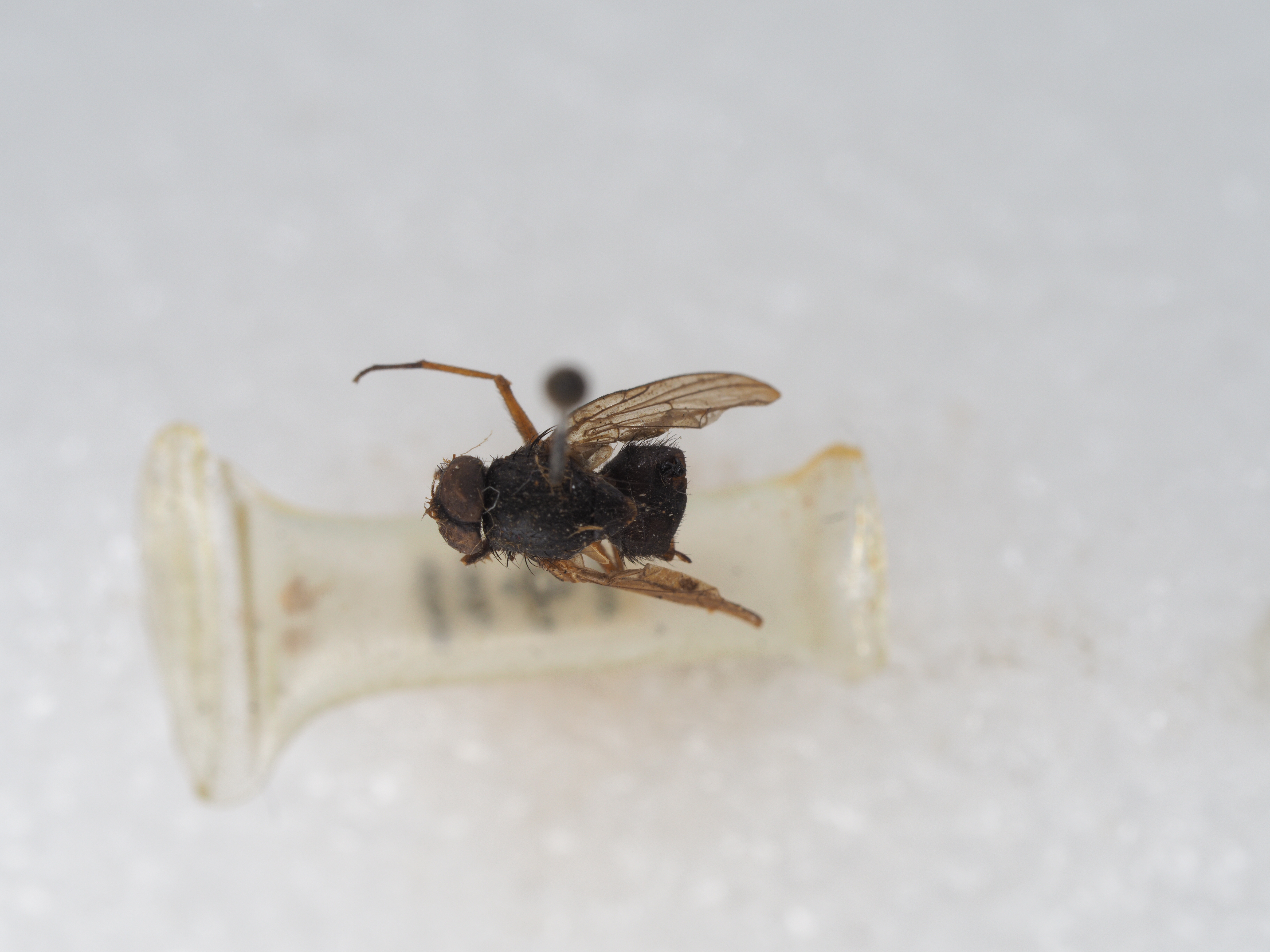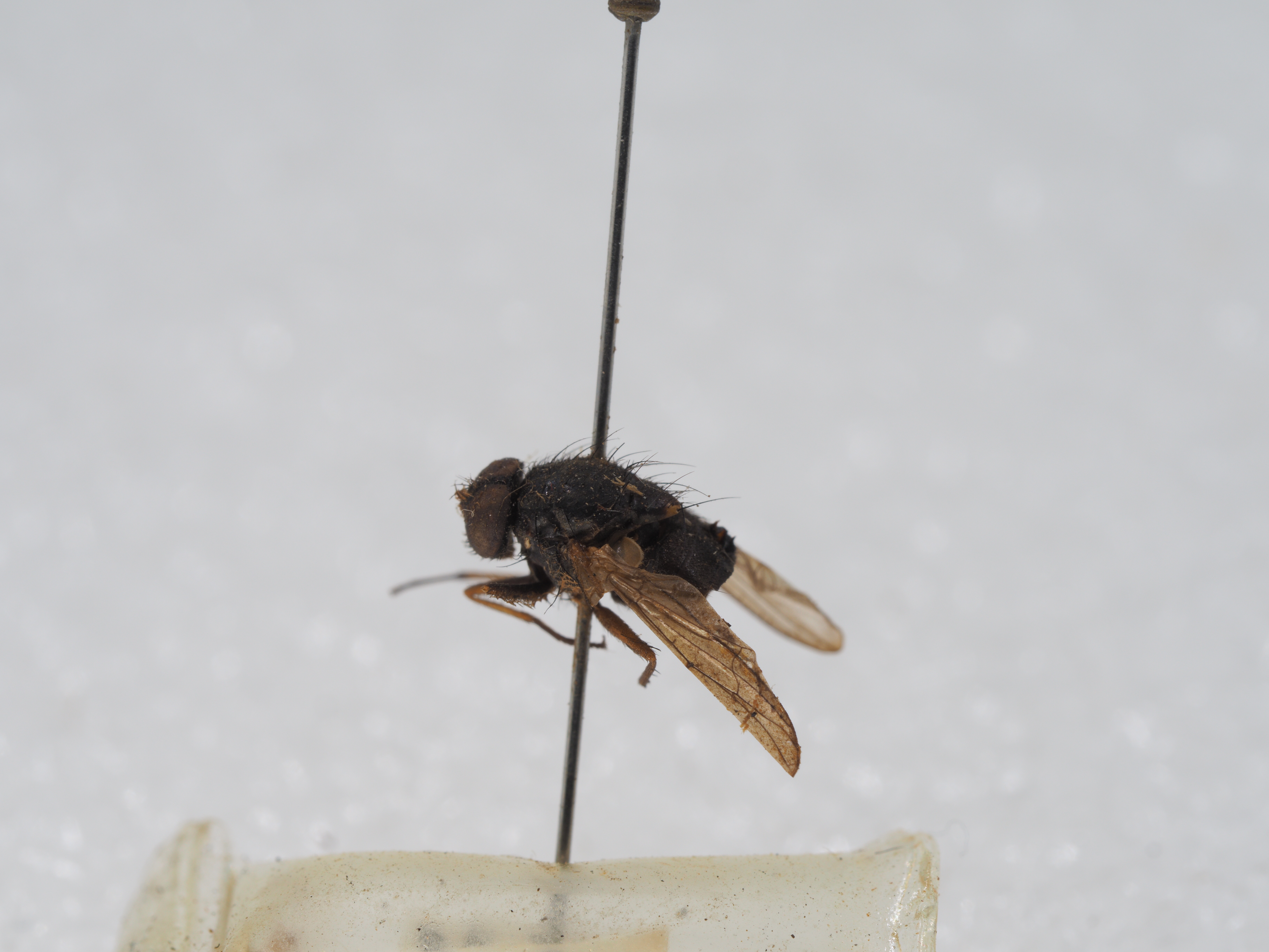 描述:雄:体长6.5mm 。复眼覆中等长密纤毛, 额约等于前单眼3 倍宽, 间额约等于前单眼宽;在侧额全长度内具下眶鬃8 , 后倾上眶鬃2 ;侧颜约等于触角第3 节的2 3 宽;触角黑, 第3 节具灰白粉被, 长为宽3 倍;芒长羽状;中颜板平,上部无颜脊;口前缘不突出;颊部黑, 为眼的1 14高;下颚须基部暗黄, 端部暗黑;前颏长约等于高。胸部底色暗, 覆灰黄粉被和具4 黑条,后者中间1 对在盾沟后几乎融合为一宽黑条, 达小盾沟;前盾片中部具小毛8 列, 中鬃0 +1 ,背中鬃2 +4 , 翅内鬃0 +2 , 翅前鬃毛状, 外后背中鬃1 ;小盾片与胸同色, 在端部的背、腹及侧面均黄, 缘鬃外侧、侧面及腹面均裸;前胸基腹片、背侧片、下侧片、后气门前肋及后胸侧板前区均裸;前气门灰黄, 后气门暗褐;腹侧片鬃1∶2 。翅肩鳞及前缘基鳞黄, 前缘刺小;r1 脉背面裸, 径脉结节背腹面具毛, m1 +2 脉端部微向上弯, m-m 横脉明显弯曲;腋瓣舌形, 棕色;平衡棒淡红棕。各足基、转节暗褐色, 前股及跗节黑色, 余均黄色;前胫无后鬃;中股具前腹、前背鬃各1 列, 均在基半部长大;中胫具后鬃2 ;后足基节后面裸;后股具前腹、前背鬃各1列;左侧的后胫端部1 4 膨大如鼓槌状, 右侧常形, 中部具前腹、前背鬃各2 。腹部与胸同色,覆浓灰黄粉被, 第3 ~ 5 背板具宽中条, 无侧斑;第6 背板及第1 腹板裸。