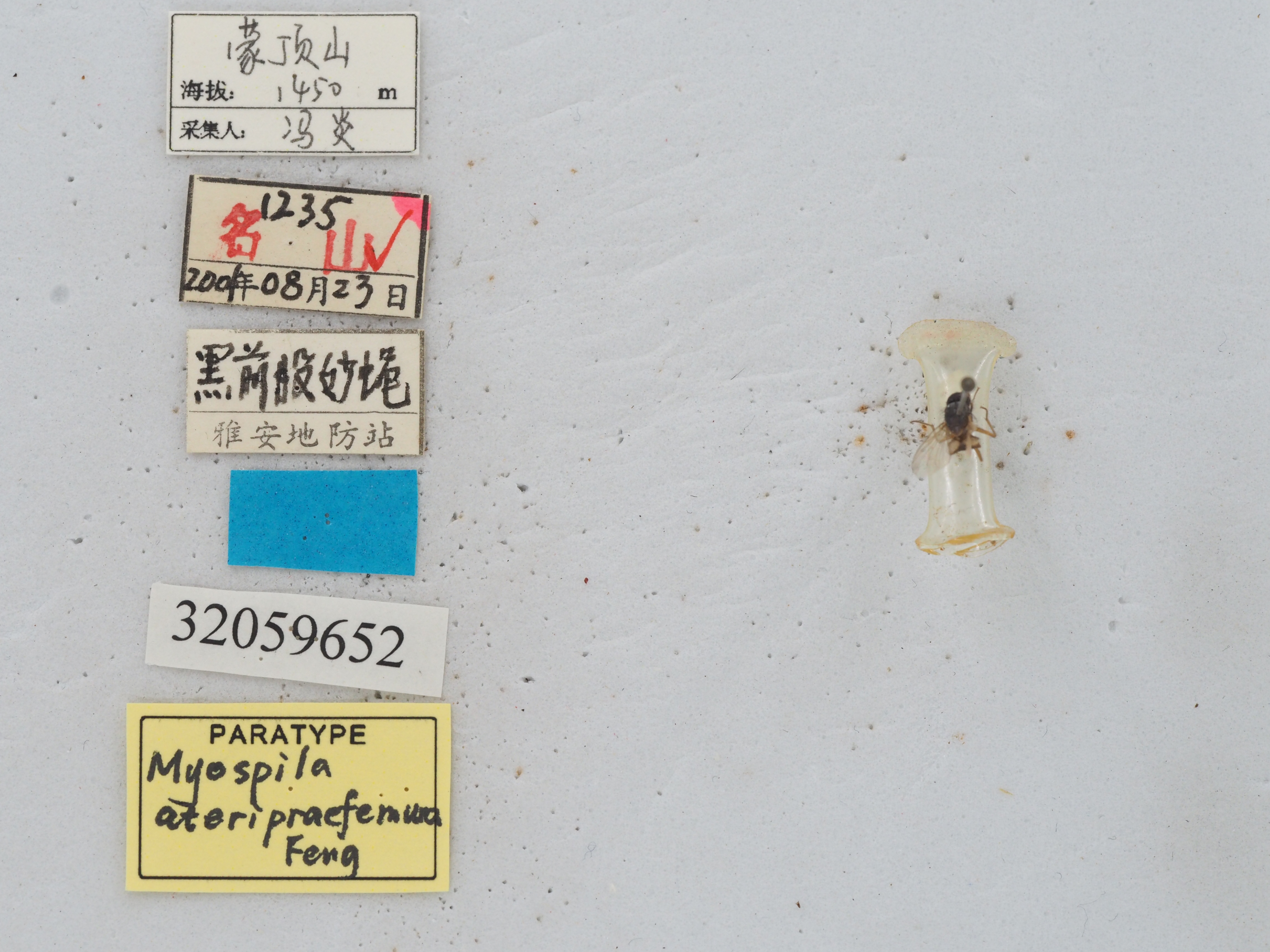 描述:雄:体长5.0mm 。眼裸;额为前单眼的2 倍宽, 间额为前单眼的1 2 宽;在侧额的下半段内具下眶鬃5 , 后倾上眶鬃1 ;侧颜为触角第3 节的1 4 宽;触角黑, 第3 节长为宽的4 倍, 芒长羽状;中颜板平, 上部具低而顶部尖锐的颜脊;口前缘不突出, 颊毛及下后头毛黑, 颊前部具口缘鬃2 列, 颊部为眼的1 15 高;下颚须黑, 端部扁;喙短。胸部黑, 覆薄灰黄粉被, 盾片具4黑条, 中间1 对达小盾沟;前盾片中部具小毛10 列, 中鬃0 +1 , 背中鬃2 +4 , 外后背中鬃1 ,翅内鬃0 +1 , 翅前鬃缺如;小盾片背面暗, 侧面及腹面黄而裸, 侧腹缘具毛;前气门灰黄, 后气门褐黄;前胸基腹片具毛, 背侧片(1 副模标本具1 根细毛)、下侧片、后气门前肋及后胸侧板前区均裸;腹侧片鬃1∶2 。翅肩鳞及前缘基鳞黄;r1 脉背面基部具毛, 径脉结节背、腹面具毛, r4+5脉背、腹面基部具毛, m1 +2脉端段微向前弯, m-m 横脉直, 腋瓣暗棕;平衡棒淡红棕。各足基节暗色, 前股亮黑, 转节、胫节及中、后股节黄色, 跗节暗黄色;前胫无后鬃;中股具稍短的前腹鬃及后腹鬃各1 列;中胫具后鬃4 ;后足基节后面裸;后股仅具前腹鬃1 列;后胫具前腹鬃1 , 前背鬃2 。腹部与胸同色, 覆浓灰黄粉被;第3 、4 背板具痕迹状半月形侧斑各1 对,第4 、5 背板具后缘鬃, 后者具1 列心鬃;第5背板后缘呈切截状;第6 背板及第1 腹板裸。雌:未采获。