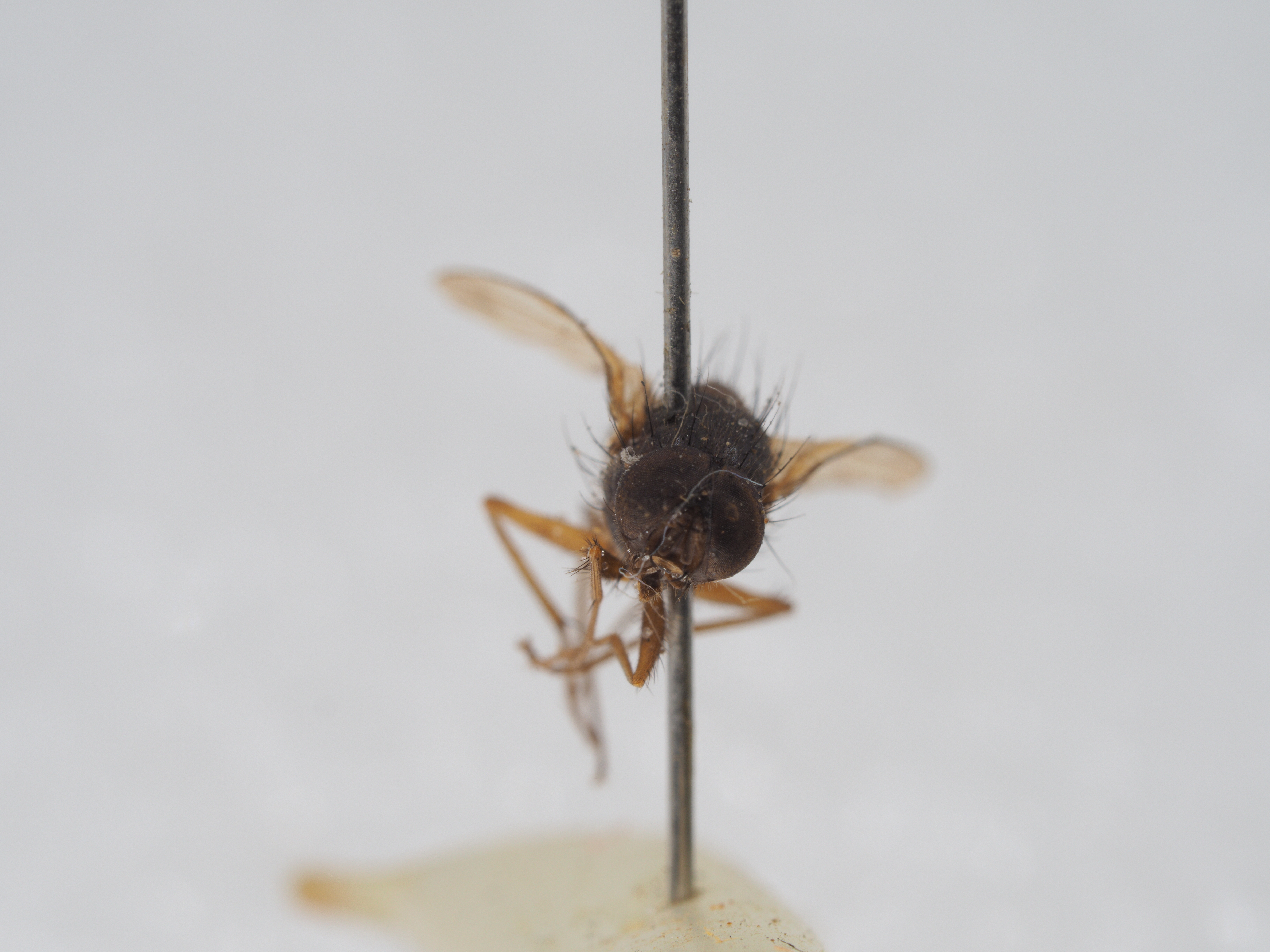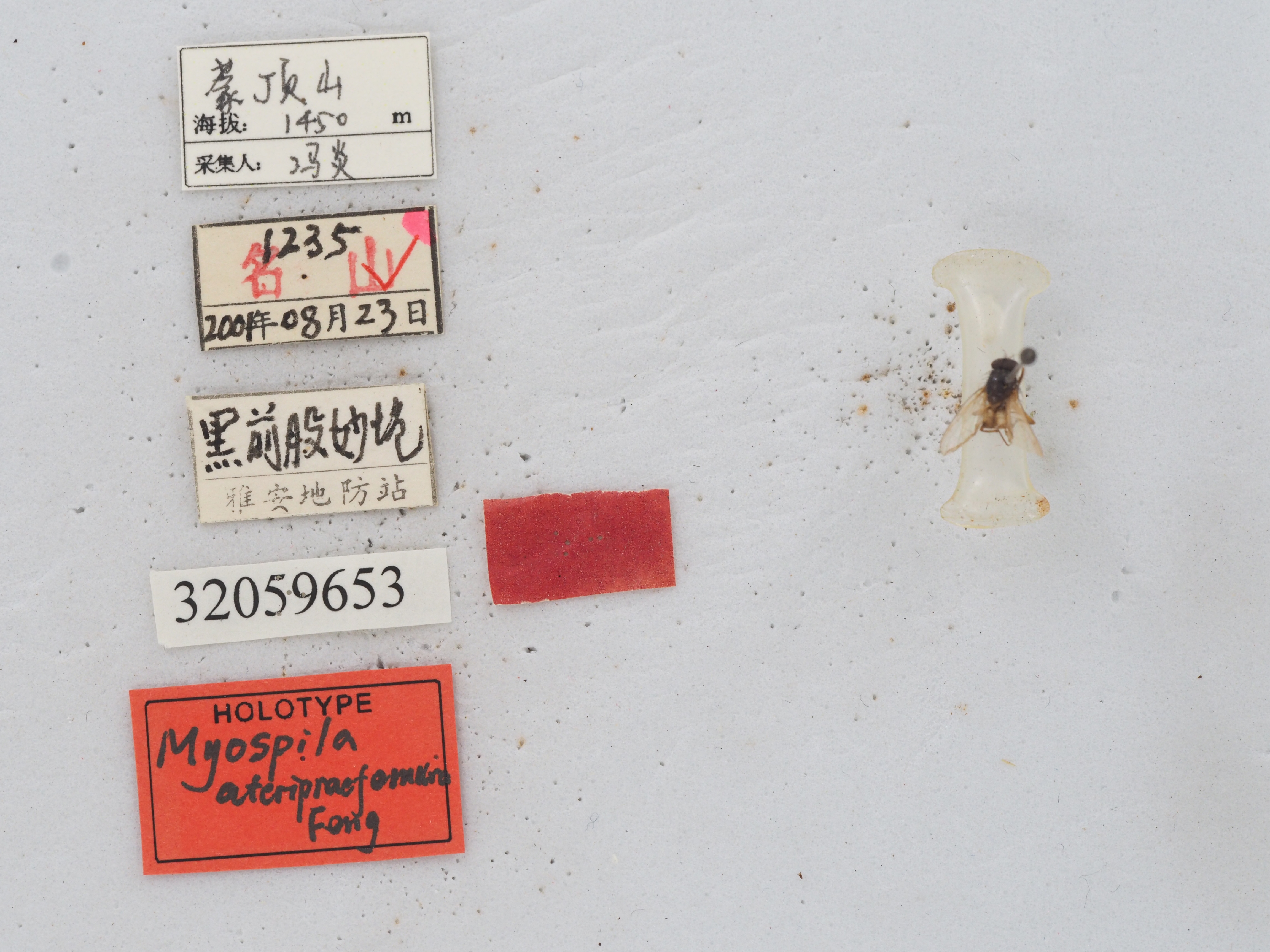 描述:雄:体长5.0mm 。眼裸;额为前单眼的2 倍宽, 间额为前单眼的1 2 宽;在侧额的下半段内具下眶鬃5 , 后倾上眶鬃1 ;侧颜为触角第3 节的1 4 宽;触角黑, 第3 节长为宽的4 倍, 芒长羽状;中颜板平, 上部具低而顶部尖锐的颜脊;口前缘不突出, 颊毛及下后头毛黑, 颊前部具口缘鬃2 列, 颊部为眼的1 15 高;下颚须黑, 端部扁;喙短。胸部黑, 覆薄灰黄粉被, 盾片具4黑条, 中间1 对达小盾沟;前盾片中部具小毛10 列, 中鬃0 +1 , 背中鬃2 +4 , 外后背中鬃1 ,翅内鬃0 +1 , 翅前鬃缺如;小盾片背面暗, 侧面及腹面黄而裸, 侧腹缘具毛;前气门灰黄, 后气门褐黄;前胸基腹片具毛, 背侧片(1 副模标本具1 根细毛)、下侧片、后气门前肋及后胸侧板前区均裸;腹侧片鬃1∶2 。翅肩鳞及前缘基鳞黄;r1 脉背面基部具毛, 径脉结节背、腹面具毛, r4+5脉背、腹面基部具毛, m1 +2脉端段微向前弯, m-m 横脉直, 腋瓣暗棕;平衡棒淡红棕。各足基节暗色, 前股亮黑, 转节、胫节及中、后股节黄色, 跗节暗黄色;前胫无后鬃;中股具稍短的前腹鬃及后腹鬃各1 列;中胫具后鬃4 ;后足基节后面裸;后股仅具前腹鬃1 列;后胫具前腹鬃1 , 前背鬃2 。腹部与胸同色, 覆浓灰黄粉被;第3 、4 背板具痕迹状半月形侧斑各1 对,第4 、5 背板具后缘鬃, 后者具1 列心鬃;第5背板后缘呈切截状;第6 背板及第1 腹板裸。雌:未采获。