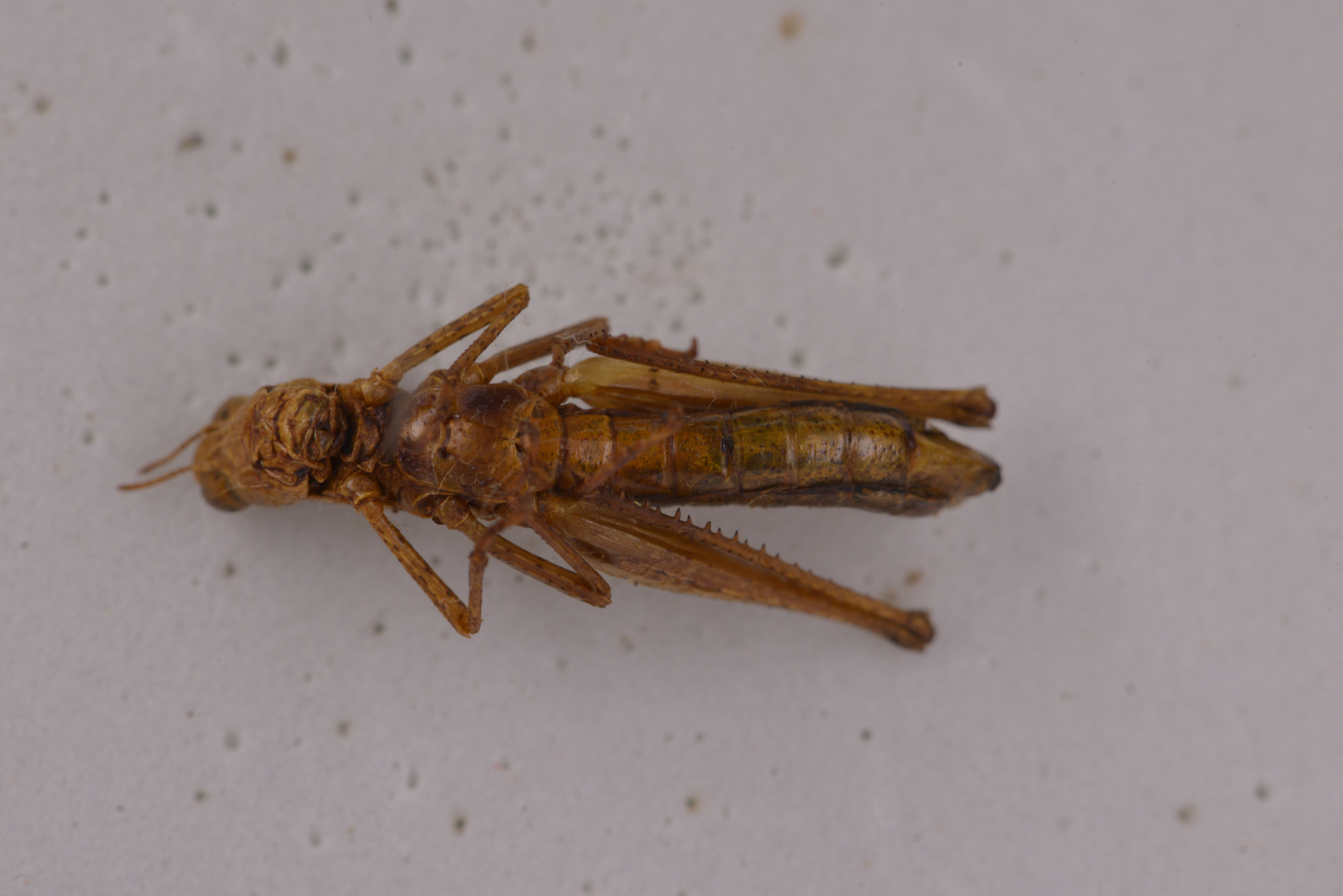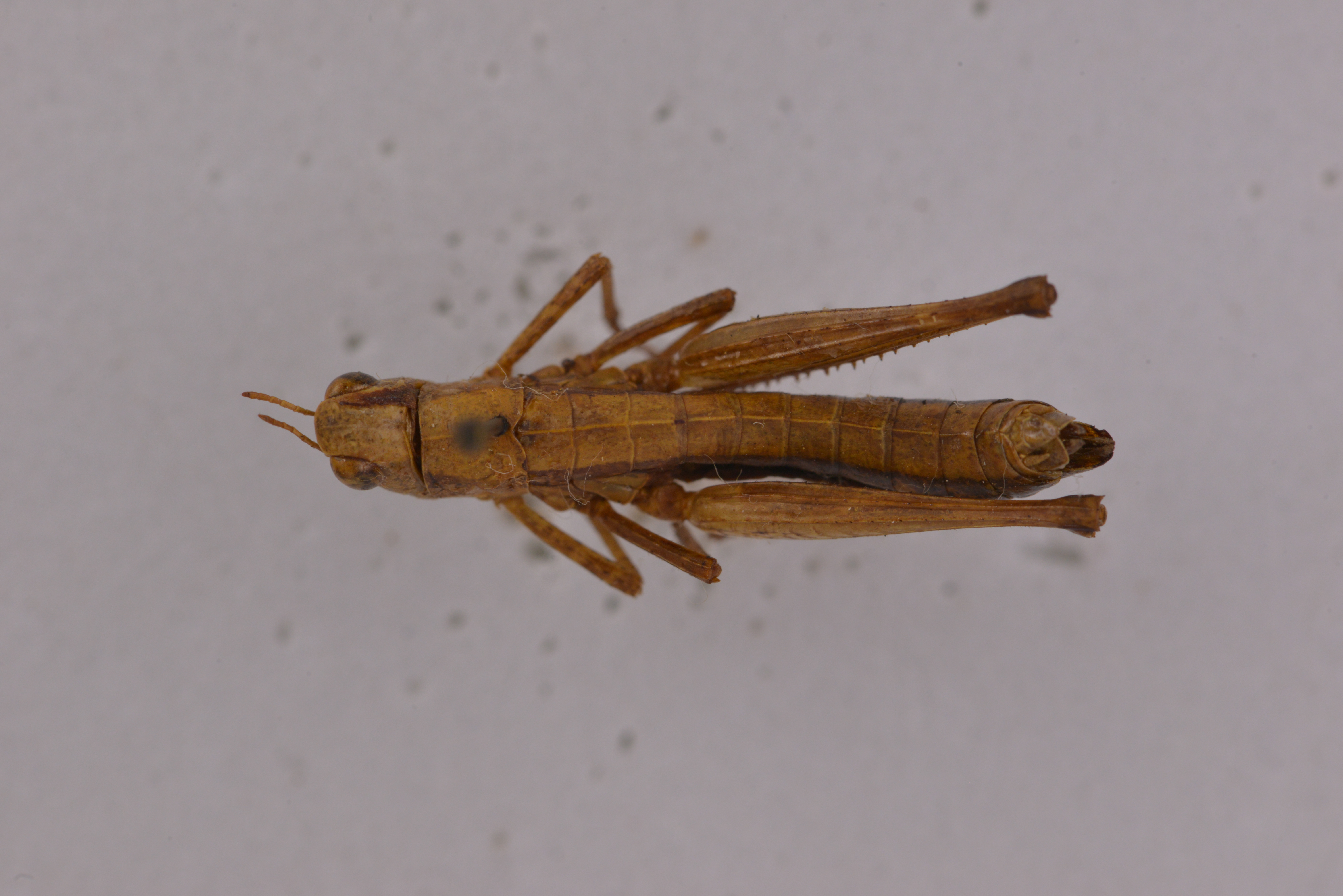 描述:雄性体形中等、较匀称。头短于前胸背板,侧观高出前胸背板水平线之上,头顶较宽背面稍凸起,侧观高出复眼上缘水平线。后头下斜,微凸起,中隆线甚细,不明显,颜面侧观倾斜,颜面隆起全长沟状、近中单眼处稍缩狭,近头顶两侧缘平行,近唇基处明显扩大。触角9节,丝状。前胸背板背面较明显凸起,前缘较直,后缘具中缺刻;中隆线较细,全长明显、侧隆线不甚明显、缺横沟。前胸背板侧片长稍大于高,下缘前段微向上倾斜,前下角宽圆形,中部具横沟。中胸腹板侧叶间的中隔宽大于长。前、后翅均缺如。后足股节到达腹端、背侧中隆线、内侧上隆线及外侧上隆线均具小齿。后足胫节内缘刺21-23个,外缘刺21-24个;具内、外端刺。后足跗节第1节背侧内、外缘具小齿3-4个。爪对称、爪间中垫较大、超出爪顶端。腹部末节背板后缘中央具凹缺,两侧向后延长、侧观近梯形。肛上板端部呈三角形延长、顶端较钝,具纵沟、尾须较直,圆柱形,内侧端部稍平或微凹陷。下生殖板较短、端部沿中央具纵隆线、几乎占全长一半,体褐黄色。有时头部牙面沿中隆线具不规则暗色斑纹、形成1条较宽的纵带复眼后方具黒色纵纹,向后沿前眴背板侧片中部延伸几乎到达腹端、但有时消失。后足股节端部暗色。