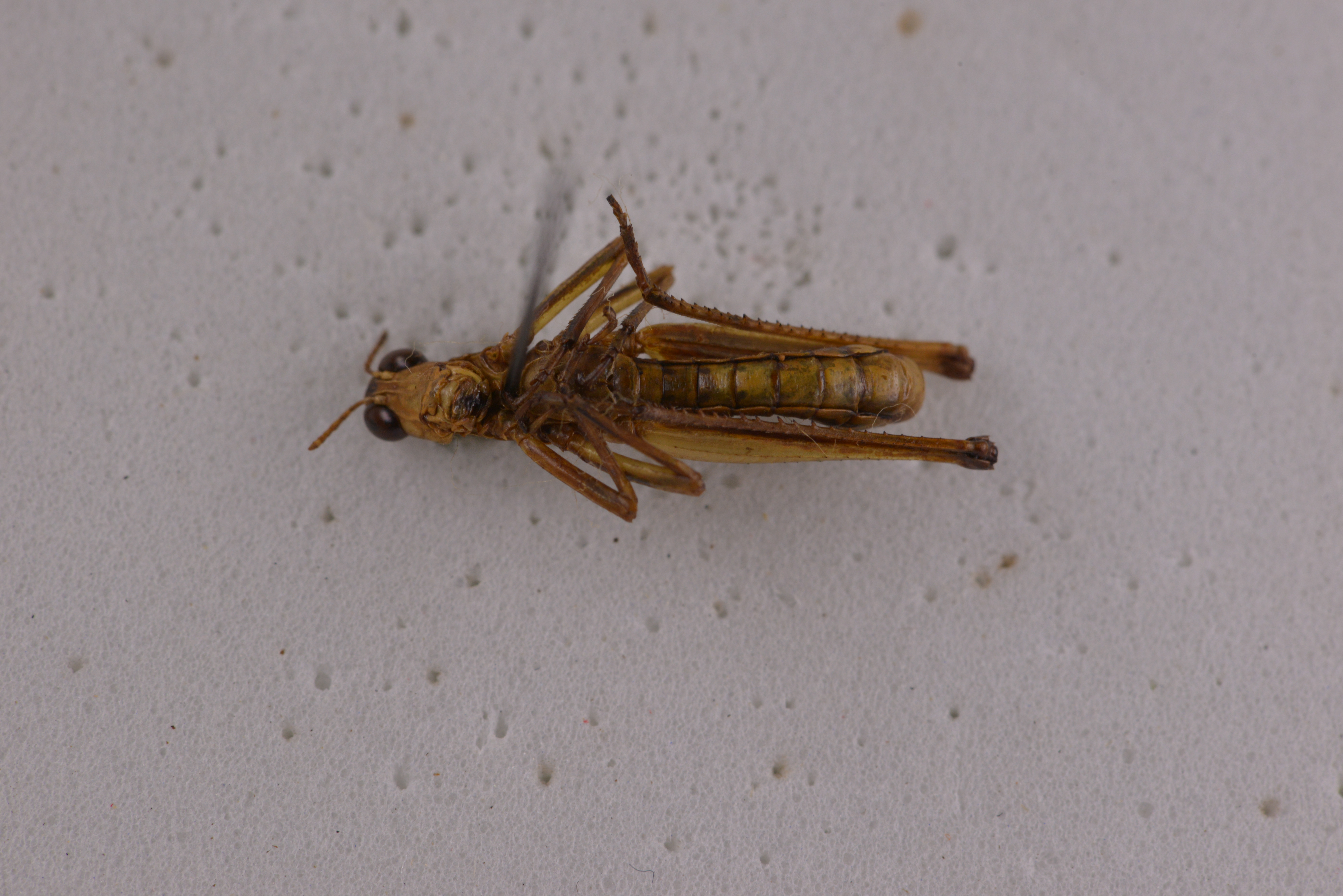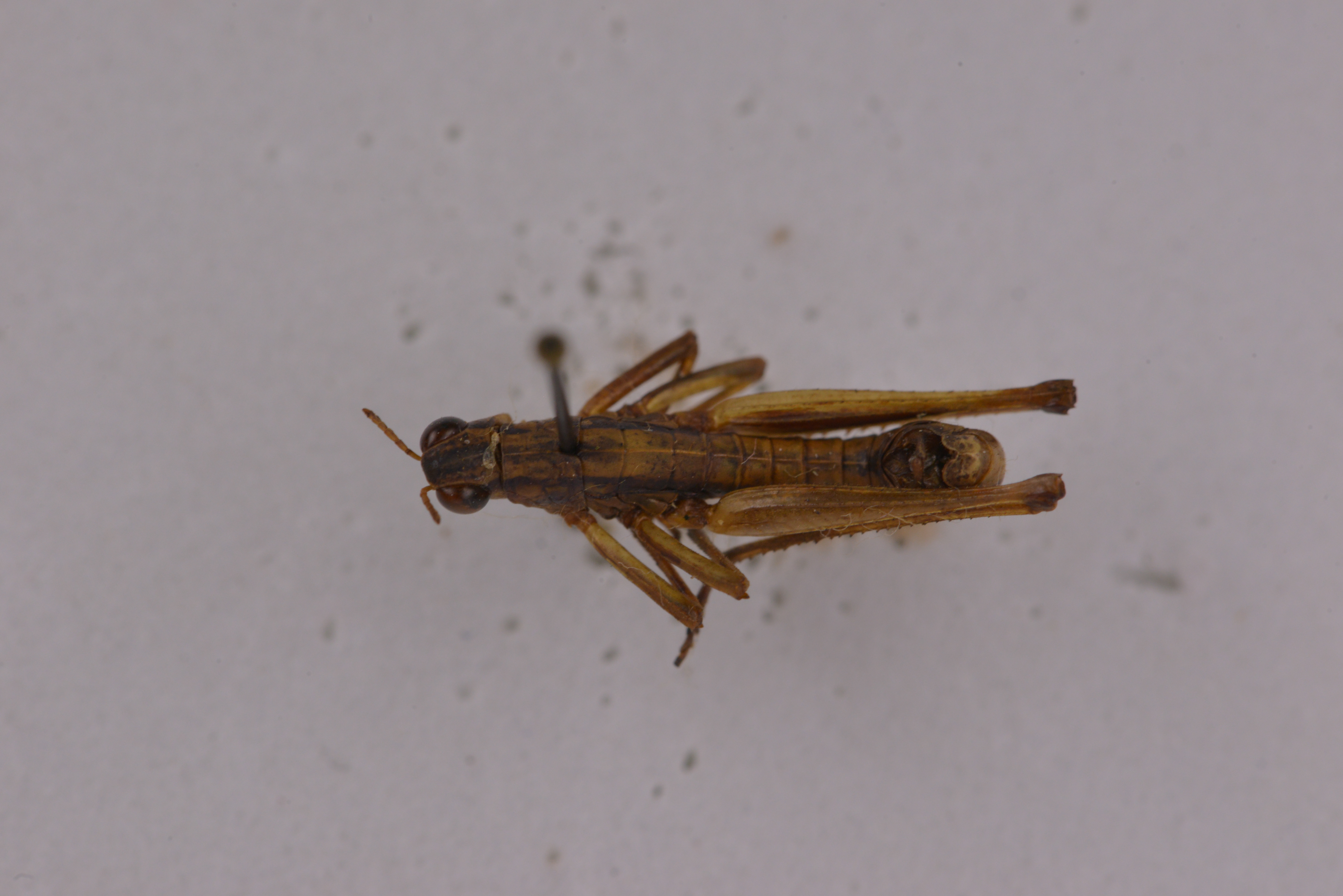 描述:雄性体形中等、较匀称。头短于前胸背板,侧观高出前胸背板水平线之上,头顶较宽背面稍凸起,侧观高出复眼上缘水平线。后头下斜,微凸起,中隆线甚细,不明显,颜面侧观倾斜,颜面隆起全长沟状、近中单眼处稍缩狭,近头顶两侧缘平行,近唇基处明显扩大。触角9节,丝状。前胸背板背面较明显凸起,前缘较直,后缘具中缺刻;中隆线较细,全长明显、侧隆线不甚明显、缺横沟。前胸背板侧片长稍大于高,下缘前段微向上倾斜,前下角宽圆形,中部具横沟。中胸腹板侧叶间的中隔宽大于长。前、后翅均缺如。后足股节到达腹端、背侧中隆线、内侧上隆线及外侧上隆线均具小齿。后足胫节内缘刺21-23个,外缘刺21-24个;具内、外端刺。后足跗节第1节背侧内、外缘具小齿3-4个。爪对称、爪间中垫较大、超出爪顶端。腹部末节背板后缘中央具凹缺,两侧向后延长、侧观近梯形。肛上板端部呈三角形延长、顶端较钝,具纵沟、尾须较直,圆柱形,内侧端部稍平或微凹陷。下生殖板较短、端部沿中央具纵隆线、几乎占全长一半,体褐黄色。有时头部牙面沿中隆线具不规则暗色斑纹、形成1条较宽的纵带复眼后方具黒色纵纹,向后沿前眴背板侧片中部延伸几乎到达腹端、但有时消失。后足股节端部暗色。
