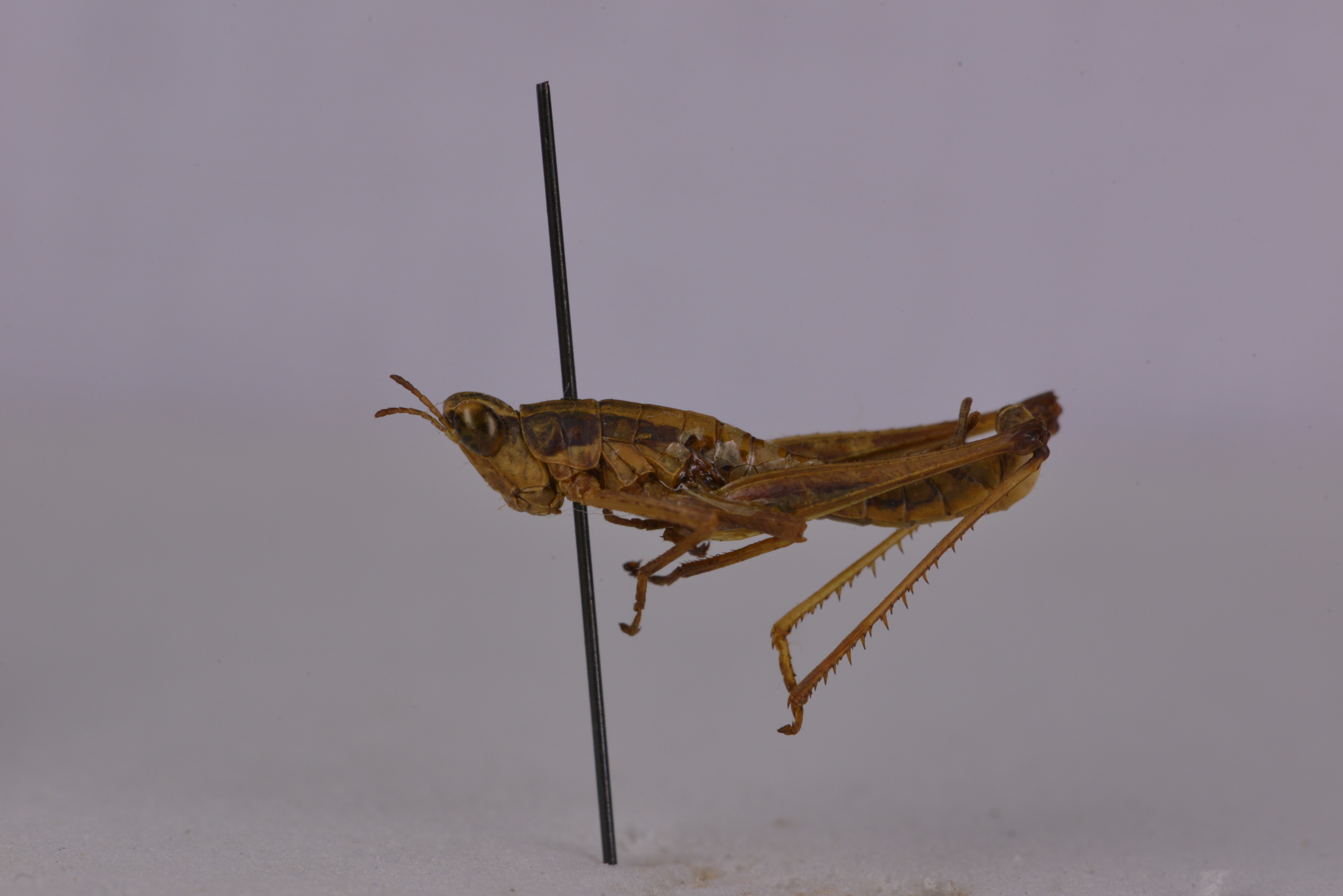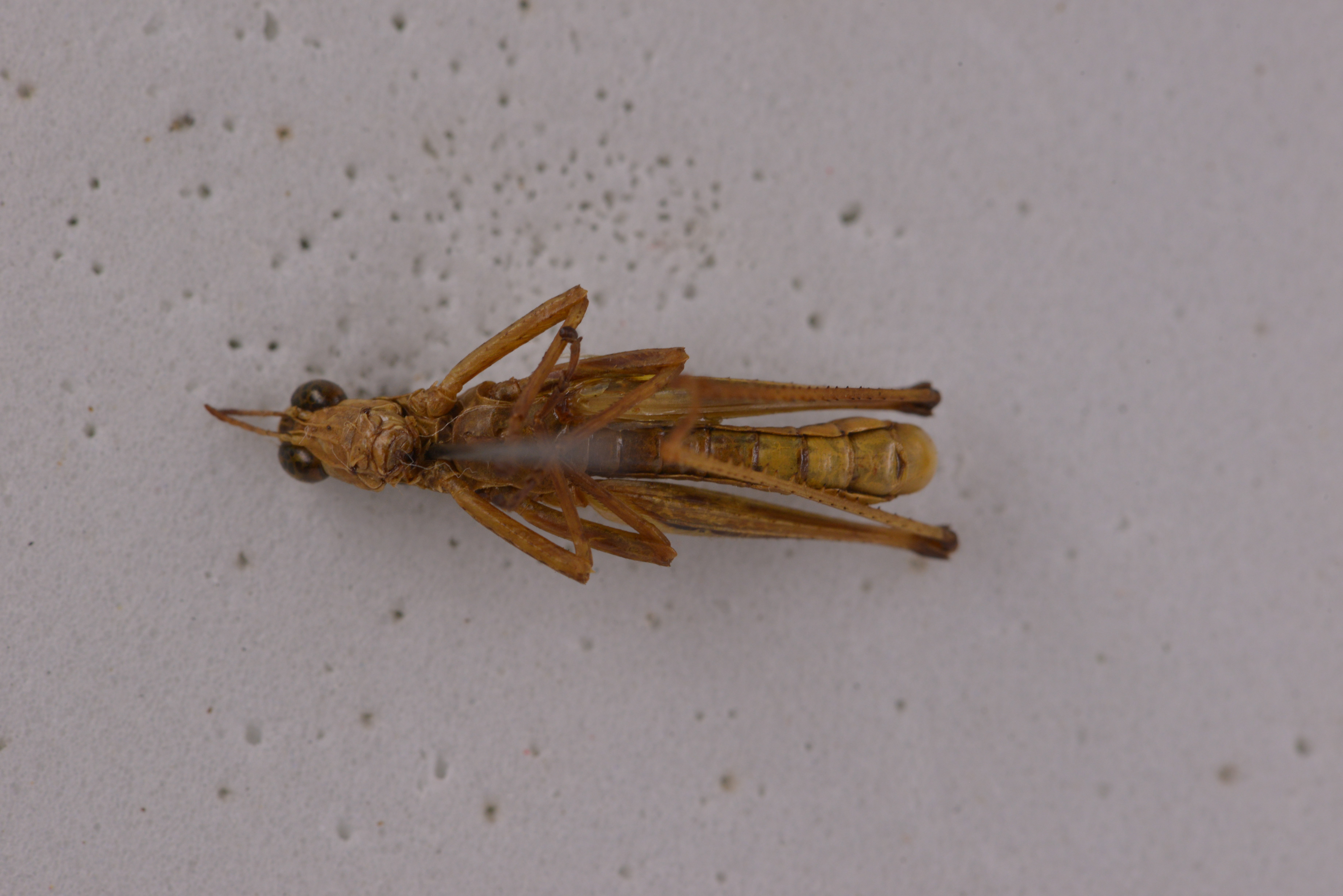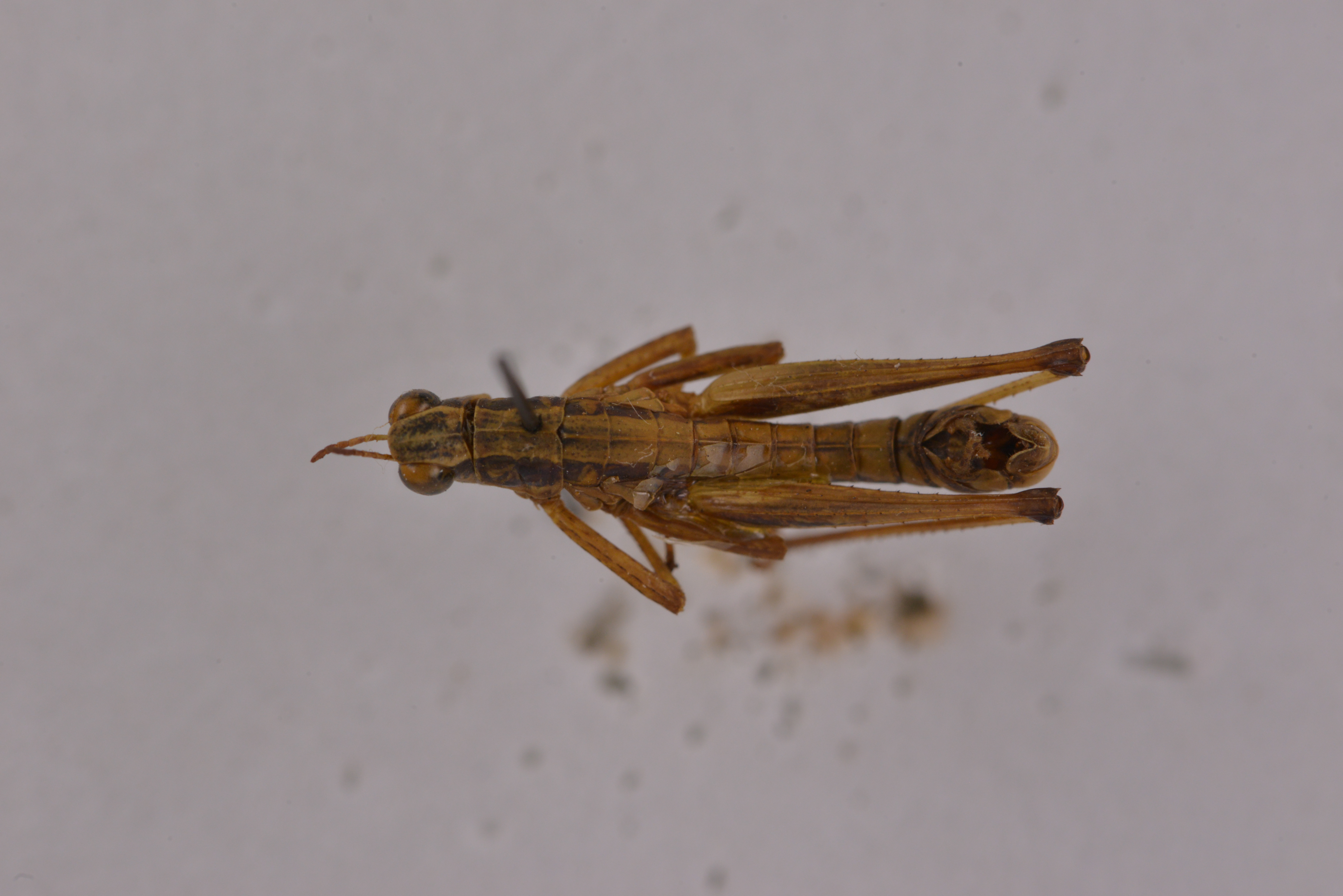 描述:雄性体形中等、较匀称。头短于前胸背板,侧观高出前胸背板水平线之上,头顶较宽背面稍凸起,侧观高出复眼上缘水平线。后头下斜,微凸起,中隆线甚细,不明显,颜面侧观倾斜,颜面隆起全长沟状、近中单眼处稍缩狭,近头顶两侧缘平行,近唇基处明显扩大。触角9节,丝状。前胸背板背面较明显凸起,前缘较直,后缘具中缺刻;中隆线较细,全长明显、侧隆线不甚明显、缺横沟。前胸背板侧片长稍大于高,下缘前段微向上倾斜,前下角宽圆形,中部具横沟。中胸腹板侧叶间的中隔宽大于长。前、后翅均缺如。后足股节到达腹端、背侧中隆线、内侧上隆线及外侧上隆线均具小齿。后足胫节内缘刺21-23个,外缘刺21-24个;具内、外端刺。后足跗节第1节背侧内、外缘具小齿3-4个。爪对称、爪间中垫较大、超出爪顶端。腹部末节背板后缘中央具凹缺,两侧向后延长、侧观近梯形。肛上板端部呈三角形延长、顶端较钝,具纵沟、尾须较直,圆柱形,内侧端部稍平或微凹陷。下生殖板较短、端部沿中央具纵隆线、几乎占全长一半,体褐黄色。有时头部牙面沿中隆线具不规则暗色斑纹、形成1条较宽的纵带复眼后方具黒色纵纹,向后沿前眴背板侧片中部延伸几乎到达腹端、但有时消失。后足股节端部暗色。