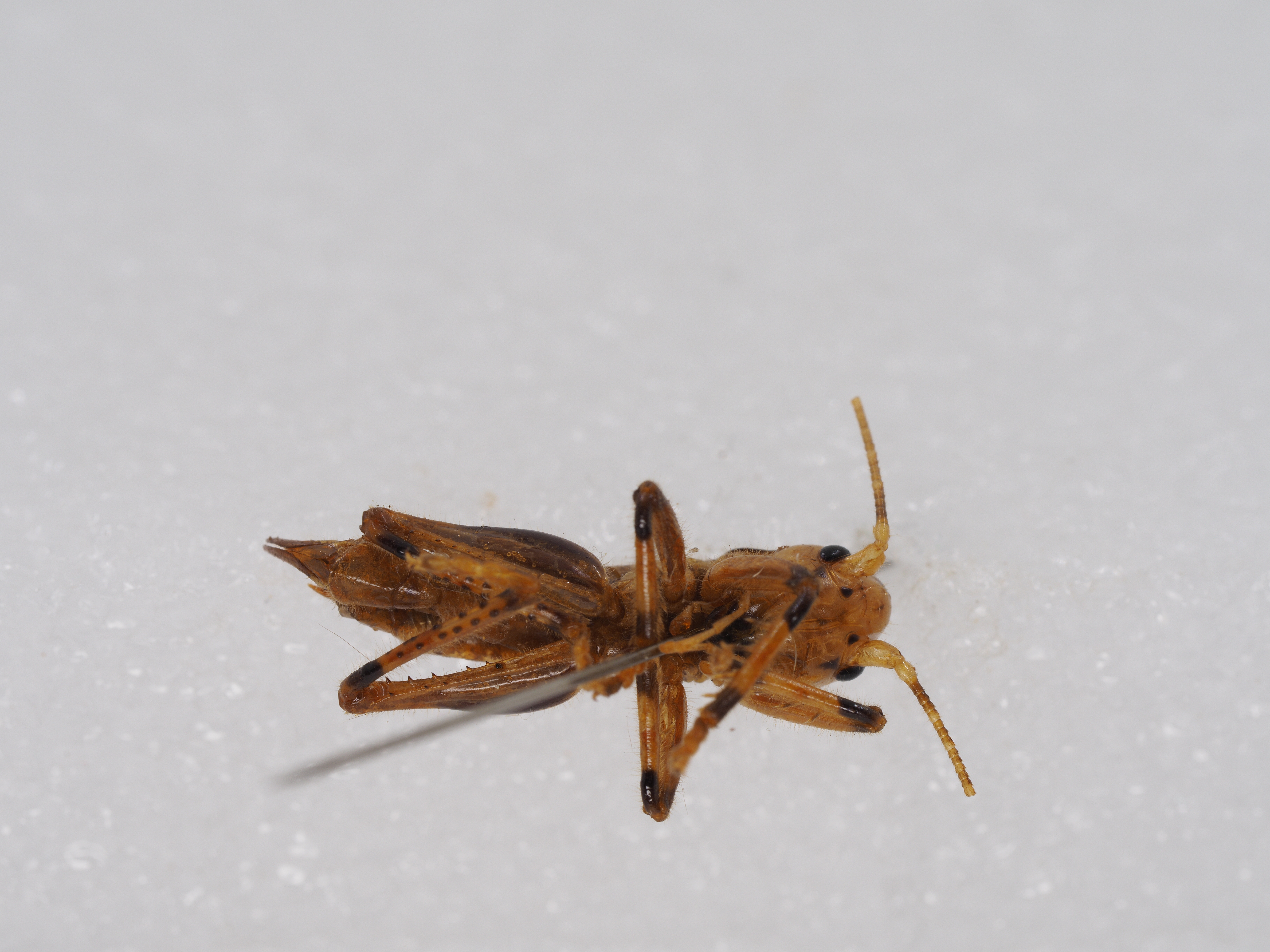 黑斑。雌性后足股节外侧具暗黑色纵带,前足和中足股节端部、各足胫节基部和端