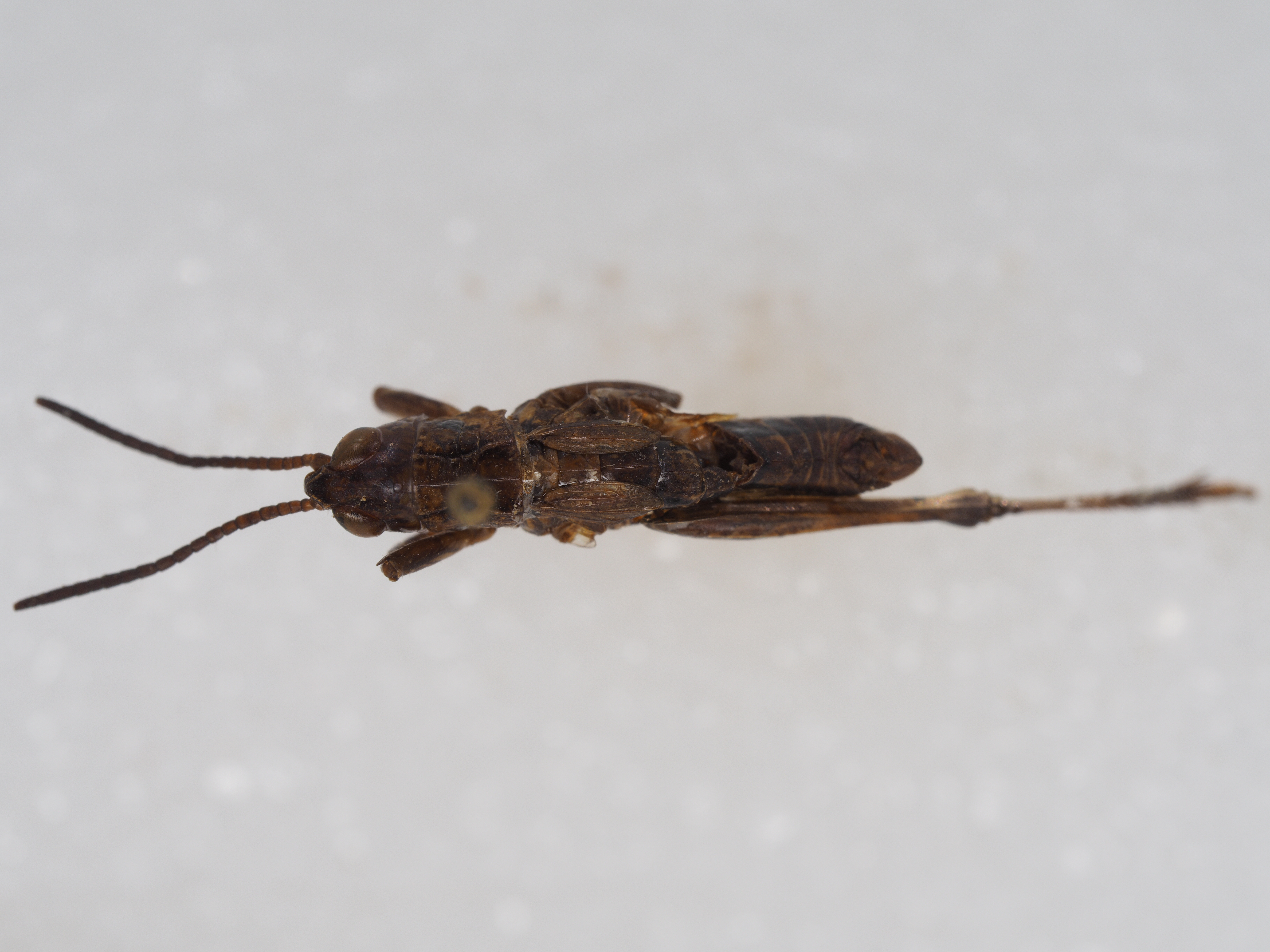 雌性头顶前缘几成直角。头侧窝长为宽的2.5—3倍。颜面隆起平坦。触角中段一节长为宽的1.2倍。前翅超过第一腹节前缘,在背部分开。后翅不到达第一腹节。下生殖板后缘平直。产卵瓣端部呈钩状。