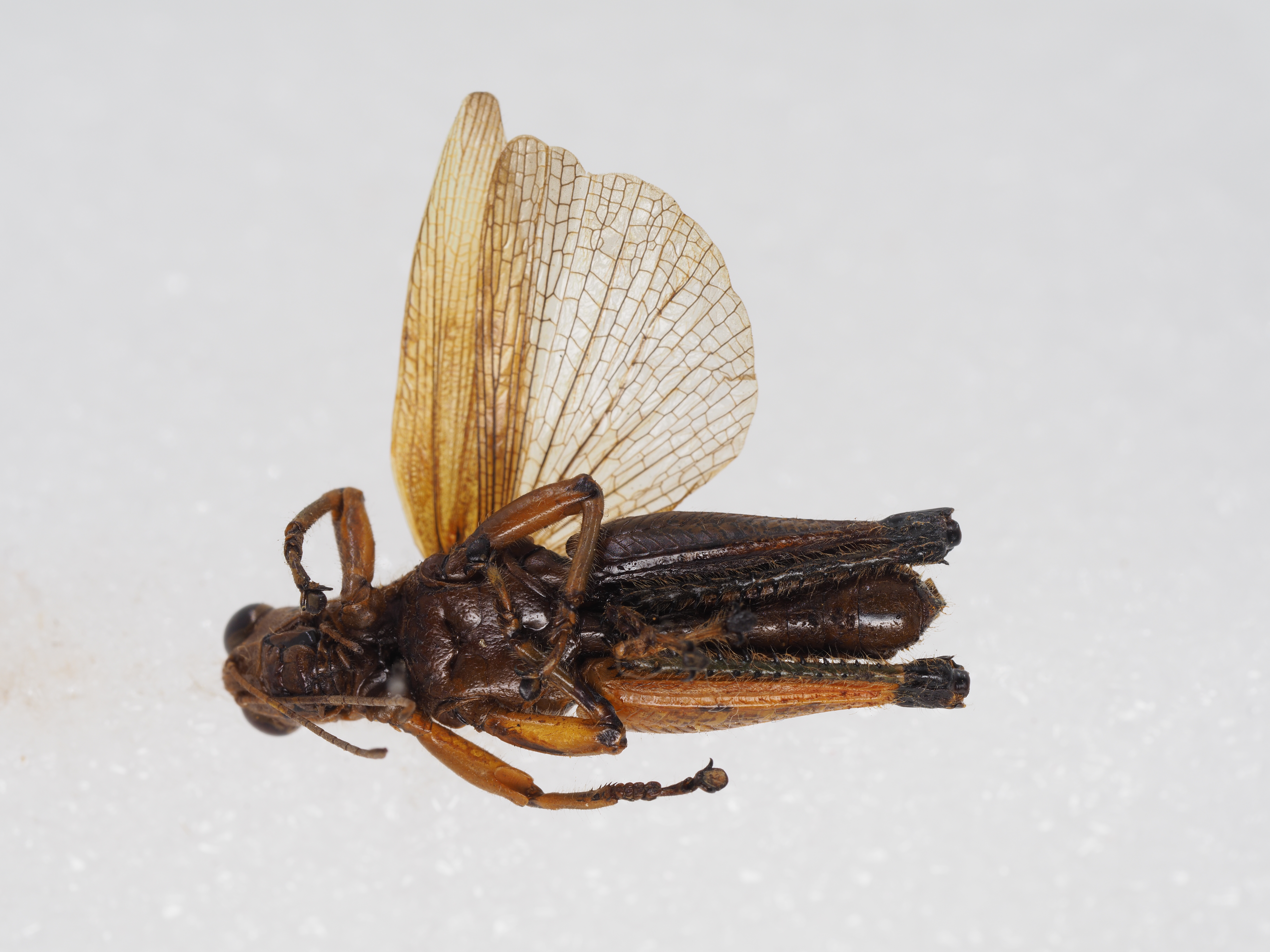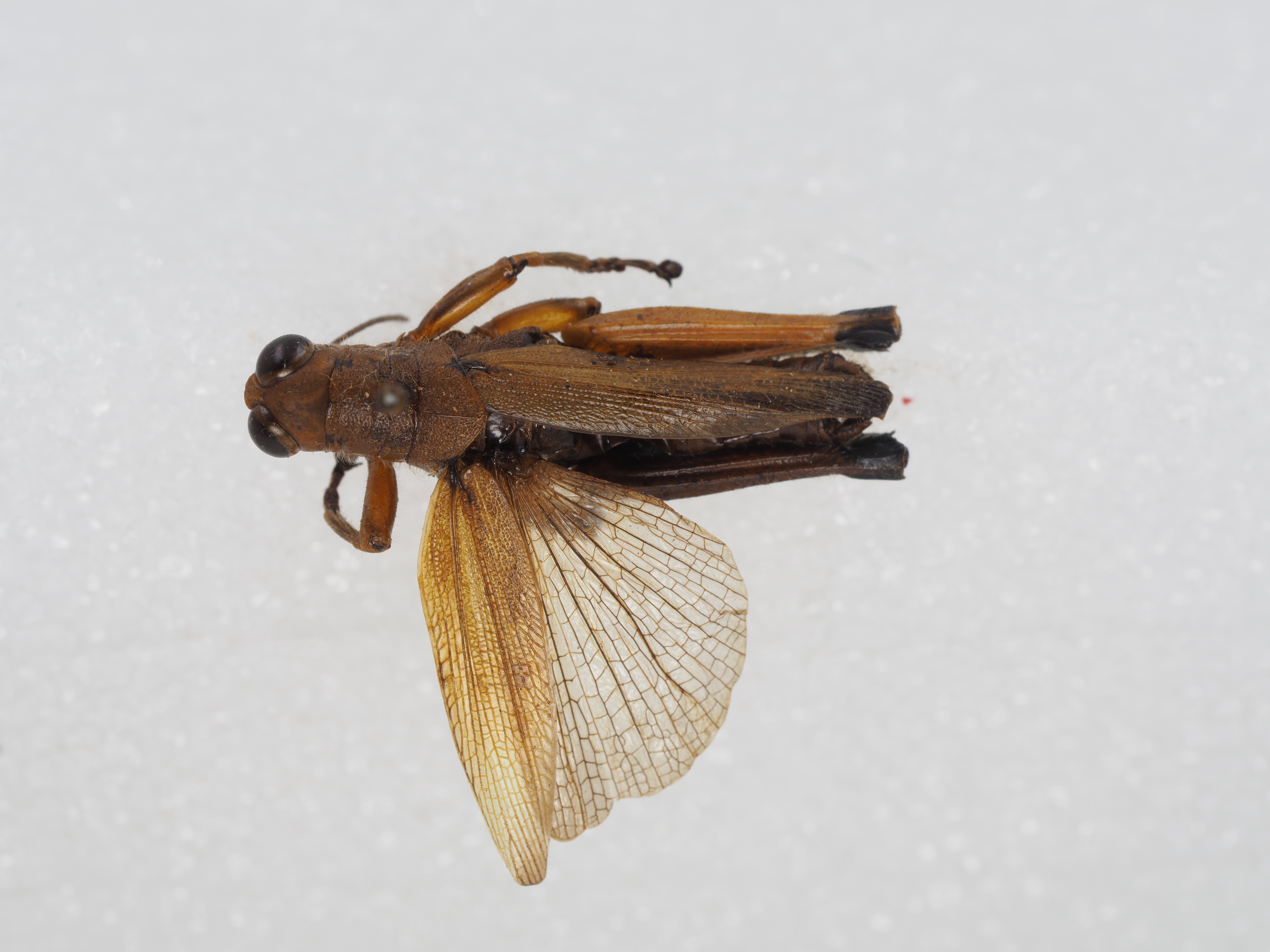 体色:黄褐色。复眼黑褐色。触角浅黄褐色,端部褐色。前胸背板黄褐色,背面具不规则的暗色斑,后缘在靠近翅基处有一小黑斑。前翅黄褐色,翅基亦具黑斑。后翅本色。足黄褐色,后足股节外侧的下侧隆线上有两个黑色短纵纹,股节端部黑色。后足胫节浅蓝色;跗节黄褐色,爪和中垫均黑色。