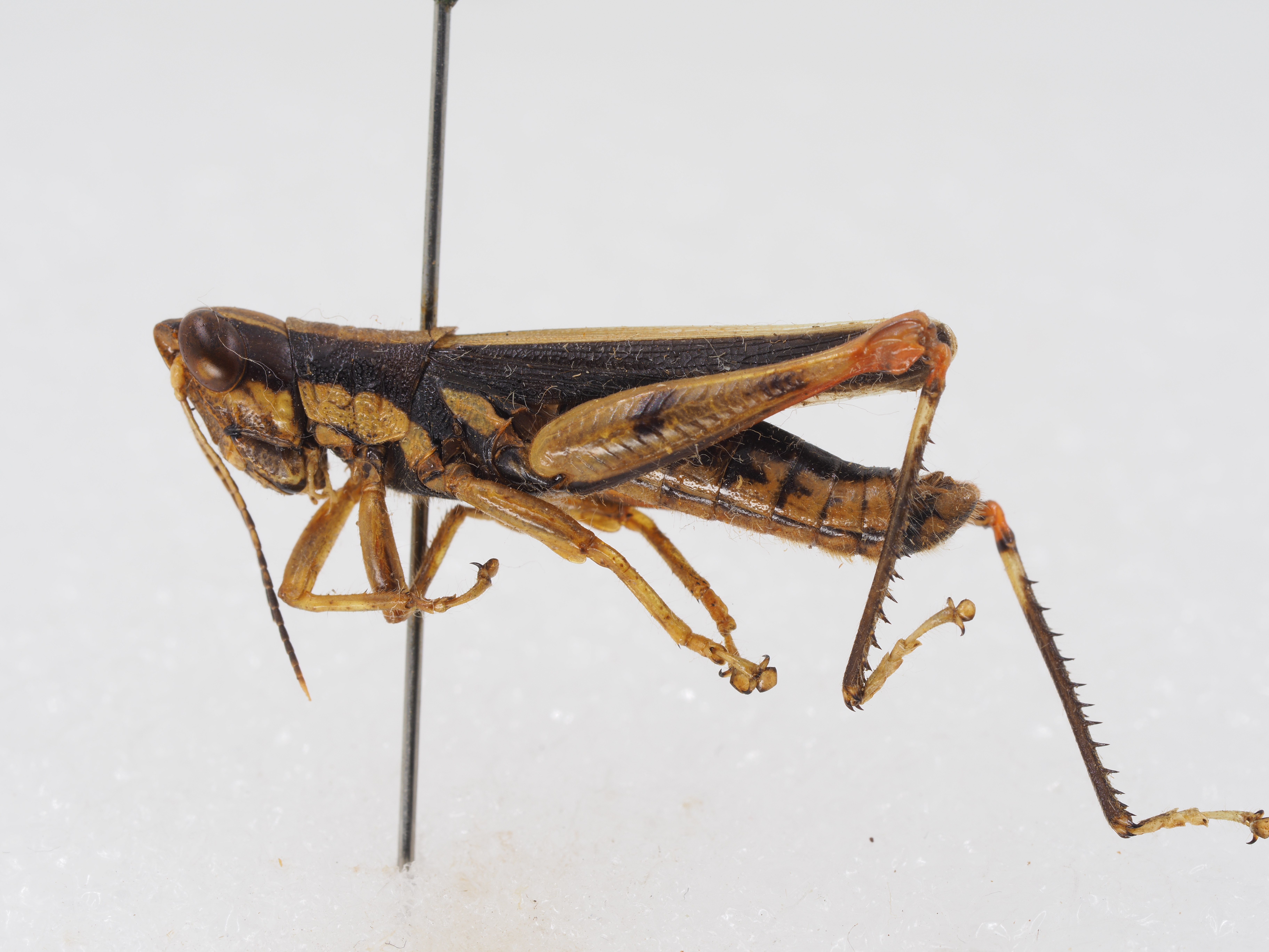 描述:雄性 体型中等,匀称。头短于前胸背板。缺头侧窝。颜面向前倾斜,侧观与头顶组成锐角。颜面隆起在触角间略突出,在中单眼之下具纵沟。复眼卵圆形,其垂直直径为水平直径的1.42~1.67倍,为眼下沟长的2.44~2.65倍。触角丝状,超过前胸背板的后缘。前胸背板前缘圆弧形,后缘为三角形突出。中隆线低而细,缺侧隆线;3条横沟均明显,并都割断中隆线;后横沟位于中部之后,沟后区的长度为沟前区长的1.44~1.66倍。前胸腹板突圆柱状,略向后倾斜,端部微圆。中胸腹板侧叶长宽近相等,侧叶间之中隔较宽,中隔的长度为其最狭处的1.61~2.71倍。后胸腹板侧叶在端部毗连。前、后翅发达,到达或略不到达后足股节的端部。后足股节上侧中隆线无细齿,在端部形成小的锐刺;上膝侧片的顶端较圆,下膝侧片的顶端形成锐刺。后足胫节端部略扩大,边缘圆形,具内、外端刺,但外端刺很小,不易看见,有时在雄性仅一足有之;外缘具刺8个,内缘具刺10~12个。后足跗节爪间中垫较发达,几乎与爪等长。腹部第1节具发达的鼓膜器。肛上板略呈等腰三角形,端部较尖,背面基部具明显的纵沟,其长度不到达中部。尾须圆锥形,端部之半较细,顶端尖锐。下生殖板呈短锥形,端部钝圆。