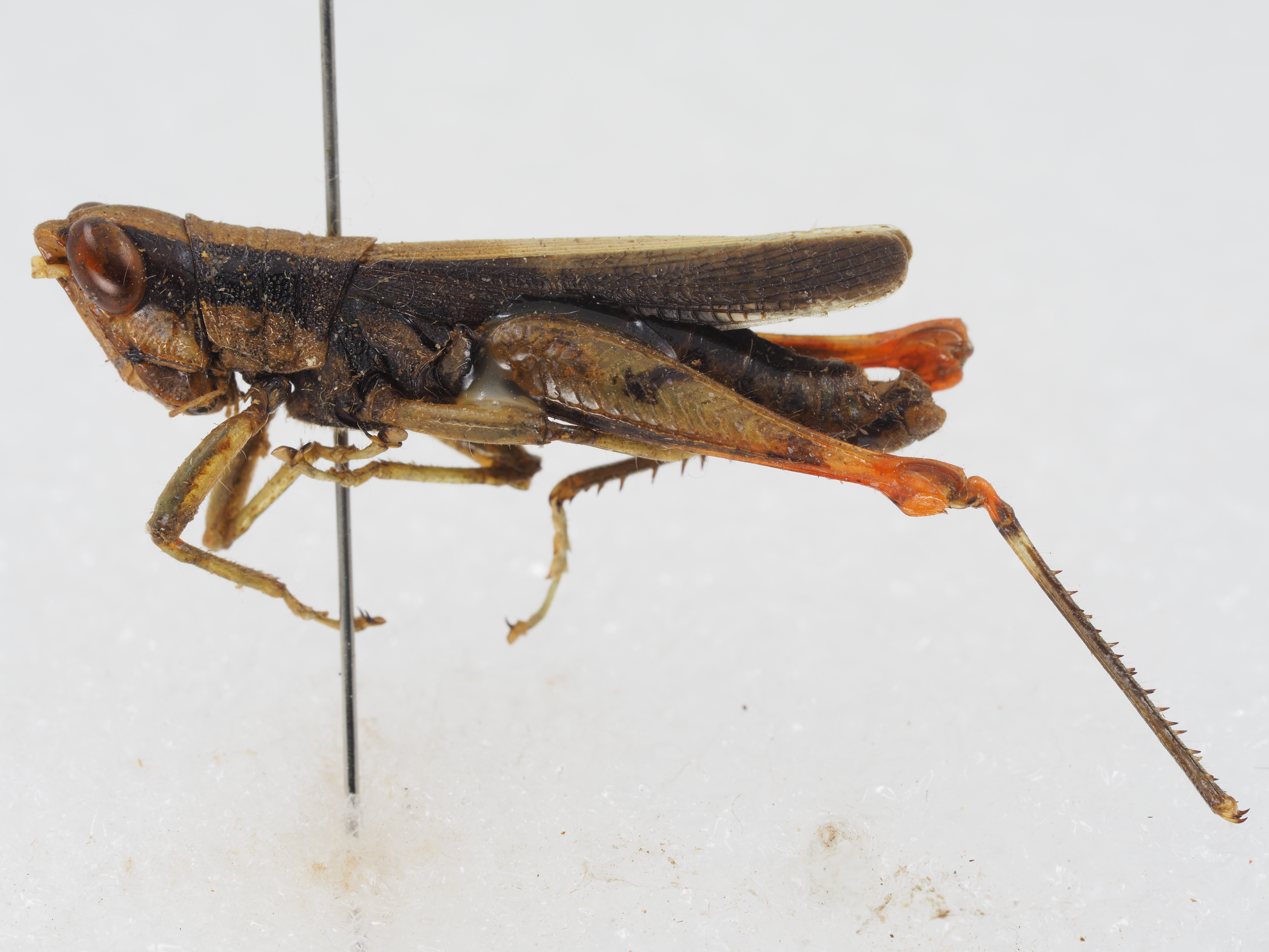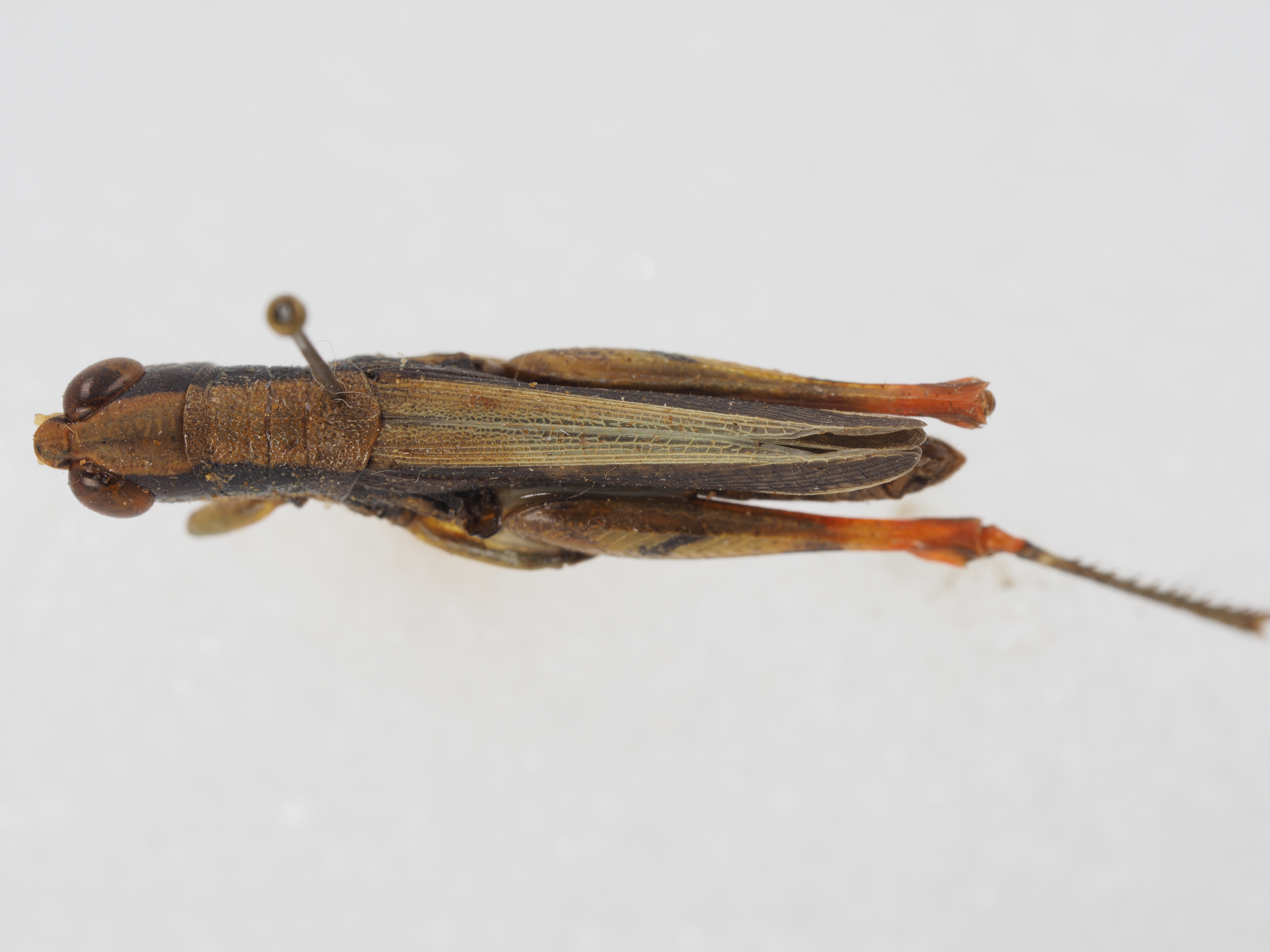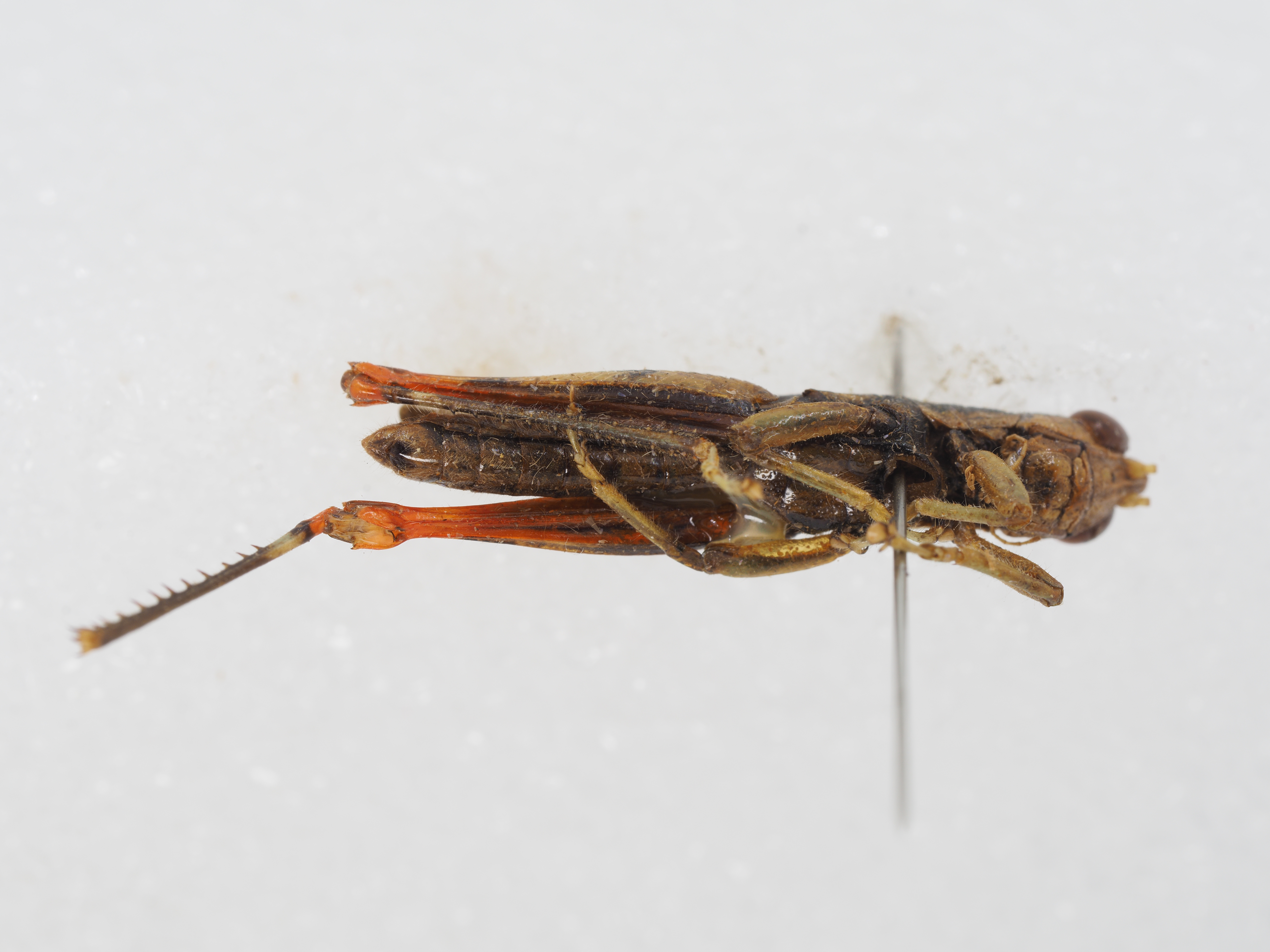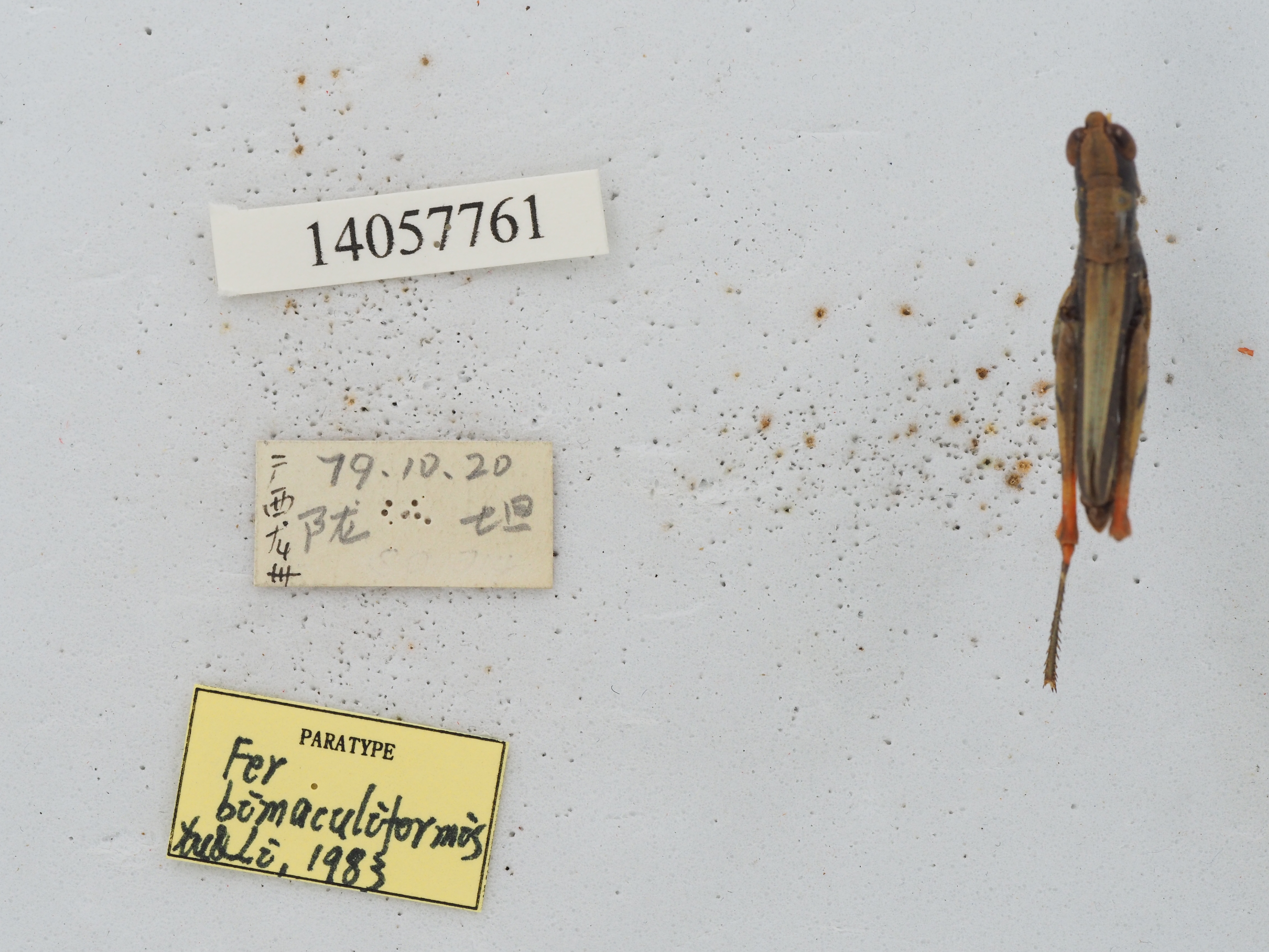 描述:雄性 体型中等,匀称。头短于前胸背板。缺头侧窝。颜面向前倾斜,侧观与头顶组成锐角。颜面隆起在触角间略突出,在中单眼之下具纵沟。复眼卵圆形,其垂直直径为水平直径的1.42~1.67倍,为眼下沟长的2.44~2.65倍。触角丝状,超过前胸背板的后缘。前胸背板前缘圆弧形,后缘为三角形突出。中隆线低而细,缺侧隆线;3条横沟均明显,并都割断中隆线;后横沟位于中部之后,沟后区的长度为沟前区长的1.44~1.66倍。前胸腹板突圆柱状,略向后倾斜,端部微圆。中胸腹板侧叶长宽近相等,侧叶间之中隔较宽,中隔的长度为其最狭处的1.61~2.71倍。后胸腹板侧叶在端部毗连。前、后翅发达,到达或略不到达后足股节的端部。后足股节上侧中隆线无细齿,在端部形成小的锐刺;上膝侧片的顶端较圆,下膝侧片的顶端形成锐刺。后足胫节端部略扩大,边缘圆形,具内、外端刺,但外端刺很小,不易看见,有时在雄性仅一足有之;外缘具刺8个,内缘具刺10~12个。后足跗节爪间中垫较发达,几乎与爪等长。腹部第1节具发达的鼓膜器。肛上板略呈等腰三角形,端部较尖,背面基部具明显的纵沟,其长度不到达中部。尾须圆锥形,端部之半较细,顶端尖锐。下生殖板呈短锥形,端部钝圆。