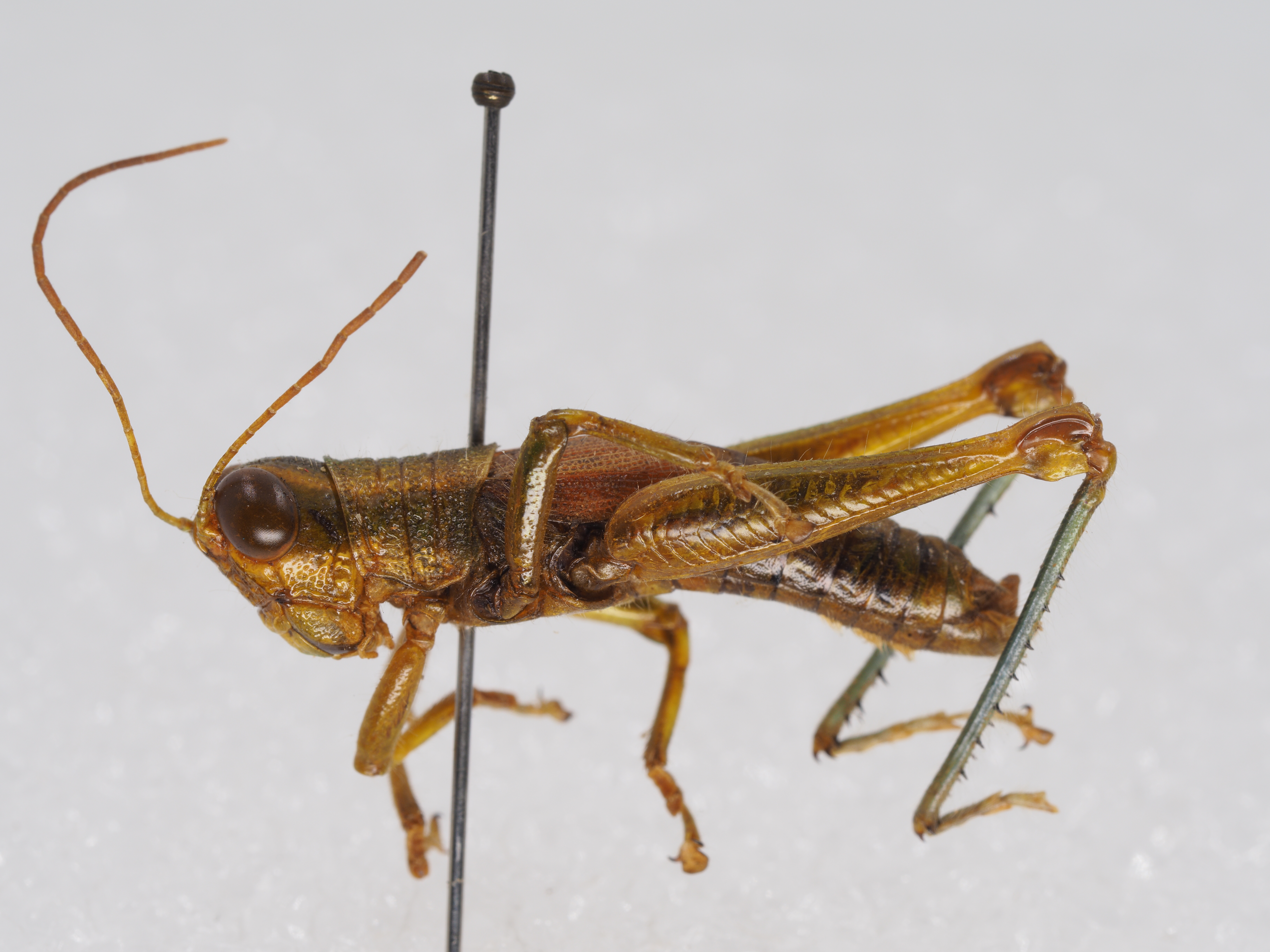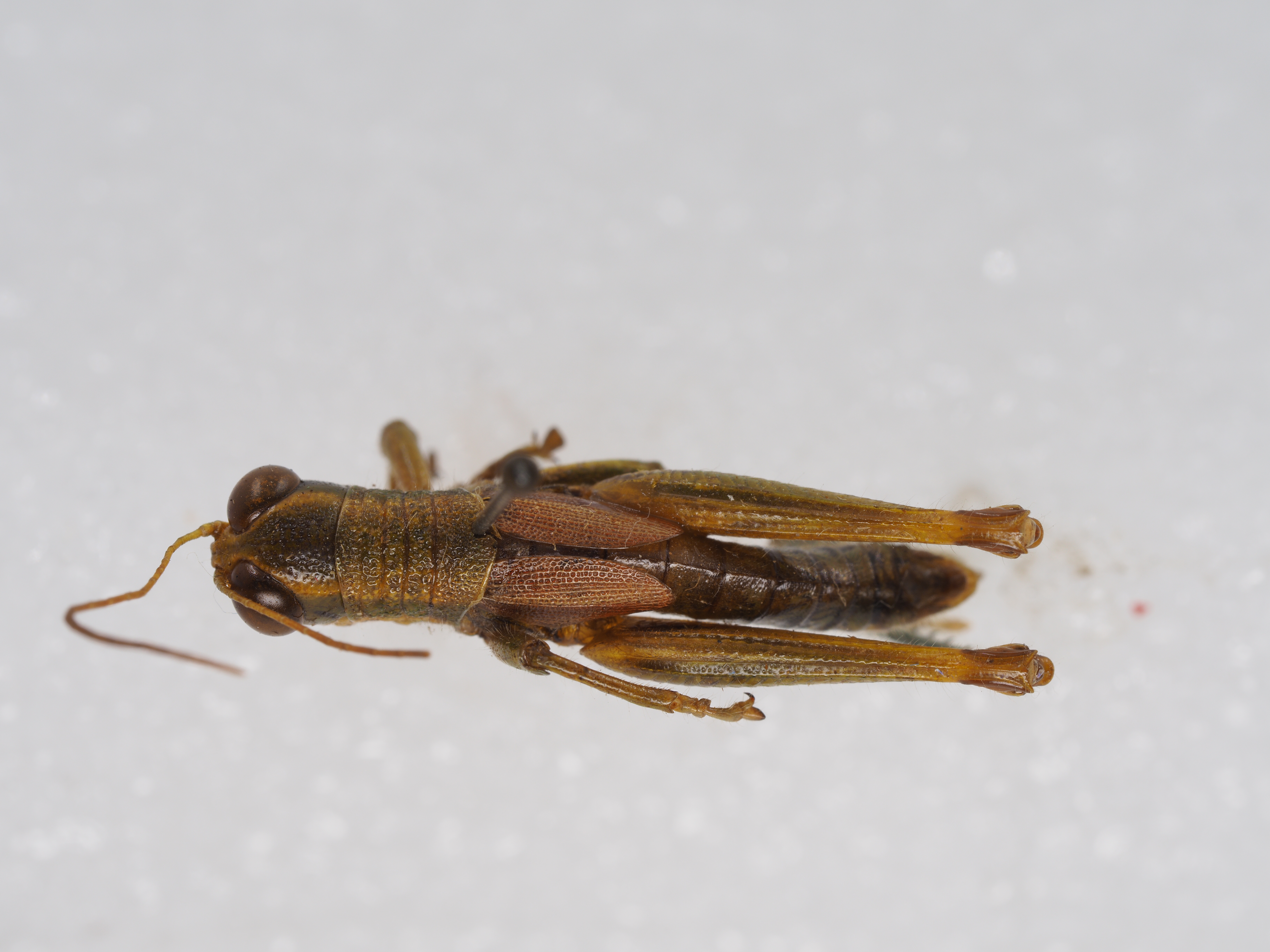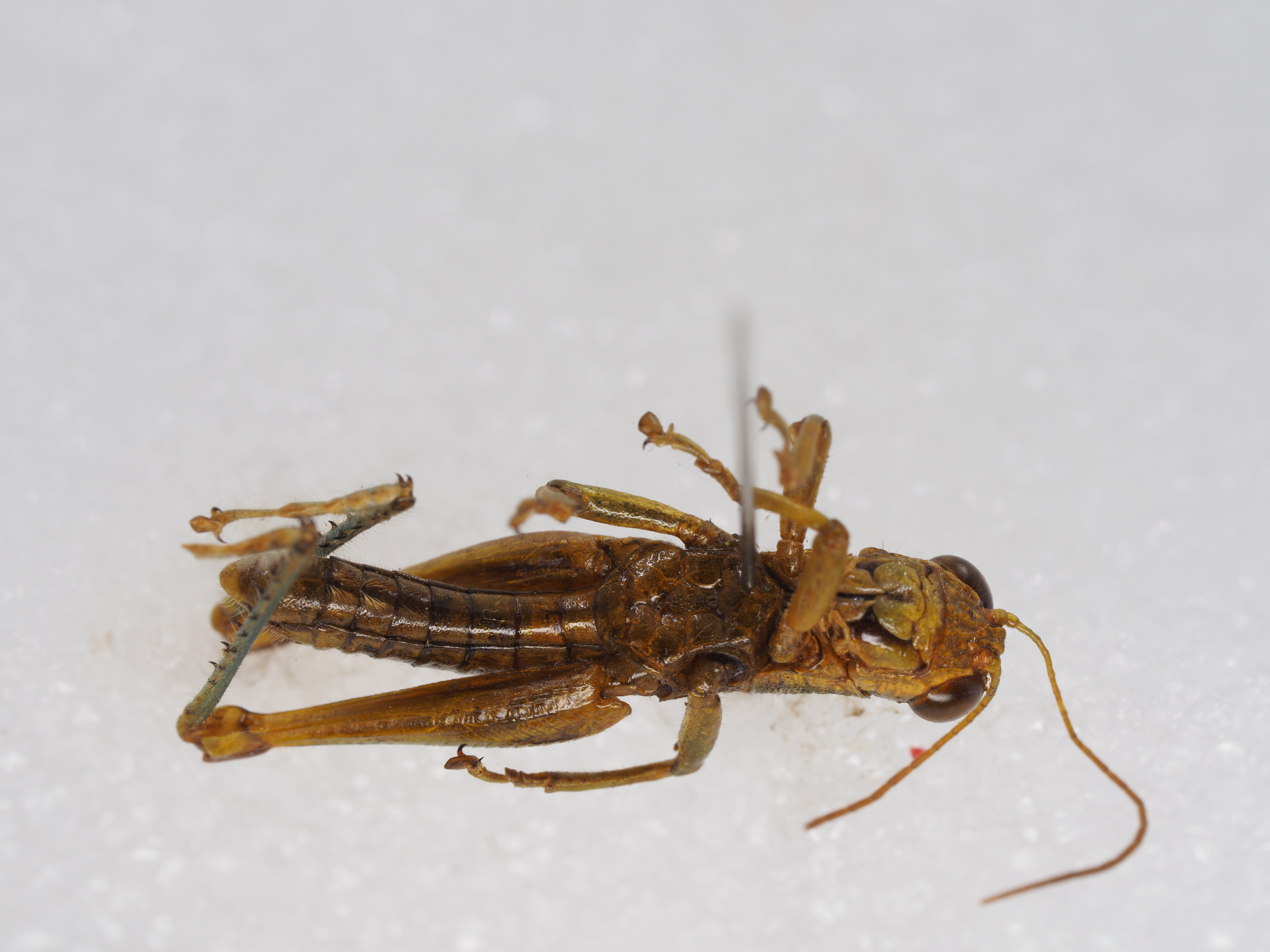 描述:雄性 体略粗壮,中小型,具粗密颗粒和刻点及稀疏绒毛。头大而短,短于前胸背板。头顶略呈梯形,前缘较平,两侧缘明显隆起,背面具较宽的凹陷。头侧窝消失。颜面倾斜,具较粗大的刻点;颜面隆起在中单眼之下消失或极不明显。复眼卵圆形,较突出,其垂直直径约为水平直径的1.3倍,几乎与眼下沟等长。触角丝状,细长,共25节,到达后足股节中部,触角中段一节的长度约为其宽度的4.4~5倍。前胸背板前缘的中部略突出,缺凹口,后缘宽圆;中隆线不甚明显,仅在中横沟之后隐约可见,缺侧隆线;3条横沟均明显,并都割断中隆线;沟前区长约为沟后区长的1.6~1.8倍。前胸腹板突短锥形,顶端狭锐。中胸腹板侧叶的长与宽大致相等,其宽度约为中隔宽度的1.40~1.42倍。后胸腹板侧叶在凹窝后彼此毗连。前翅长椭圆形,端部狭圆,到达或略超过第2腹节的后缘;两前翅在背后常彼此分开,有时毗连。后翅甚小,约为前翅长的1/3~1/2。后足股节上侧的中隆线略见细齿;在外侧上、下隆线之间具明显的羽状平行隆线;下膝侧片顶端较圆。后足胫节缺外端刺,沿其外缘具刺7~9个,内缘具刺8~9个,具有内端刺。后足跗节到达或略超过胫节中部,中垫发达,其长度约为爪长的2倍。腹部第1节背板侧面具有发达的鼓膜器,略呈肾形;最后一节尾片小而明显。肛上板近乎侧梯形,两侧向内弯曲,端部中央具有三角形突出,背面有中纵沟和侧纵沟,中纵沟在中部消失。下生殖板粗短,端部宽圆。尾须侧扁,呈扁锥状,到达或略超过肛上板的端部。