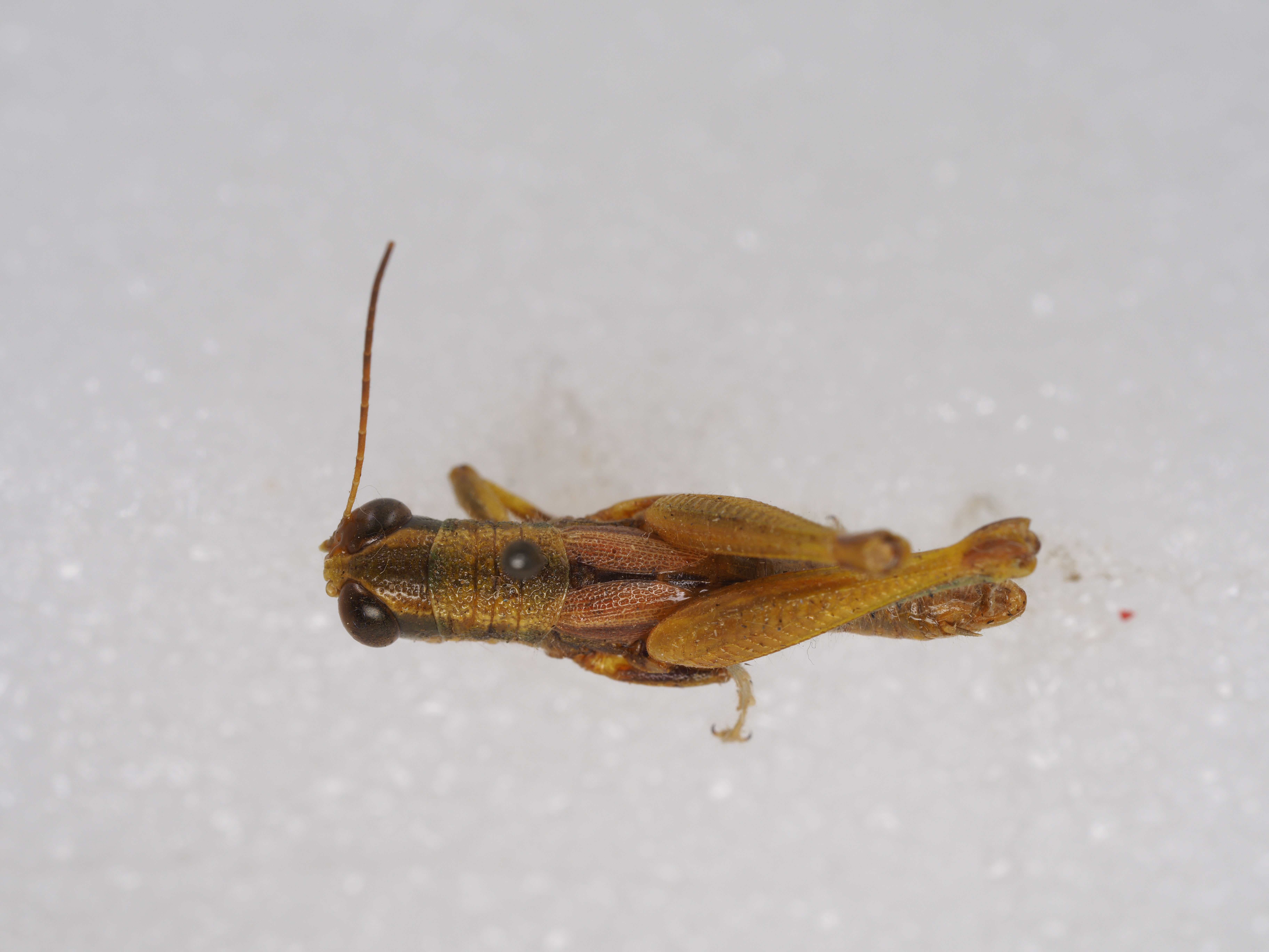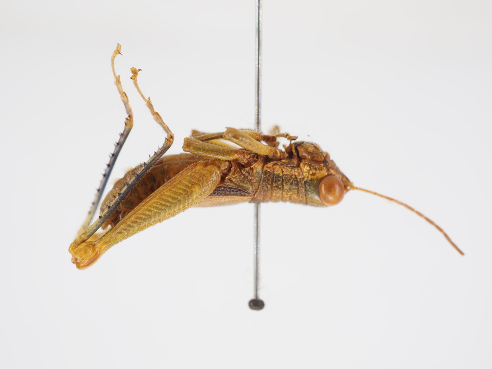 描述:雄性 体略粗壮,中小型,具粗密颗粒和刻点及稀疏绒毛。头大而短,短于前胸背板。头顶略呈梯形,前缘较平,两侧缘明显隆起,背面具较宽的凹陷。头侧窝消失。颜面倾斜,具较粗大的刻点;颜面隆起在中单眼之下消失或极不明显。复眼卵圆形,较突出,其垂直直径约为水平直径的1.3倍,几乎与眼下沟等长。触角丝状,细长,共25节,到达后足股节中部,触角中段一节的长度约为其宽度的4.4~5倍。前胸背板前缘的中部略突出,缺凹口,后缘宽圆;中隆线不甚明显,仅在中横沟之后隐约可见,缺侧隆线;3条横沟均明显,并都割断中隆线;沟前区长约为沟后区长的1.6~1.8倍。前胸腹板突短锥形,顶端狭锐。中胸腹板侧叶的长与宽大致相等,其宽度约为中隔宽度的1.40~1.42倍。后胸腹板侧叶在凹窝后彼此毗连。前翅长椭圆形,端部狭圆,到达或略超过第2腹节的后缘;两前翅在背后常彼此分开,有时毗连。后翅甚小,约为前翅长的1/3~1/2。后足股节上侧的中隆线略见细齿;在外侧上、下隆线之间具明显的羽状平行隆线;下膝侧片顶端较圆。后足胫节缺外端刺,沿其外缘具刺7~9个,内缘具刺8~9个,具有内端刺。后足跗节到达或略超过胫节中部,中垫发达,其长度约为爪长的2倍。腹部第1节背板侧面具有发达的鼓膜器,略呈肾形;最后一节尾片小而明显。肛上板近乎侧梯形,两侧向内弯曲,端部中央具有三角形突出,背面有中纵沟和侧纵沟,中纵沟在中部消失。下生殖板粗短,端部宽圆。尾须侧扁,呈扁锥状,到达或略超过肛上板的端部。
