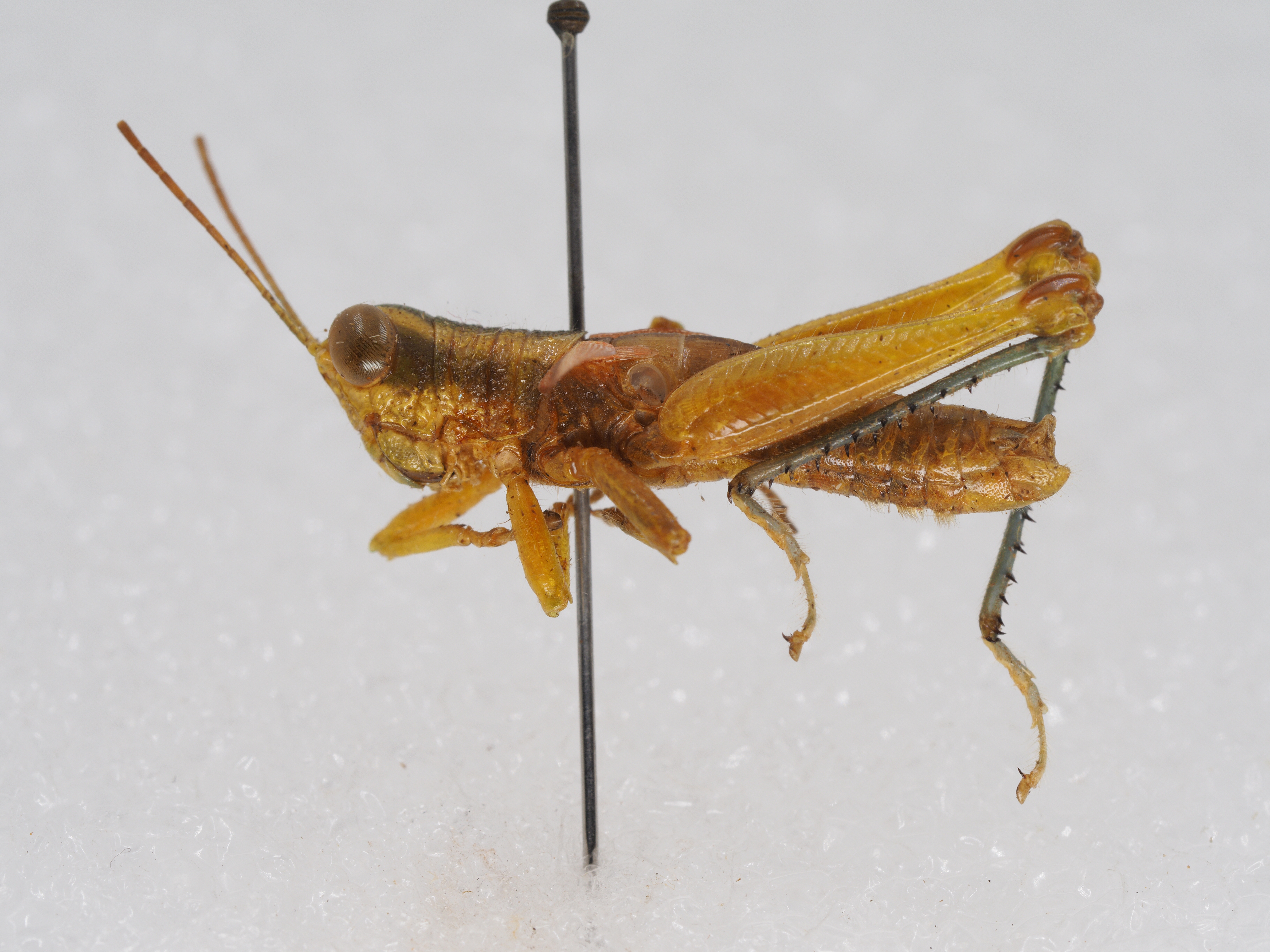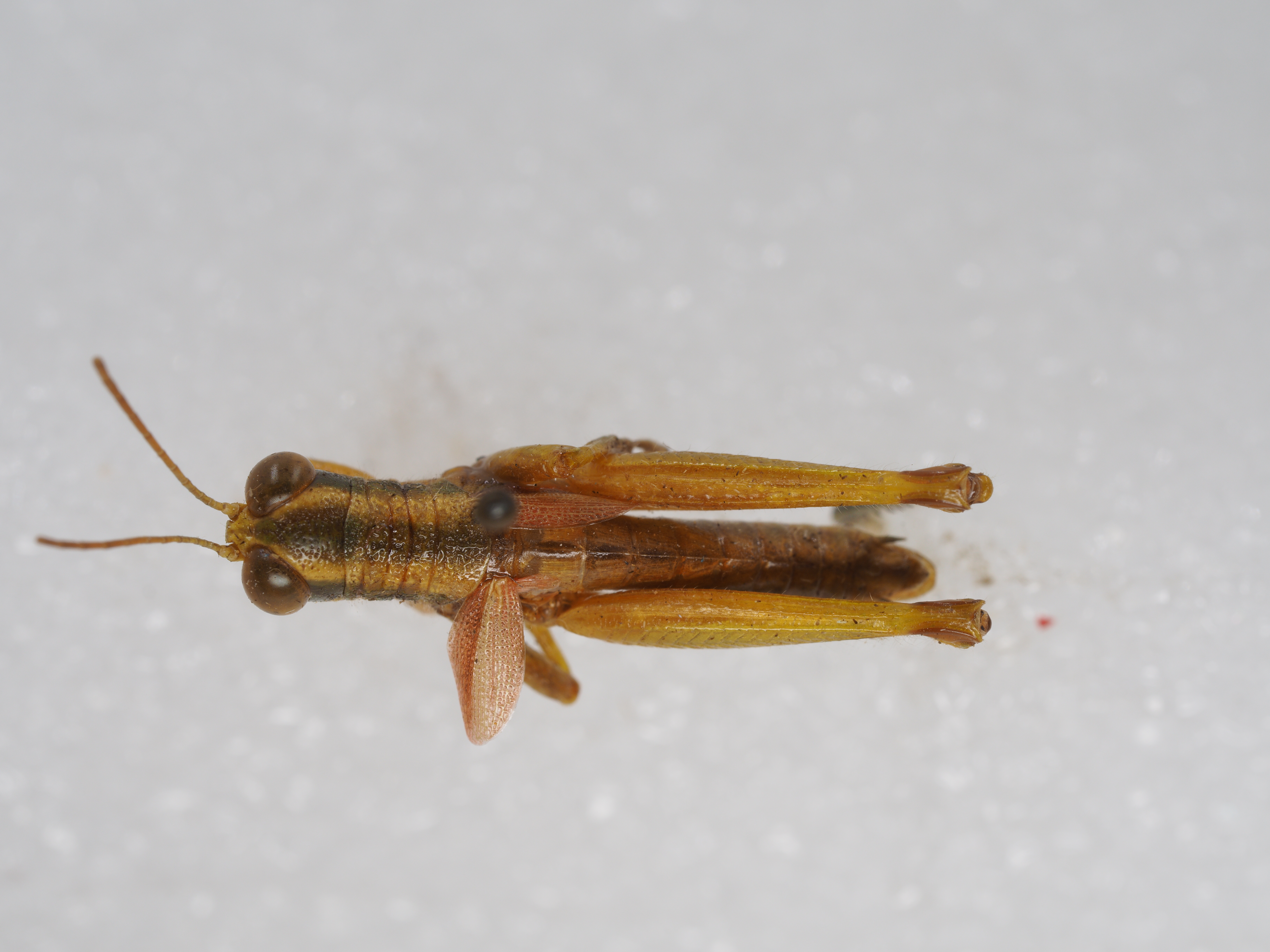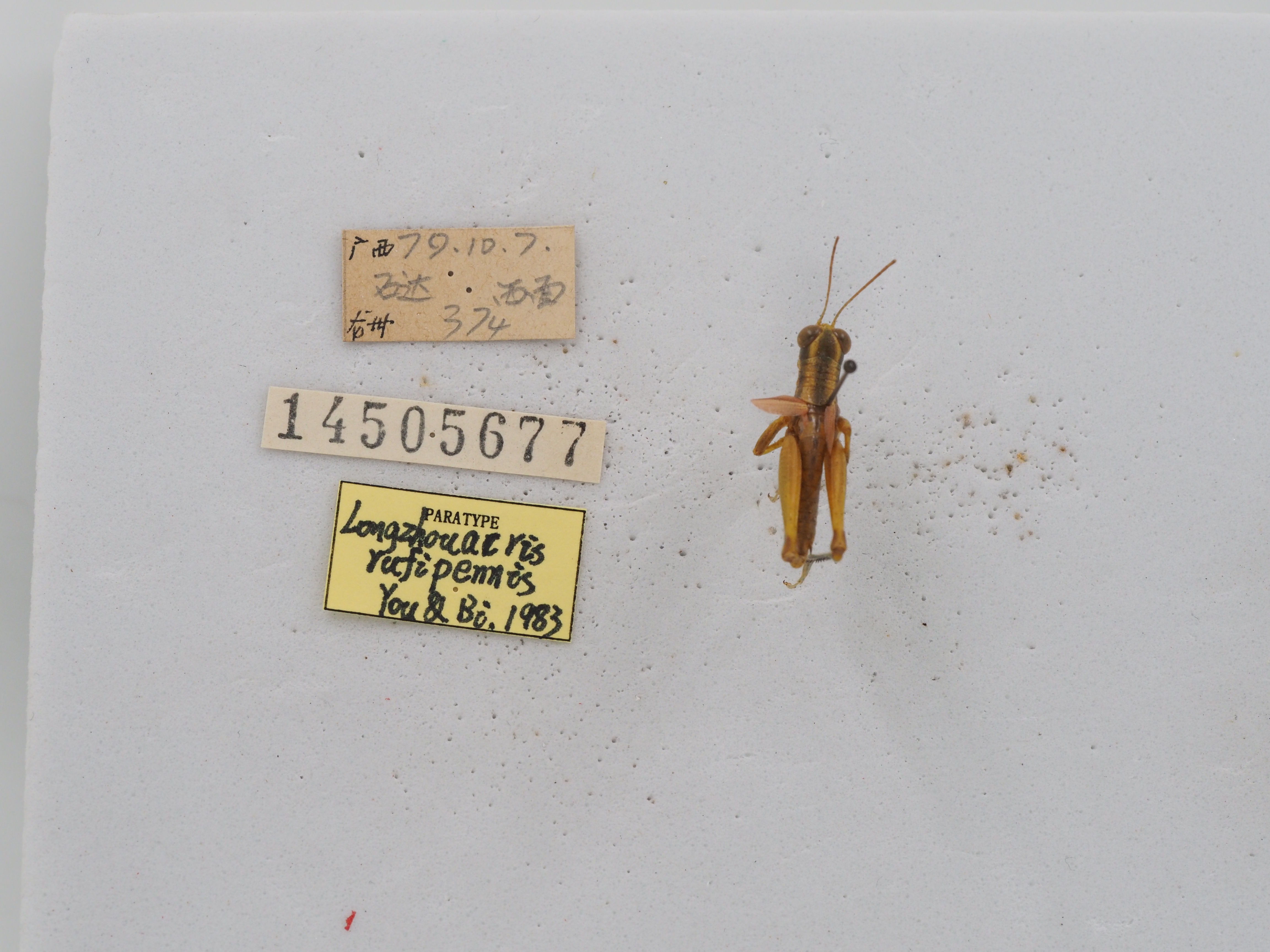 描述:雄性 体略粗壮,中小型,具粗密颗粒和刻点及稀疏绒毛。头大而短,短于前胸背板。头顶略呈梯形,前缘较平,两侧缘明显隆起,背面具较宽的凹陷。头侧窝消失。颜面倾斜,具较粗大的刻点;颜面隆起在中单眼之下消失或极不明显。复眼卵圆形,较突出,其垂直直径约为水平直径的1.3倍,几乎与眼下沟等长。触角丝状,细长,共25节,到达后足股节中部,触角中段一节的长度约为其宽度的4.4~5倍。前胸背板前缘的中部略突出,缺凹口,后缘宽圆;中隆线不甚明显,仅在中横沟之后隐约可见,缺侧隆线;3条横沟均明显,并都割断中隆线;沟前区长约为沟后区长的1.6~1.8倍。前胸腹板突短锥形,顶端狭锐。中胸腹板侧叶的长与宽大致相等,其宽度约为中隔宽度的1.40~1.42倍。后胸腹板侧叶在凹窝后彼此毗连。前翅长椭圆形,端部狭圆,到达或略超过第2腹节的后缘;两前翅在背后常彼此分开,有时毗连。后翅甚小,约为前翅长的1/3~1/2。后足股节上侧的中隆线略见细齿;在外侧上、下隆线之间具明显的羽状平行隆线;下膝侧片顶端较圆。后足胫节缺外端刺,沿其外缘具刺7~9个,内缘具刺8~9个,具有内端刺。后足跗节到达或略超过胫节中部,中垫发达,其长度约为爪长的2倍。腹部第1节背板侧面具有发达的鼓膜器,略呈肾形;最后一节尾片小而明显。肛上板近乎侧梯形,两侧向内弯曲,端部中央具有三角形突出,背面有中纵沟和侧纵沟,中纵沟在中部消失。下生殖板粗短,端部宽圆。尾须侧扁,呈扁锥状,到达或略超过肛上板的端部。