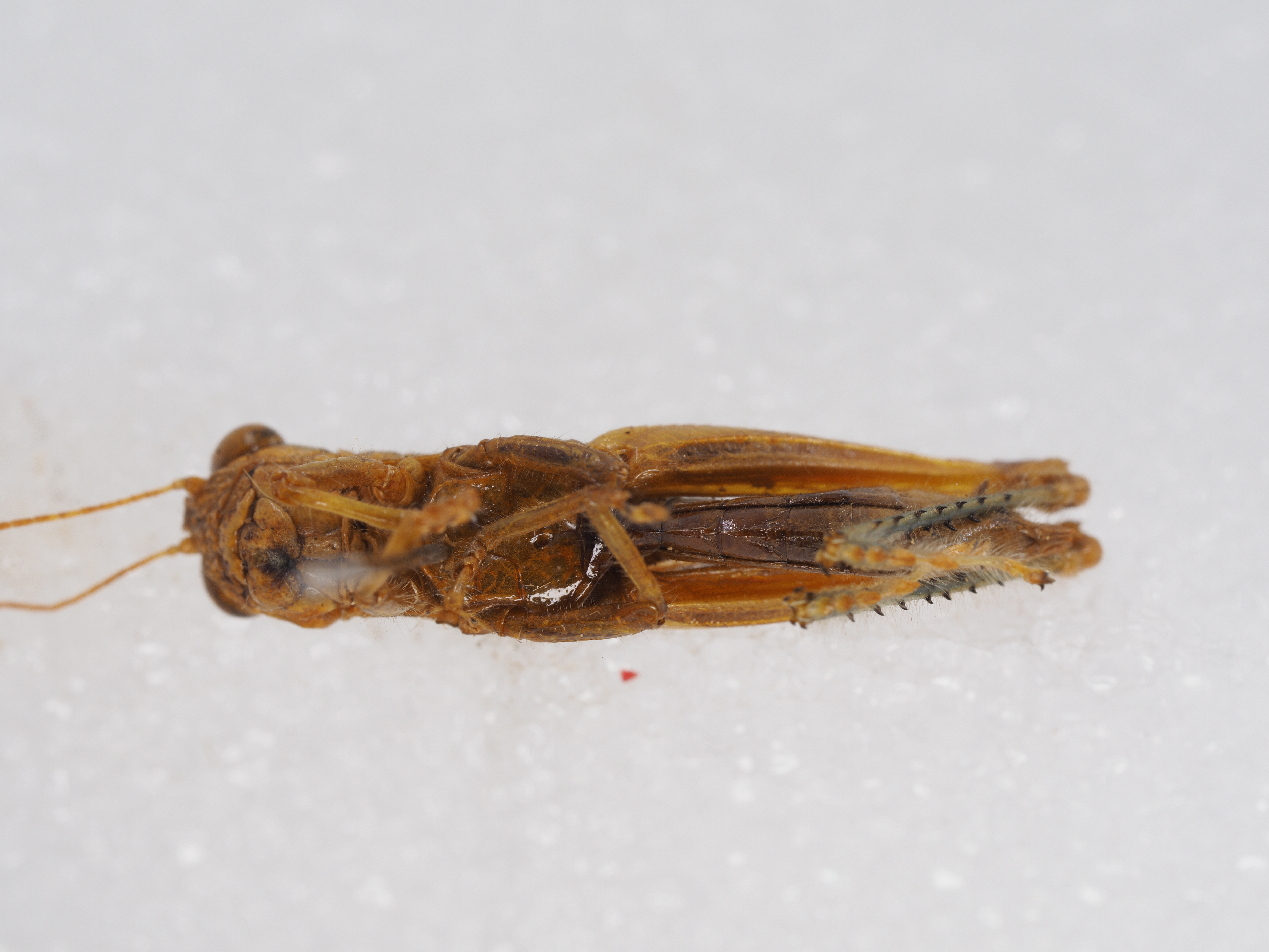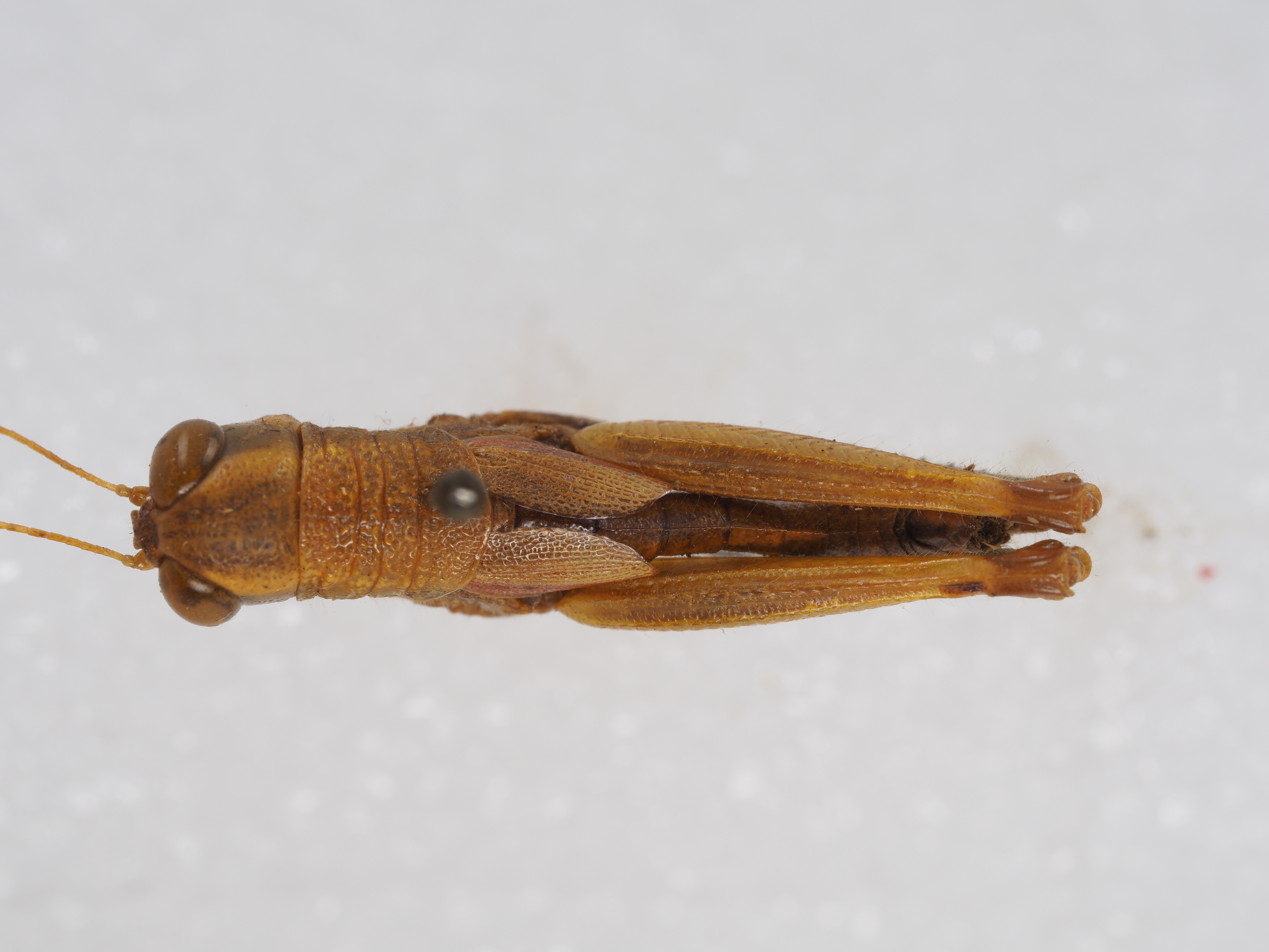 描述:雄性 体略粗壮,中小型,具粗密颗粒和刻点及稀疏绒毛。头大而短,短于前胸背板。头顶略呈梯形,前缘较平,两侧缘明显隆起,背面具较宽的凹陷。头侧窝消失。颜面倾斜,具较粗大的刻点;颜面隆起在中单眼之下消失或极不明显。复眼卵圆形,较突出,其垂直直径约为水平直径的1.3倍,几乎与眼下沟等长。触角丝状,细长,共25节,到达后足股节中部,触角中段一节的长度约为其宽度的4.4~5倍。前胸背板前缘的中部略突出,缺凹口,后缘宽圆;中隆线不甚明显,仅在中横沟之后隐约可见,缺侧隆线;3条横沟均明显,并都割断中隆线;沟前区长约为沟后区长的1.6~1.8倍。前胸腹板突短锥形,顶端狭锐。中胸腹板侧叶的长与宽大致相等,其宽度约为中隔宽度的1.40~1.42倍。后胸腹板侧叶在凹窝后彼此毗连。前翅长椭圆形,端部狭圆,到达或略超过第2腹节的后缘;两前翅在背后常彼此分开,有时毗连。后翅甚小,约为前翅长的1/3~1/2。后足股节上侧的中隆线略见细齿;在外侧上、下隆线之间具明显的羽状平行隆线;下膝侧片顶端较圆。后足胫节缺外端刺,沿其外缘具刺7~9个,内缘具刺8~9个,具有内端刺。后足跗节到达或略超过胫节中部,中垫发达,其长度约为爪长的2倍。腹部第1节背板侧面具有发达的鼓膜器,略呈肾形;最后一节尾片小而明显。肛上板近乎侧梯形,两侧向内弯曲,端部中央具有三角形突出,背面有中纵沟和侧纵沟,中纵沟在中部消失。下生殖板粗短,端部宽圆。尾须侧扁,呈扁锥状,到达或略超过肛上板的端部。