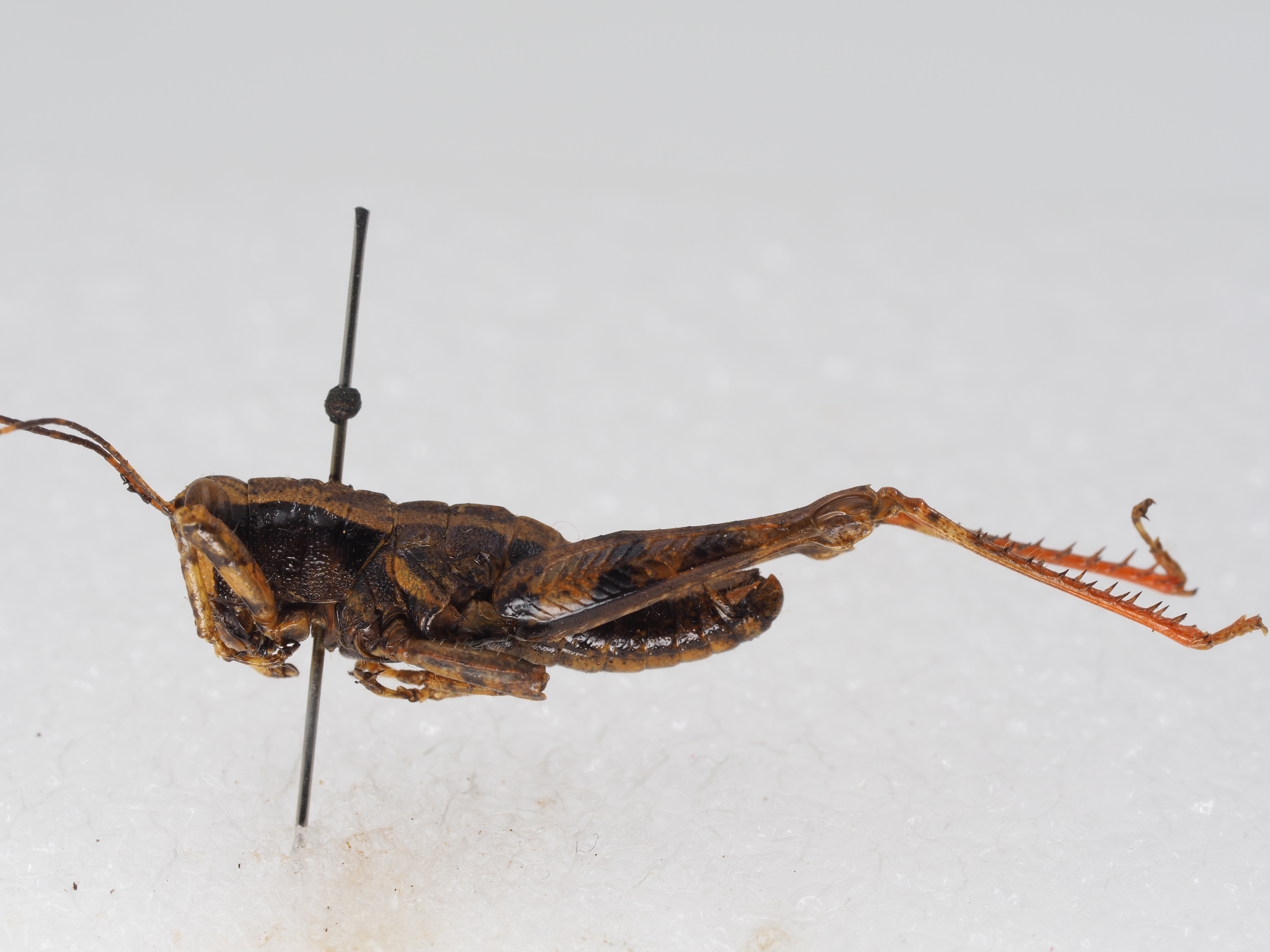 体色:全体呈栗褐色。头顶浅黄色,中央具一暗褐色条纹;头侧窝具有黑色圆斑点。颜面浅黄色,眼后区和眼下区亮浅黑褐色。触角暗褐色,近端部有一白色环。前胸背板在沟前区有一个宽的倒三角形斑,沟后区有一条浅黑褐色的宽带。前胸背板侧片上半部亮黑褐色,下半部褐色。中、后胸背板中央具浅黑褐色的纵条纹,侧板暗褐色,腹板亮黑色。腹部背板侧面具一条大的亮黑色条纹。后足股节浅褐色,具有3条斜的浅黑褐色的环,位于基部、中部及近端部;底侧内缘浅红色;下膝侧片具暗褐色斑。后足胫节亮红色,基部外侧具污浅褐色斑,刺端黑色。