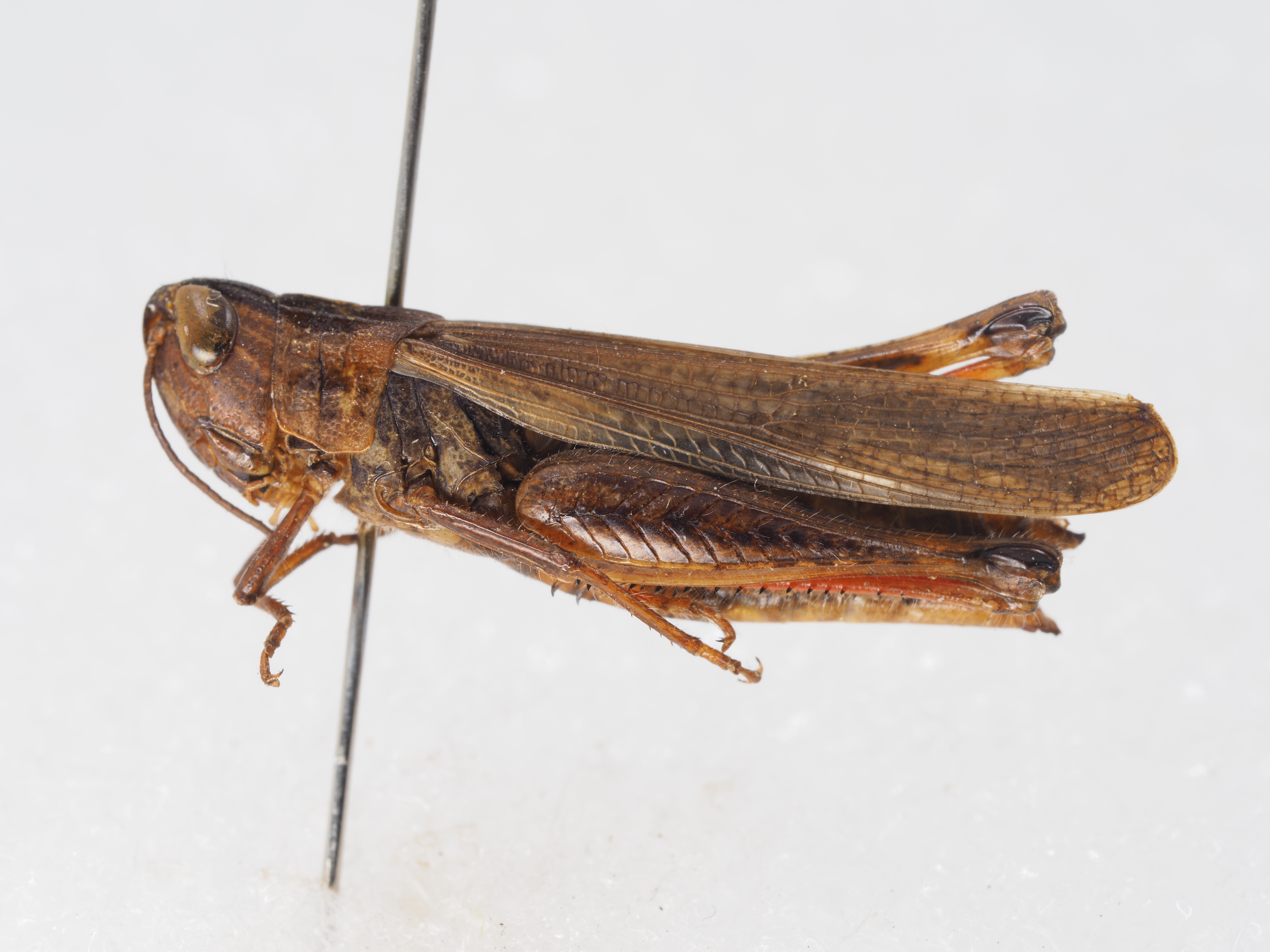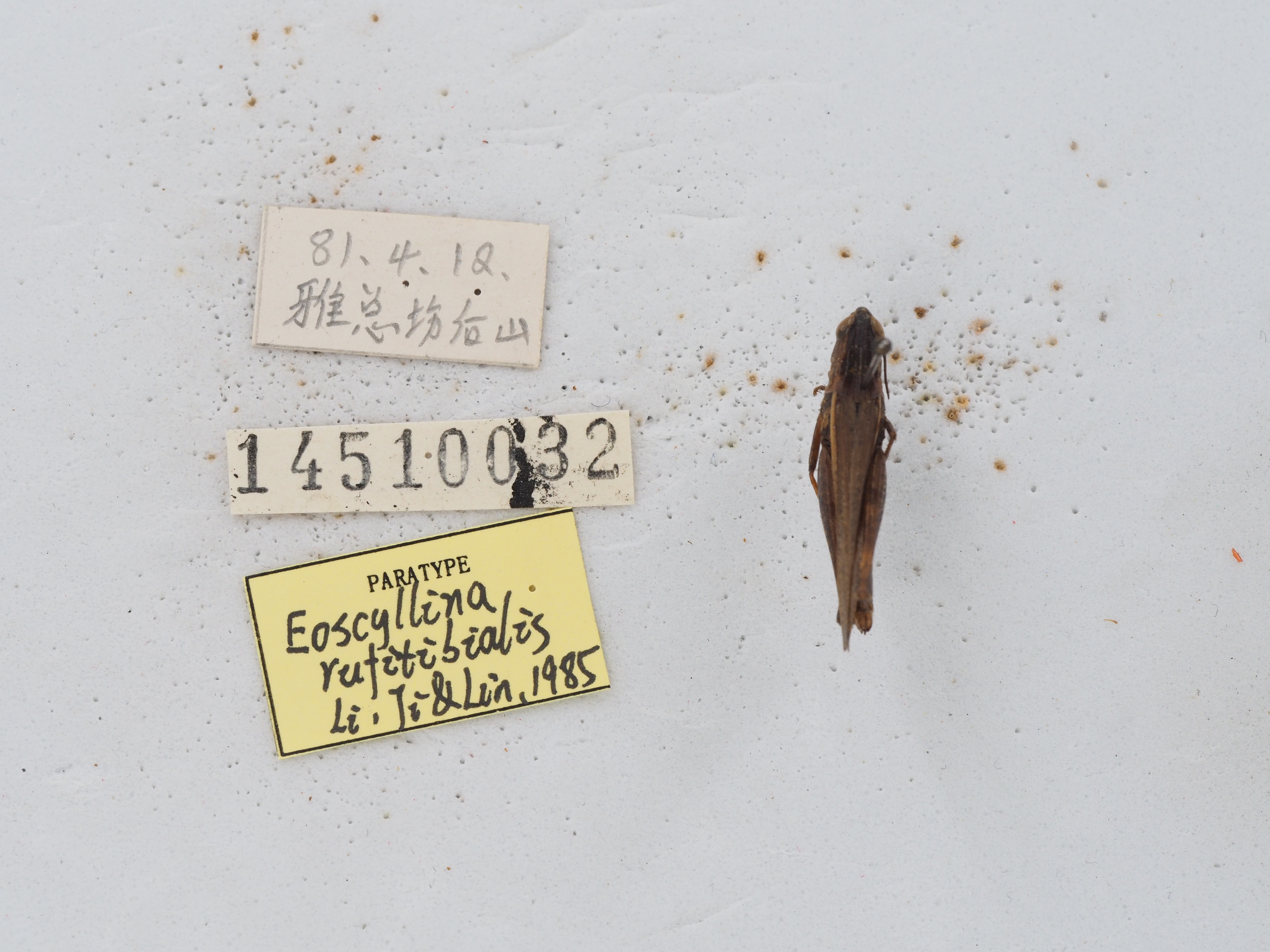 描述:雄性 体中小型,具细刻点。头顶较短,前缘钝圆形;头顶在复眼间的距离为颜面隆起在触角之间宽度的1.25倍;头顶最宽处的距离为复眼前缘至头顶顶端距离的1.35倍。头侧窝大而明显,长方形,背观可见。后头在复眼之间向后稍纵隆起,近后缘渐弱宽,具细刻点。颜面侧观明显向后倾斜,与头顶组成锐角;颜面隆起在中单眼之上较平坦,其下具不明显的浅纵沟,不到达唇基(图63c),具粗、且稀的刻点。复眼卵圆形。其纵径为横径的1.5倍,约为眼下沟长的2.5倍。触角剑状,25节,基部8节宽扁,其余近似圆柱状,中段一节长约为宽的1.5倍。前胸背板前缘平直,后缘钝角形,中隆线与侧隆线均明显,两侧隆线在前横沟前近乎平行,其后渐向外扩展;三条横沟均明显,中横沟较弱,仅后横沟切断中隆线,后横沟位于前胸背板的中部(图63b)。前胸背板侧片中部略内陷,其前下角为钝角,后下角近乎直角,后缘较平直。前胸腹板在前足基部之间略隆起。中胸腹板中隔近乎梯形,其长度狭于侧片宽度。后胸腹板侧叶后端互相毗连,凹窝呈鸡心形。前、后翅均发达,超过后足股节顶端甚远,端部圆形(图63a)。后足股节匀称,上隆线平滑,下膝侧片端部圆形。后足胫节内、外侧各具刺12个,缺外端刺;内侧距不等长,其下距明显较长于上距;跗节爪间中垫较发达,明显超过爪的中部。鼓膜器发达。肛上板三角形;中央纵沟中部之前较宽,中部之后渐狭窄,不到达端部,中部斜隆线明显。尾须扁锥形,基部较宽,端部略尖,不到达肛上板的顶端。下生殖板较短,顶端略尖(图63d)。