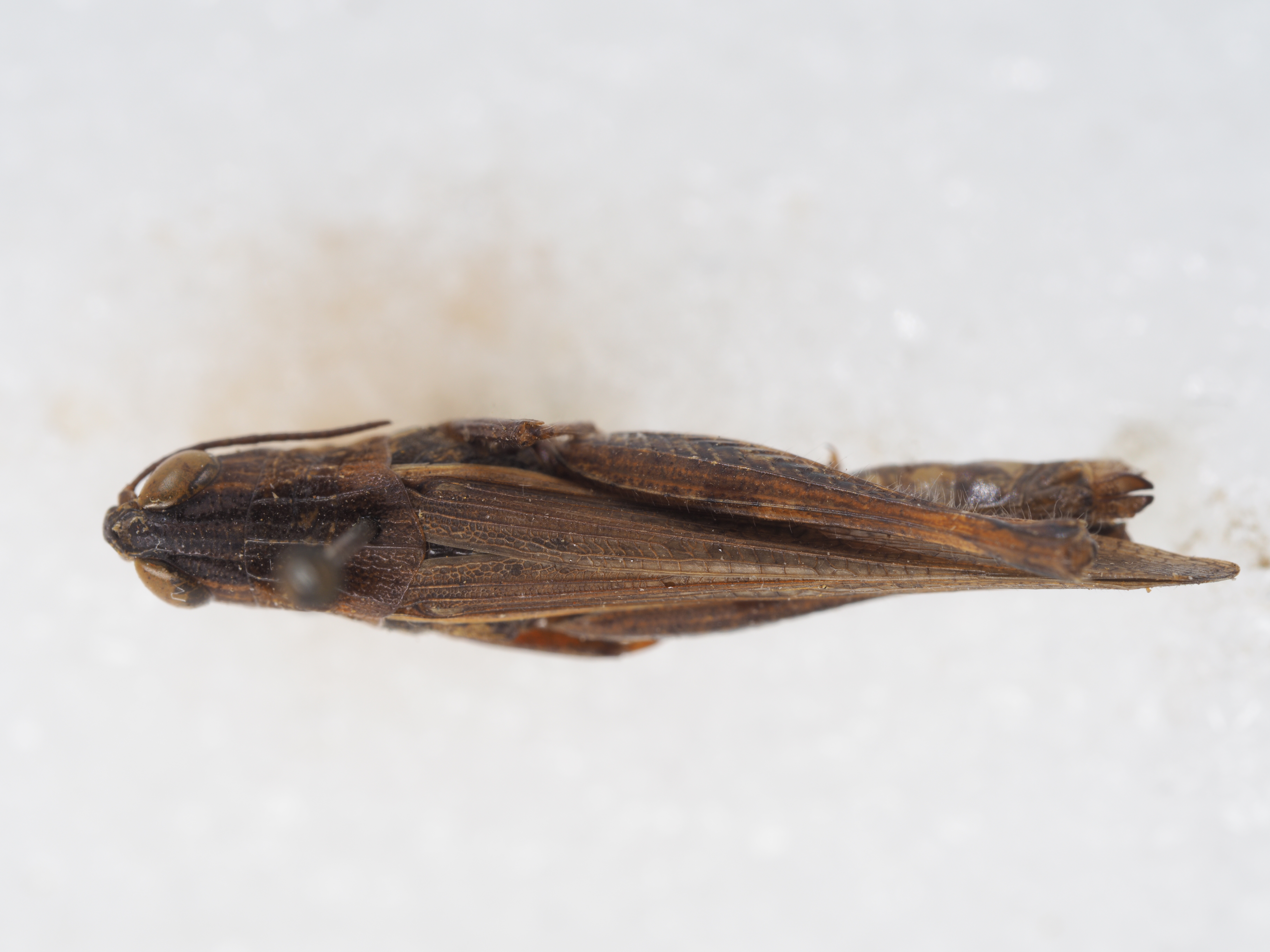 体色 体为淡褐色。头部、前胸背板及前、中足均为黑褐色。复眼和触角茶褐色。后头两侧向后沿前胸背板侧隆线具1条黑褐色宽纵带。前翅暗褐色,后翅烟色。前中足淡黄褐色。后足股节褐色,膝部亮黑色,在外侧中区具一黑褐色纵条纹,底侧淡褐色。