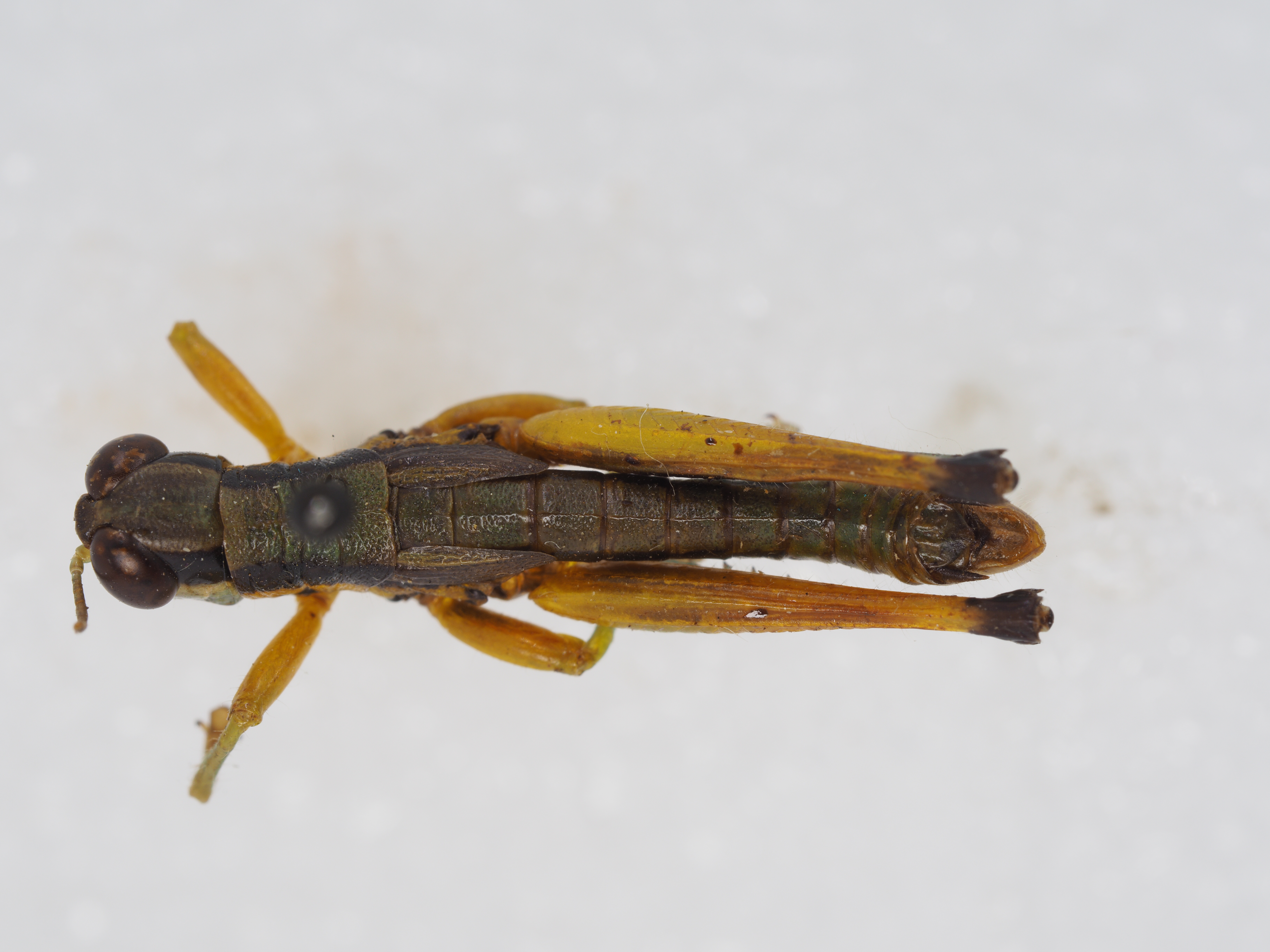 体色:体背蓝墨绿色。颜面绿色,复眼深褐色,眼后带黑褐色,直延至第7腹节,在眼后带之下,自复眼后缘向后有一条淡黄色纵条纹,直延至第8腹节。触角淡褐色,端部色较深。前翅暗褐色。前、中足黄绿色。后足股节基2/3黄绿色,端1/3黄褐色,膝部黑色。后足胫节蓝色,基部黑色。跗节绿色。