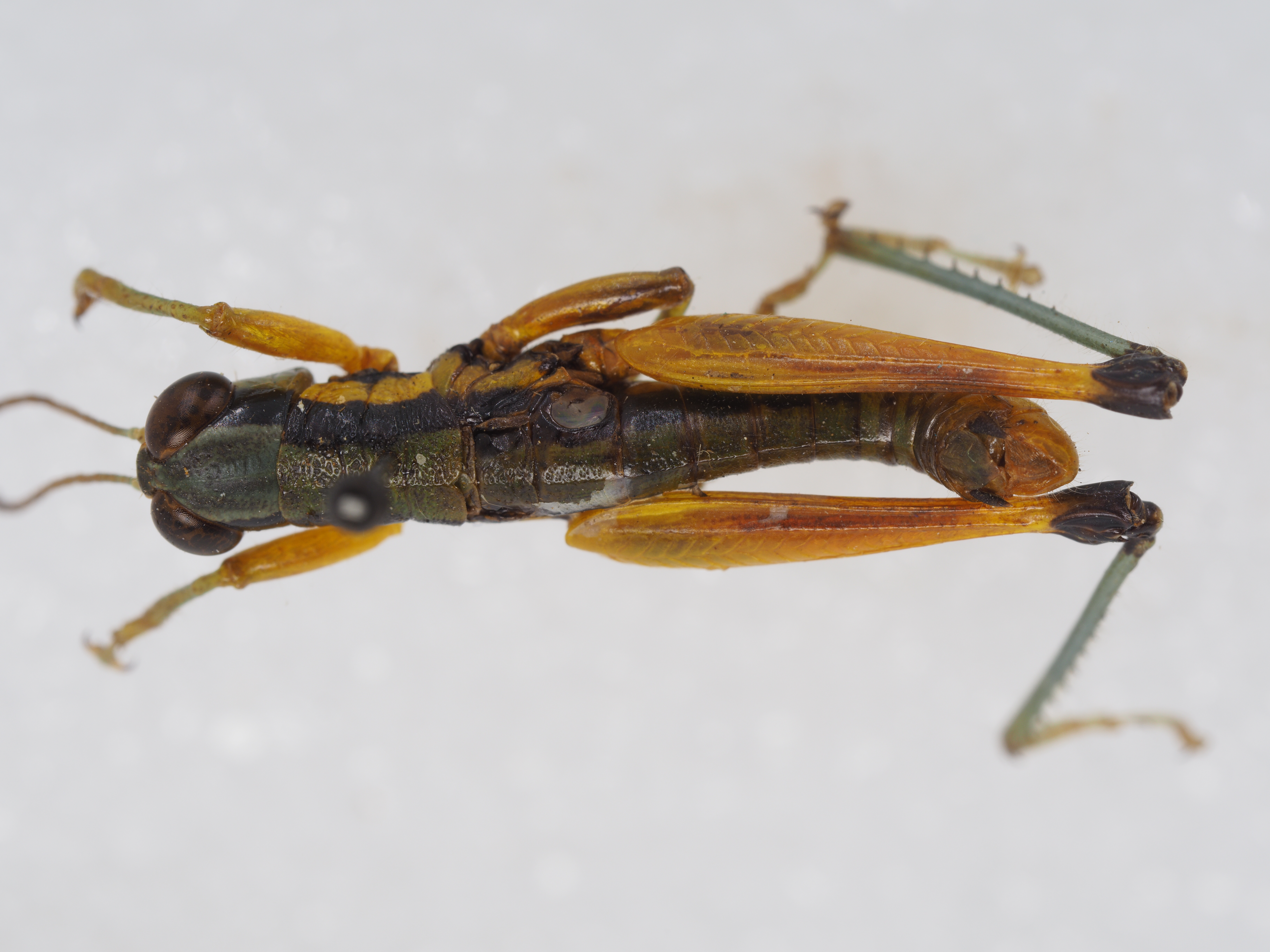 体色:体背蓝墨绿色。颜面绿色,复眼深褐色,眼后带黑褐色,直延至第7腹节,在眼后带之下,自复眼后缘向后有一条淡黄色纵条纹,直延至第8腹节。触角淡褐色,端部色较深。前翅暗褐色。前、中足黄绿色。后足股节基2/3黄绿色,端1/3黄褐色,膝部黑色。后足胫节蓝色,基部黑色。跗节绿色。