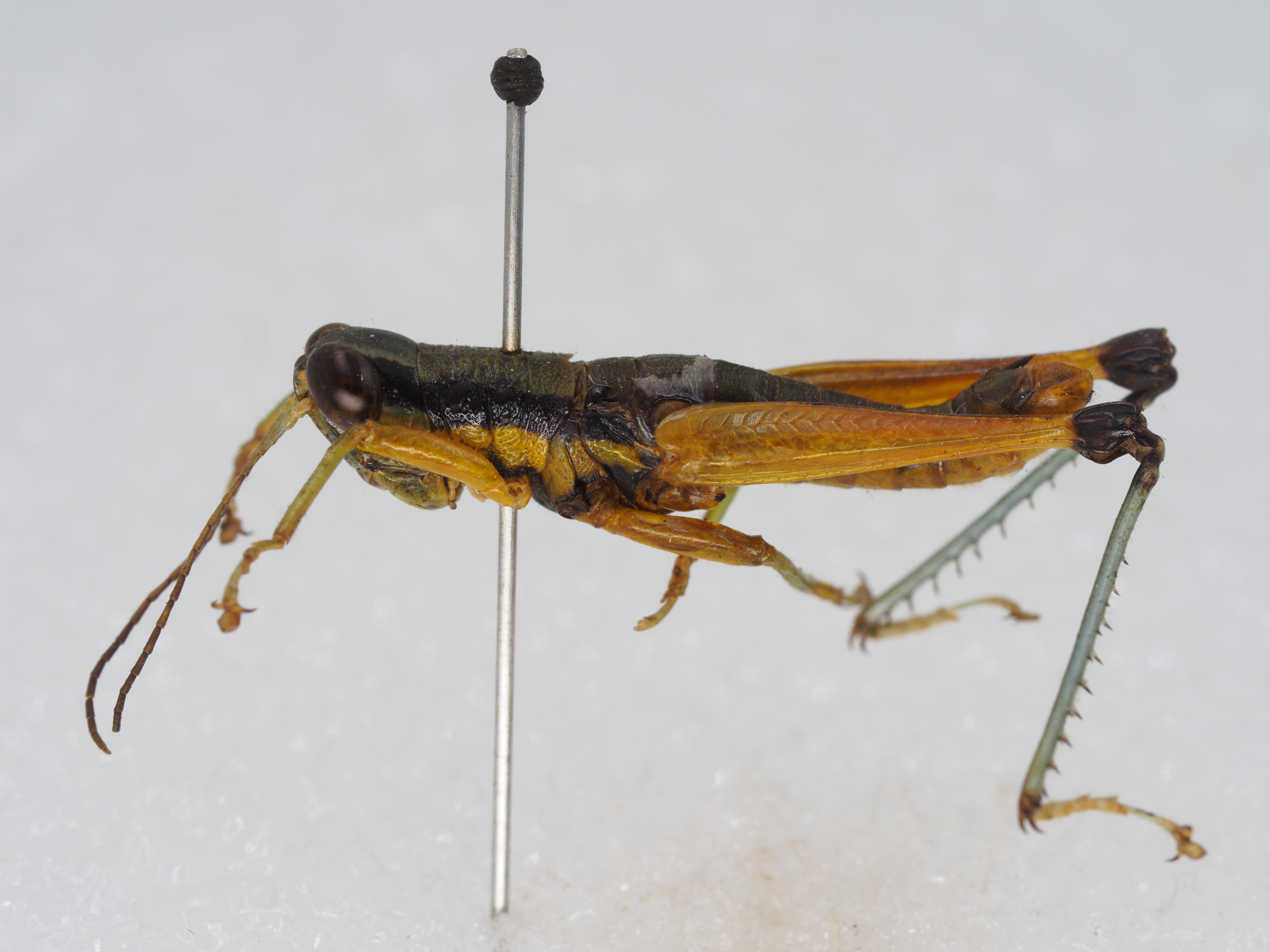 描述:雄性 体中小型,匀称。头顶宽短,顶圆形,眼间距较宽,其宽度为颜面隆起在触角之间宽的1.8~2倍。颜面侧观向后倾斜,颜面隆起较狭,全长具纵沟,侧缘近平行,在中央单眼之下略收缩。复眼大而突出,卵圆形,复眼的垂直直径为横径的1.5~1.7倍,而为眼下沟长度的2~2.76倍。触角丝状,到达后足股节的基部,中段一节的长度为宽度的2.4~3倍。前胸背板圆柱状,密布刻点和皱纹;前缘圆弧形,中央凹陷,后缘中央呈宽浅三角形凹人;中隆线明显,或在前横沟前较不明显,缺侧隆线;3条横沟均明显,后横沟位于背板近后端,沟前区长度为沟后区长度的2倍。前胸腹板突圆锥形,顶端尖锐。中胸腹板侧叶宽略大于长,中隔较狭,长为宽的3倍。后胸腹板侧叶在后端相毗连。前翅较狭长,长为宽的2.3~2.5倍,翅顶圆形,超过第1腹节背板的后缘。后翅微小。后足股节匀称,长为宽的5倍,上侧之中隆线光滑;下膝侧片顶端尖锐。后足胫节圆柱状,外缘具刺9个(包括外端刺),内缘具刺9~10个(包括内端刺)。后足跗节的长度几达胫节之一半,跗节爪间中垫较大,与爪等长或超过爪长。鼓膜器发达,鼓膜孔卵圆形。腹部末节背板后缘具小尾片。肛上板宽三角形,中央具纵沟,纵沟在中部之后渐消失。尾须圆锥形,顶端较尖,与肛上板等长。下生殖板短锥形,顶端较钝。阳具基背片如图75f。