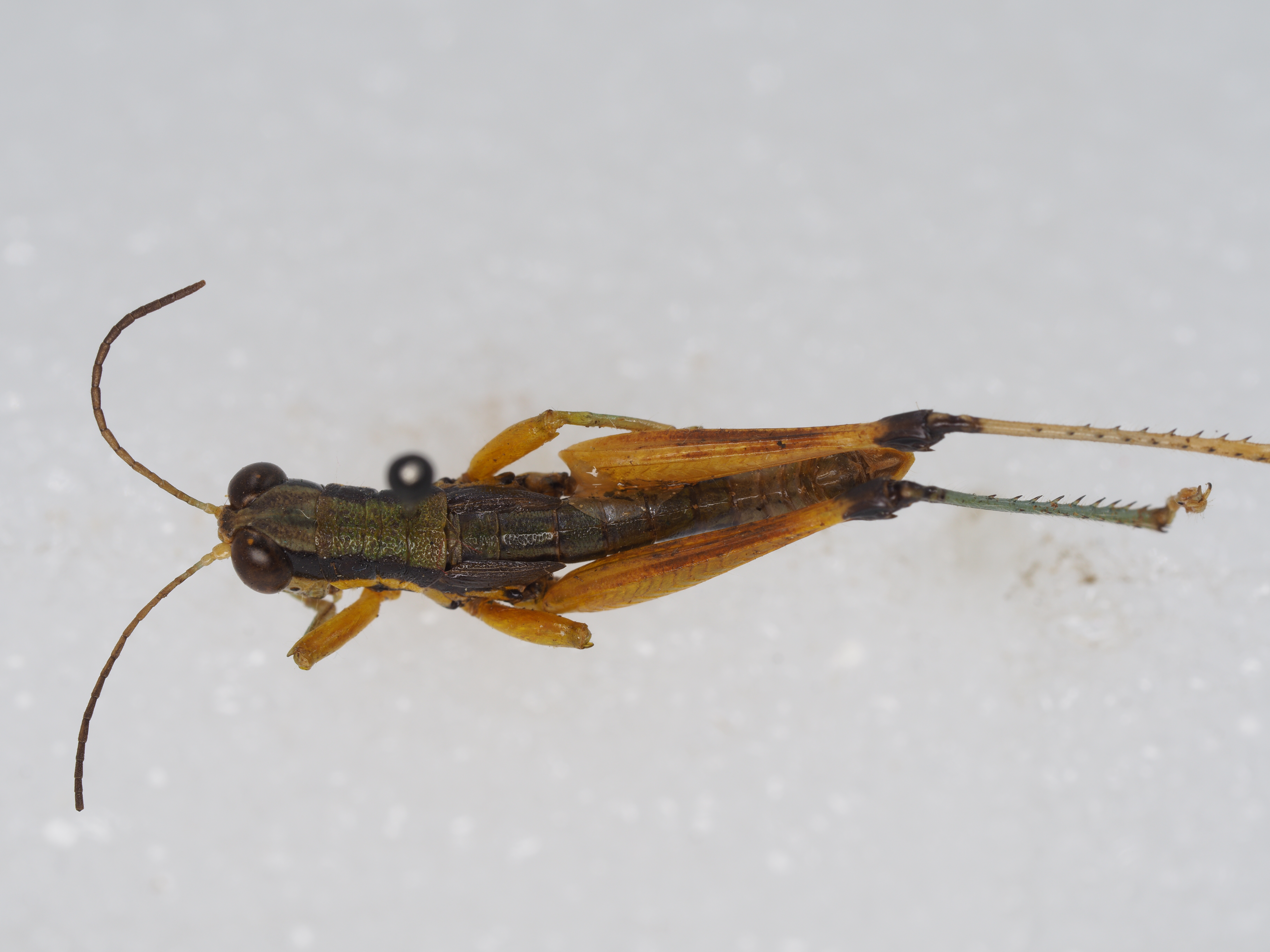 体长:♂18.6~21.5mm,旱24.7~28.5mm;前胸背板:♂3.0~3.9mm,♀4.9~5.5mm;前翅:♂3.4~4.1mm,♀3.7~4.8mm;后足股节:♂11.0~12.1mm,♀13.7~16.0mm。