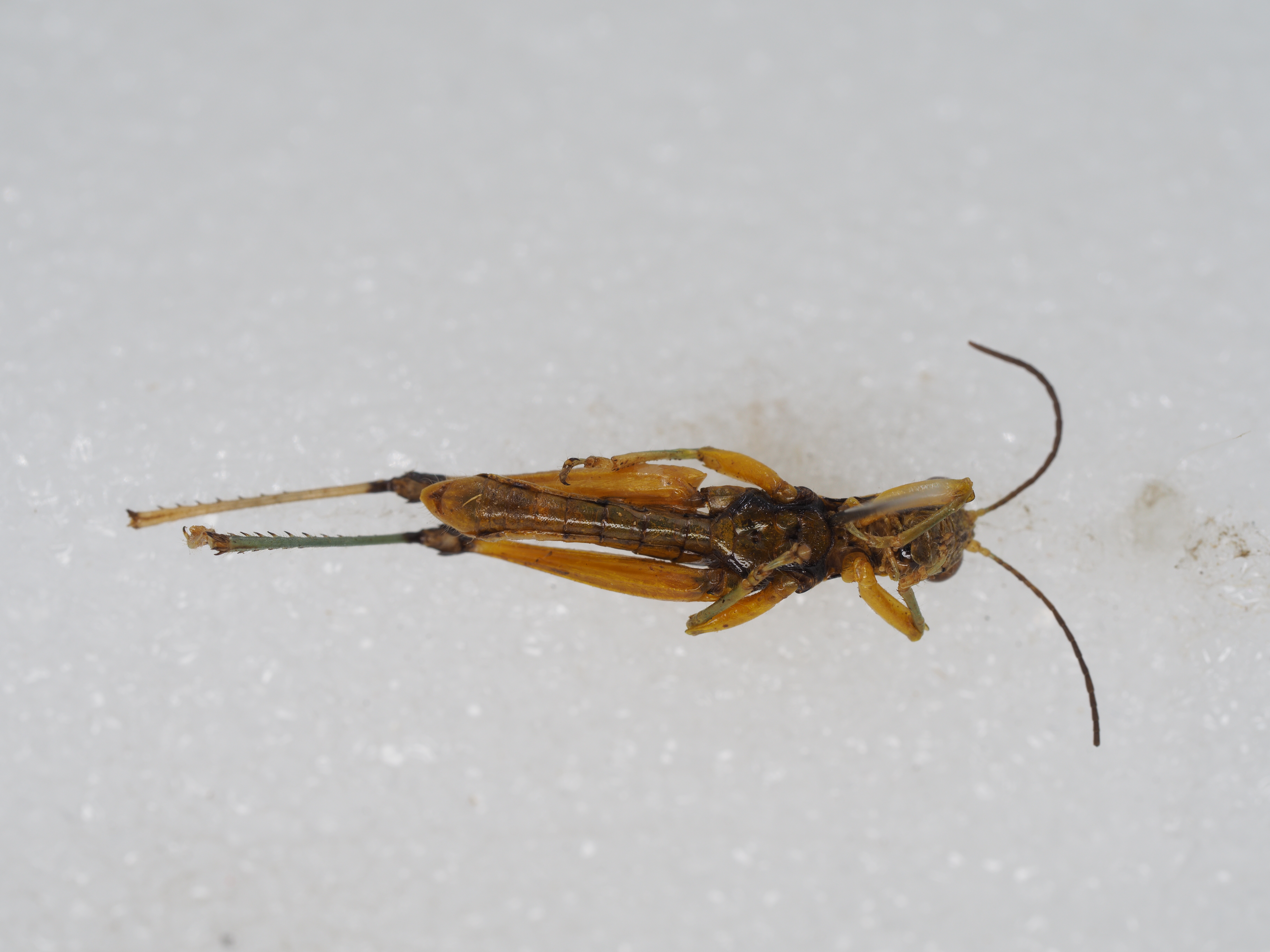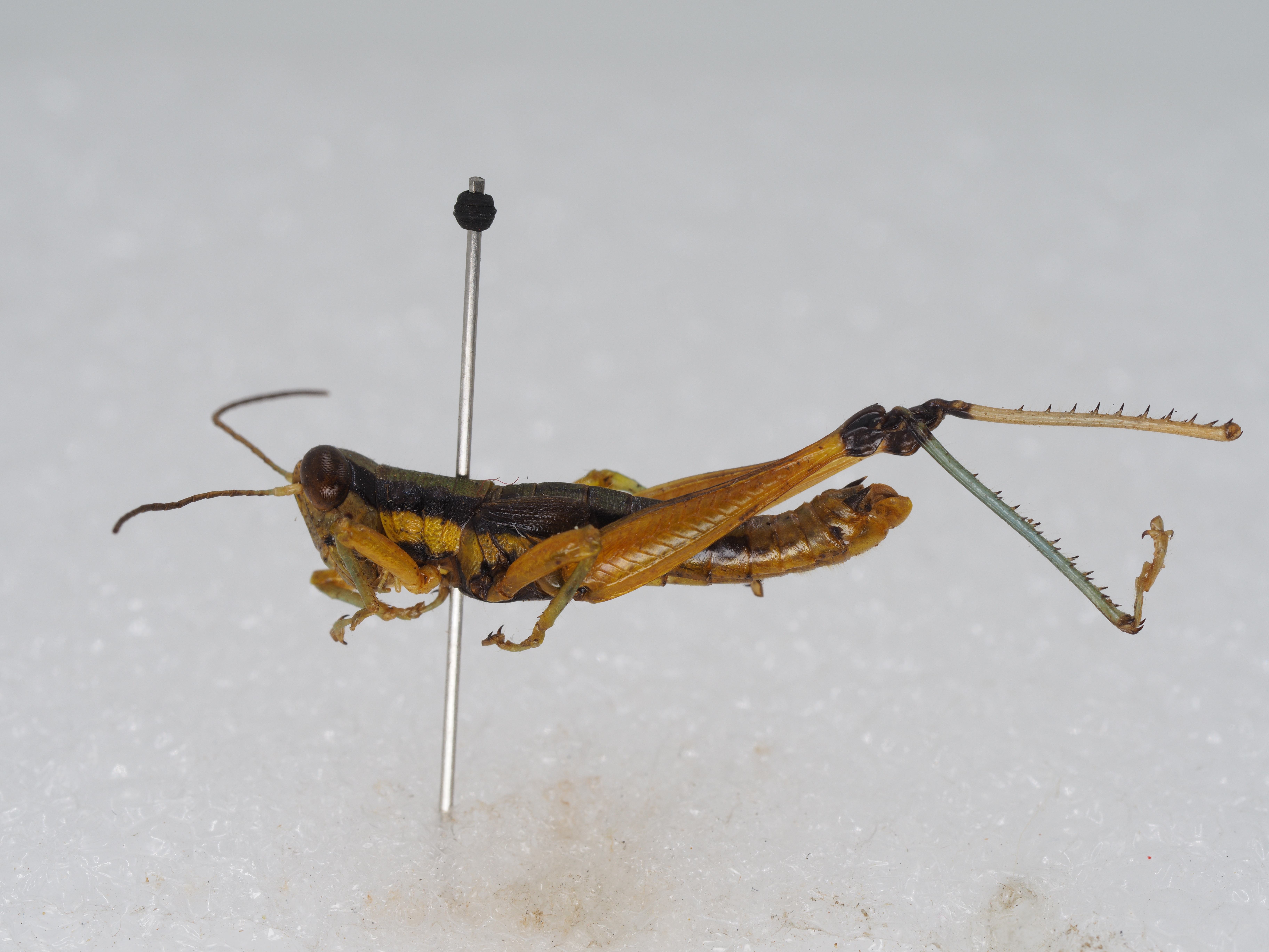 描述:雄性 体中小型,匀称。头顶宽短,顶圆形,眼间距较宽,其宽度为颜面隆起在触角之间宽的1.8~2倍。颜面侧观向后倾斜,颜面隆起较狭,全长具纵沟,侧缘近平行,在中央单眼之下略收缩。复眼大而突出,卵圆形,复眼的垂直直径为横径的1.5~1.7倍,而为眼下沟长度的2~2.76倍。触角丝状,到达后足股节的基部,中段一节的长度为宽度的2.4~3倍。前胸背板圆柱状,密布刻点和皱纹;前缘圆弧形,中央凹陷,后缘中央呈宽浅三角形凹人;中隆线明显,或在前横沟前较不明显,缺侧隆线;3条横沟均明显,后横沟位于背板近后端,沟前区长度为沟后区长度的2倍。前胸腹板突圆锥形,顶端尖锐。中胸腹板侧叶宽略大于长,中隔较狭,长为宽的3倍。后胸腹板侧叶在后端相毗连。前翅较狭长,长为宽的2.3~2.5倍,翅顶圆形,超过第1腹节背板的后缘。后翅微小。后足股节匀称,长为宽的5倍,上侧之中隆线光滑;下膝侧片顶端尖锐。后足胫节圆柱状,外缘具刺9个(包括外端刺),内缘具刺9~10个(包括内端刺)。后足跗节的长度几达胫节之一半,跗节爪间中垫较大,与爪等长或超过爪长。鼓膜器发达,鼓膜孔卵圆形。腹部末节背板后缘具小尾片。肛上板宽三角形,中央具纵沟,纵沟在中部之后渐消失。尾须圆锥形,顶端较尖,与肛上板等长。下生殖板短锥形,顶端较钝。阳具基背片如图75f。