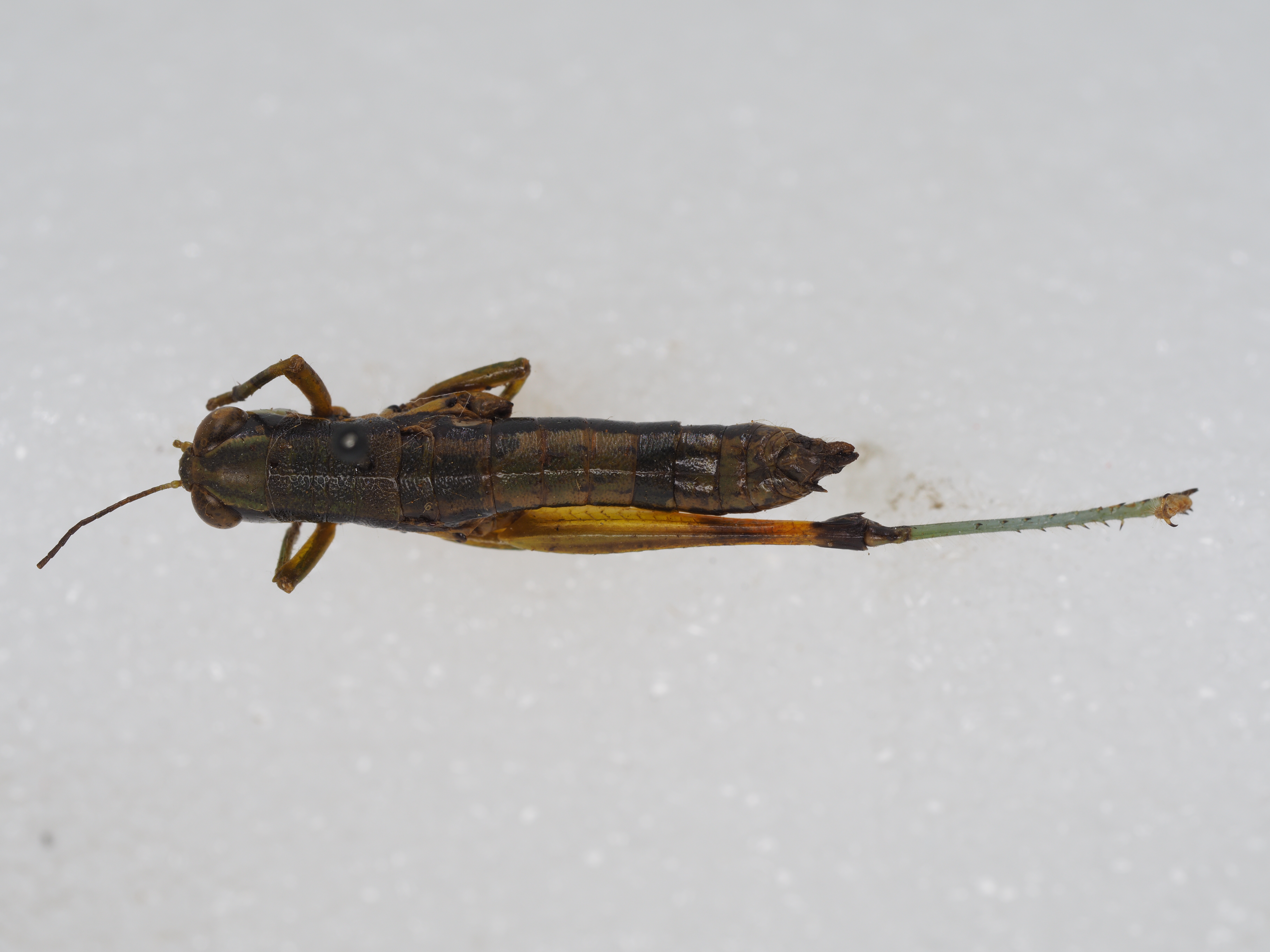 体长:♂18.6~21.5mm,旱24.7~28.5mm;前胸背板:♂3.0~3.9mm,♀4.9~5.5mm;前翅:♂3.4~4.1mm,♀3.7~4.8mm;后足股节:♂11.0~12.1mm,♀13.7~16.0mm。