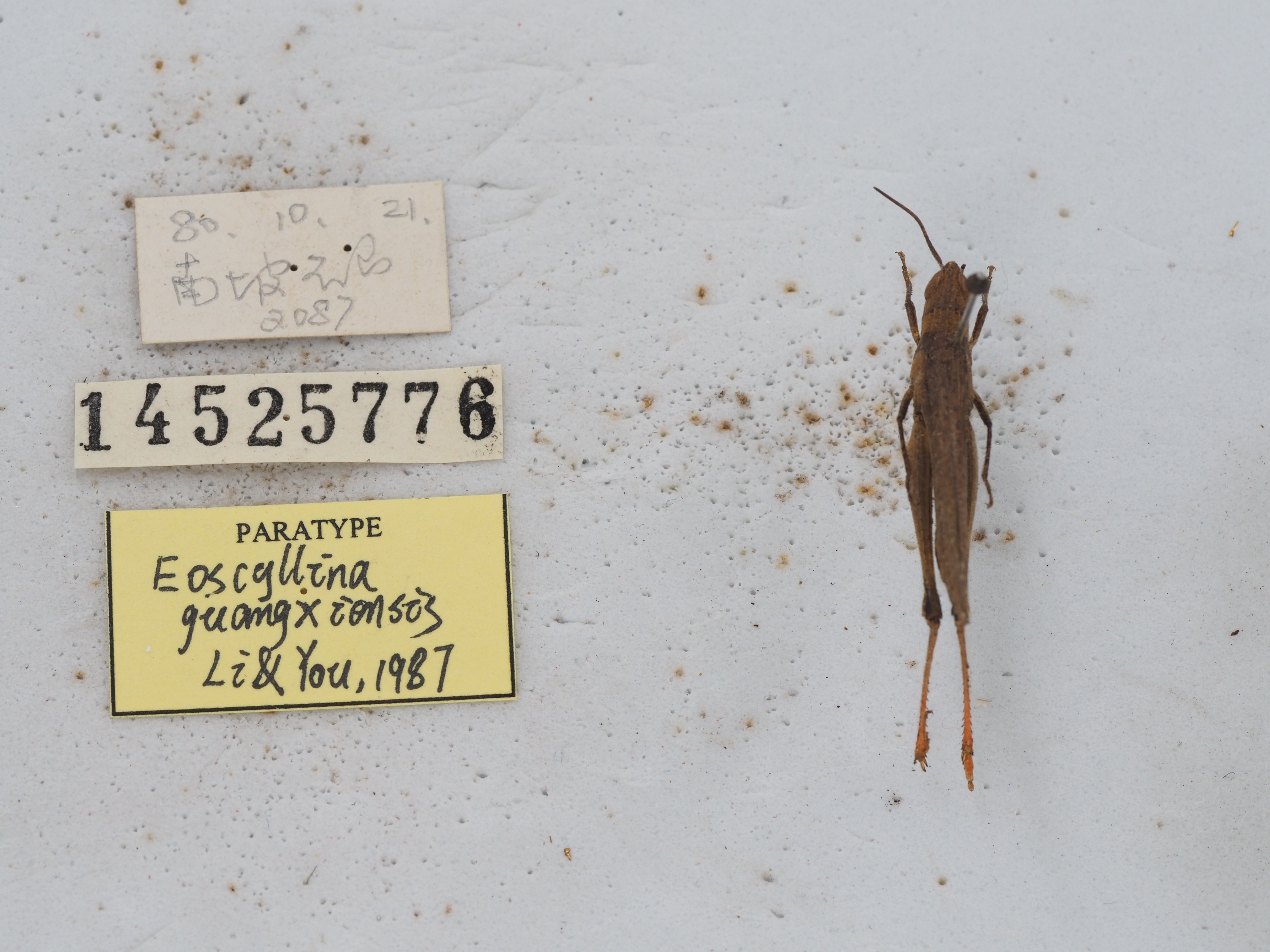 描述:雄性 体中小型。头短于前胸背板。头顶呈三角形,在两复眼前缘之间明显低凹,中间具一横沟,并向后延伸与前胸背板的中隆线相接。头侧窝在背面明显,略呈长方形,长为宽的2.1倍。颜面明显隆起,在两触角之间几乎平行,触角基部以上趋狭,中部以下略向外扩展,并延伸至唇基。复眼卵圆形,较突出,其纵径为横径的1.4倍,约为眼下沟长的3倍。触角丝状,共26节,基部10节宽扁,其余节为圆柱状。前胸背板后缘略呈三角形突出,顶端较圆,侧隆线在沟后区略向内弯。三条横沟均明显,仅后横沟切断中隆线;沟后区长于沟前区。前胸背板侧片后缘下侧之半略向前凹。中胸腹板侧叶长与宽几相等,两侧叶之中隔长略大于宽。前、后翅均发达,超过后足股节顶端,前翅末端微斜切(图59a)。后足股节上侧的中隆线光滑无细齿;后足胫节外侧具刺11个,下距长为上距的1.5倍。腹部末节背板后缘具有两个略呈圆形的尾片。肛上板三角形,顶端呈圆形突出,基部具短而浅的纵沟。尾须圆锥形,不向外扩展,仅达肛上板的末端。下生殖板向后延伸,较狭长,顶端略尖(图59b)。阳具基背片如图59c。