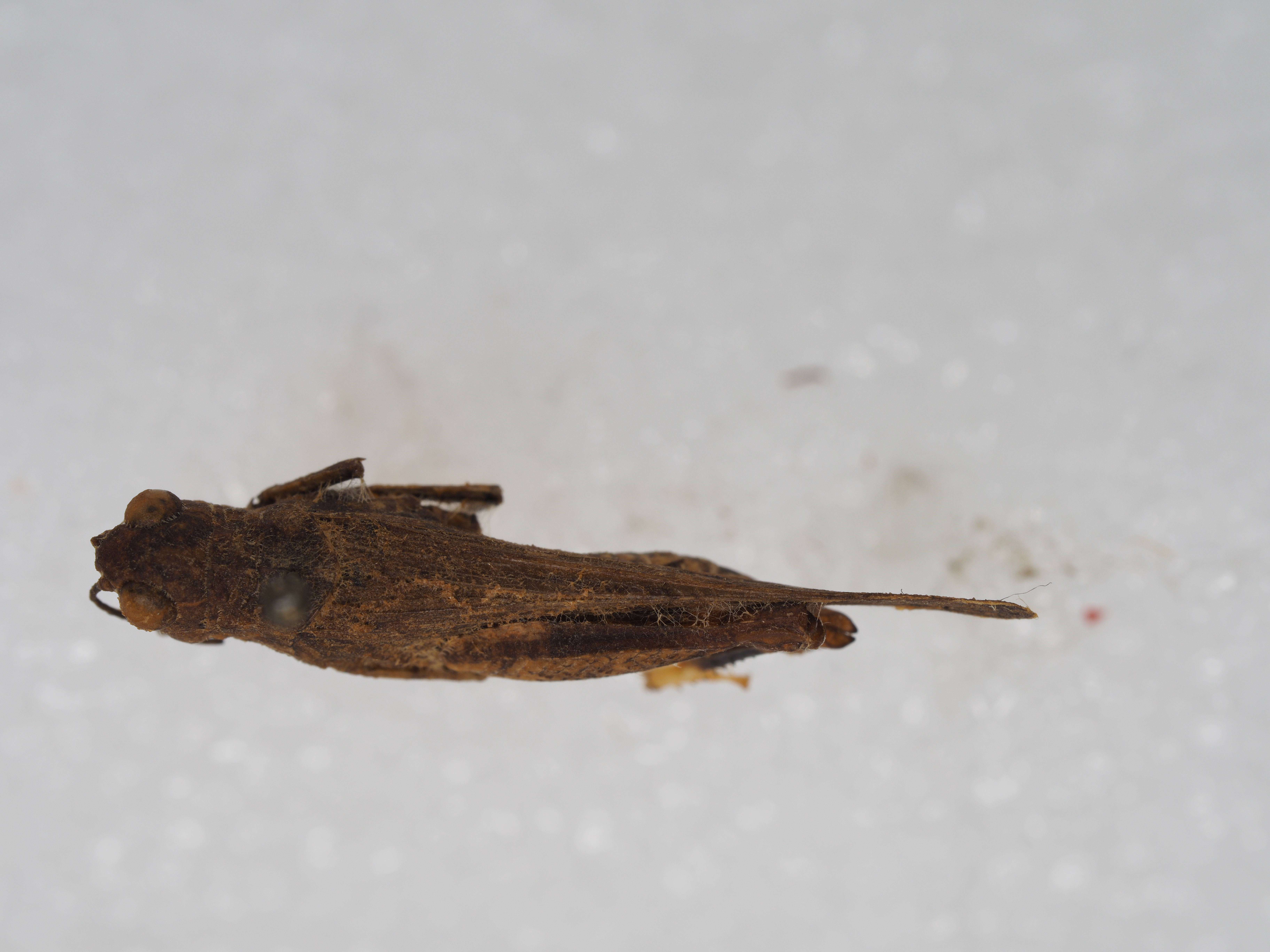 描述:雄性 小型。头较大,高出于前胸背板(图80)。头顶宽短,头侧窝三角形。颜面隆起宽平,在顶端略凹,在中眼以下凹陷较深。复眼近圆形(图80),大而突出。触角丝状,向后超过前胸背板后缘。前胸背板短,后缘钝角形突出。中隆线明显,侧隆线在沟前区前横沟之前呈一颗粒状隆起,在沟后区呈一条线状,较明显。前胸腹板在前足之间略微