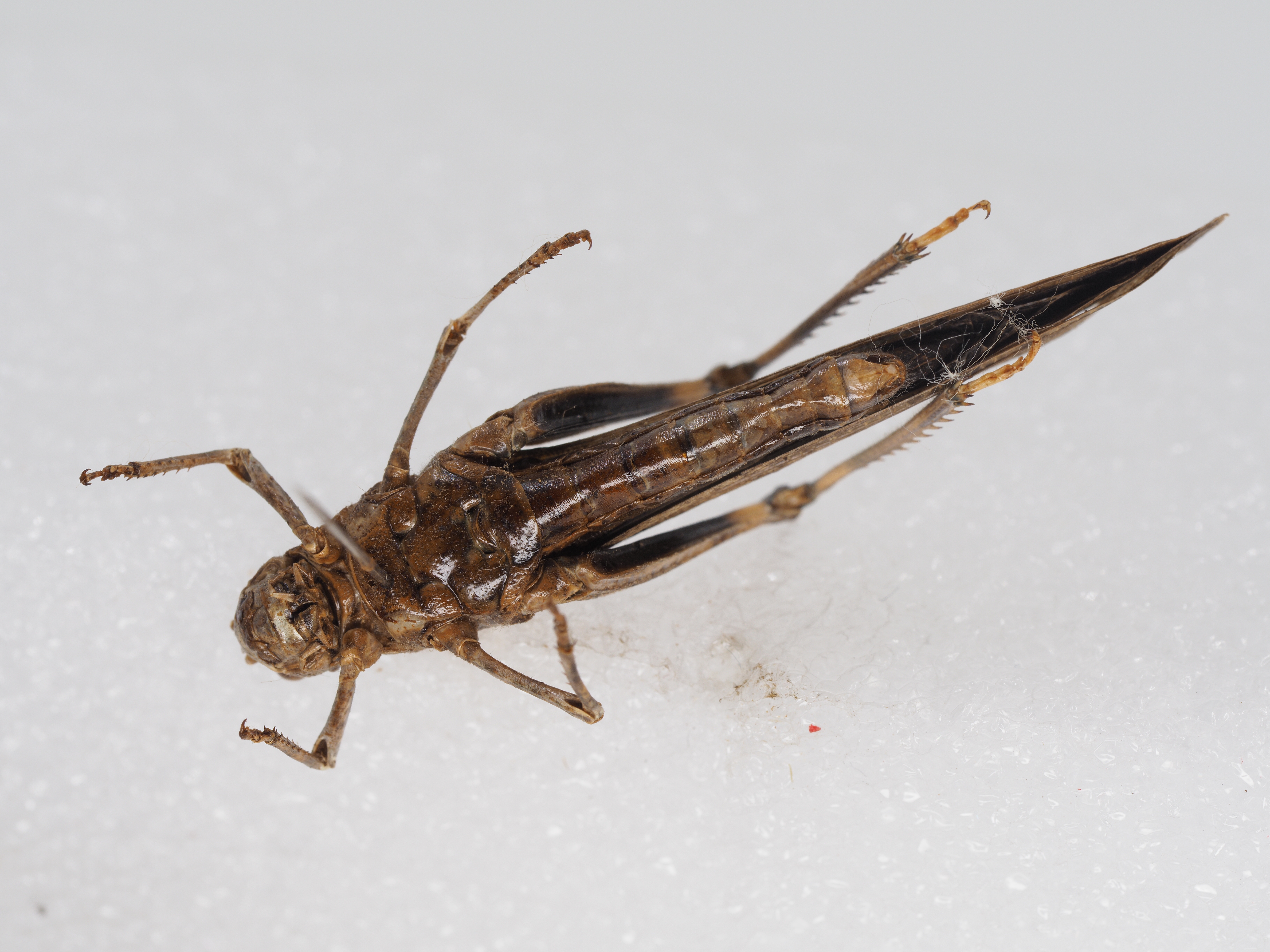 雌性 体粗短,笨拙。头侧窝不明显。触角较短,长度可到达前胸背板后缘。前胸背板沟后区长度为沟前区长度的1.4-1.5倍。中胸腹板侧叶间中隔的宽为长的3-3.7倍。前翅短缩,到达腹部第5节或肛上板之基部,不到达后足股节之顶端;中脉域具中闰脉。后翅较小,三角形,其长度超过前翅之一半。后足股节较粗短,其长度为宽度的3-3.5倍。后足胫节外侧具刺9-11个,内侧具刺9-10个。肛上板三角形,中部具横沟。尾须短锥形。上产卵瓣之上外缘具不规则的钝齿。