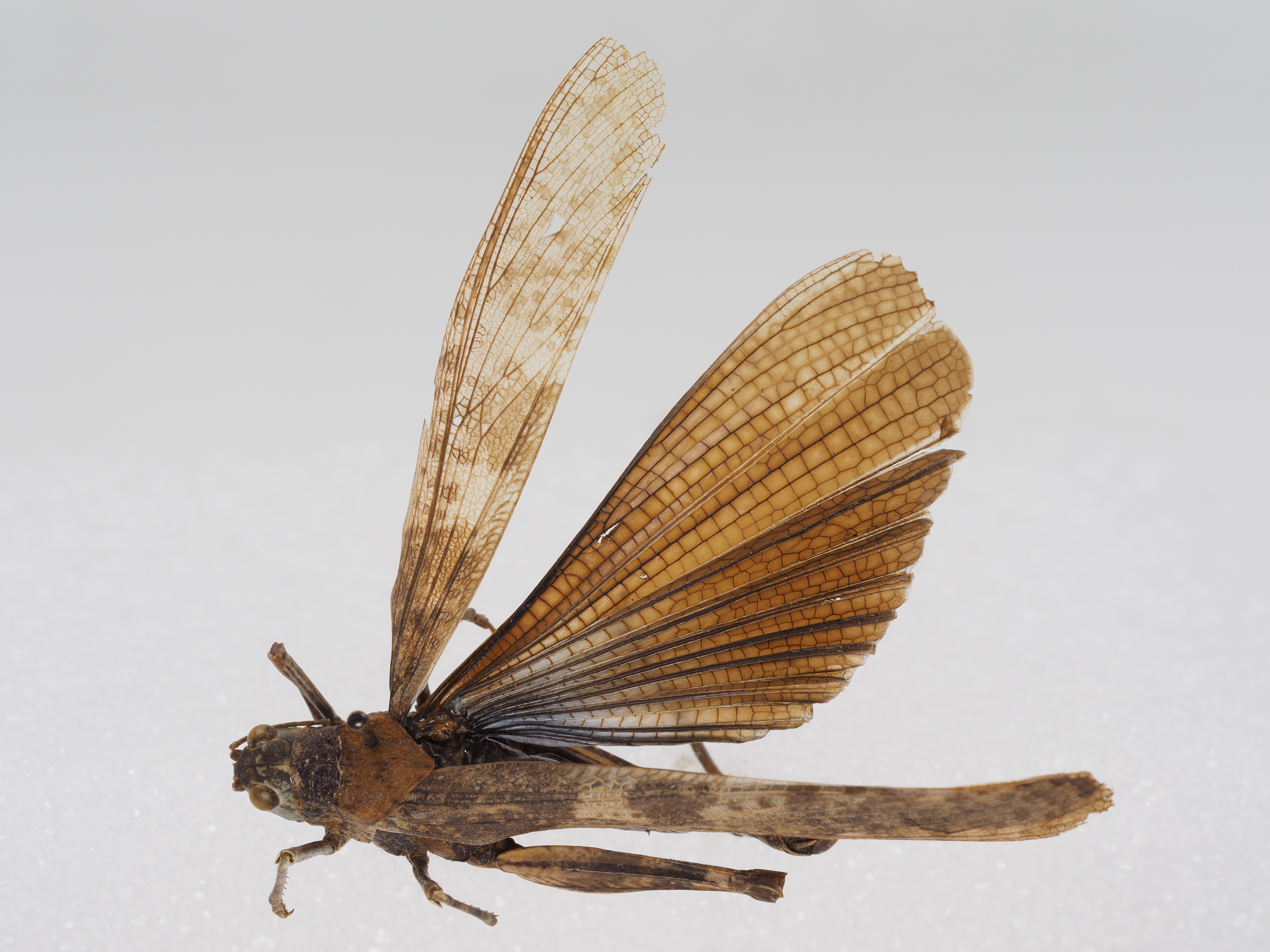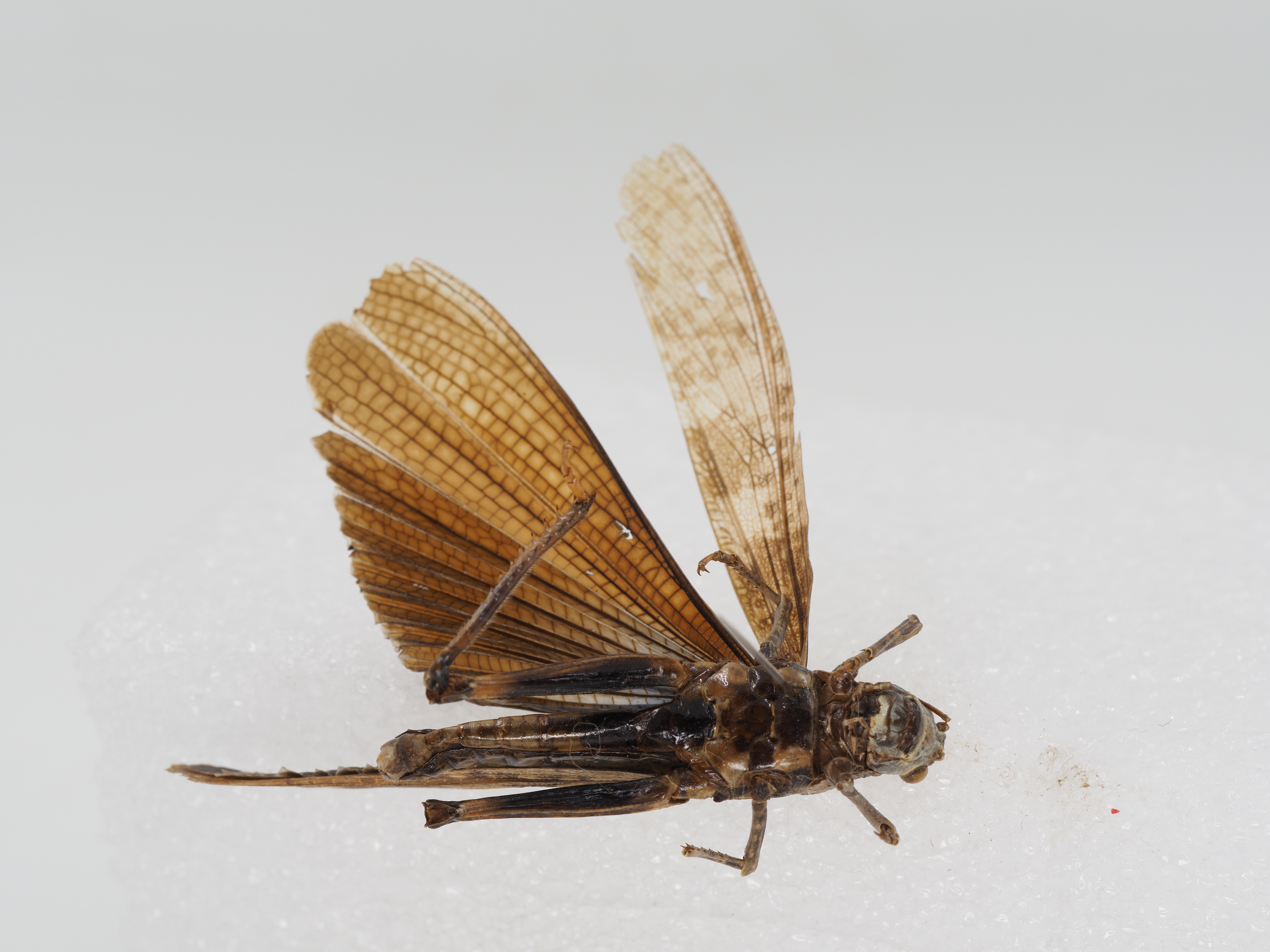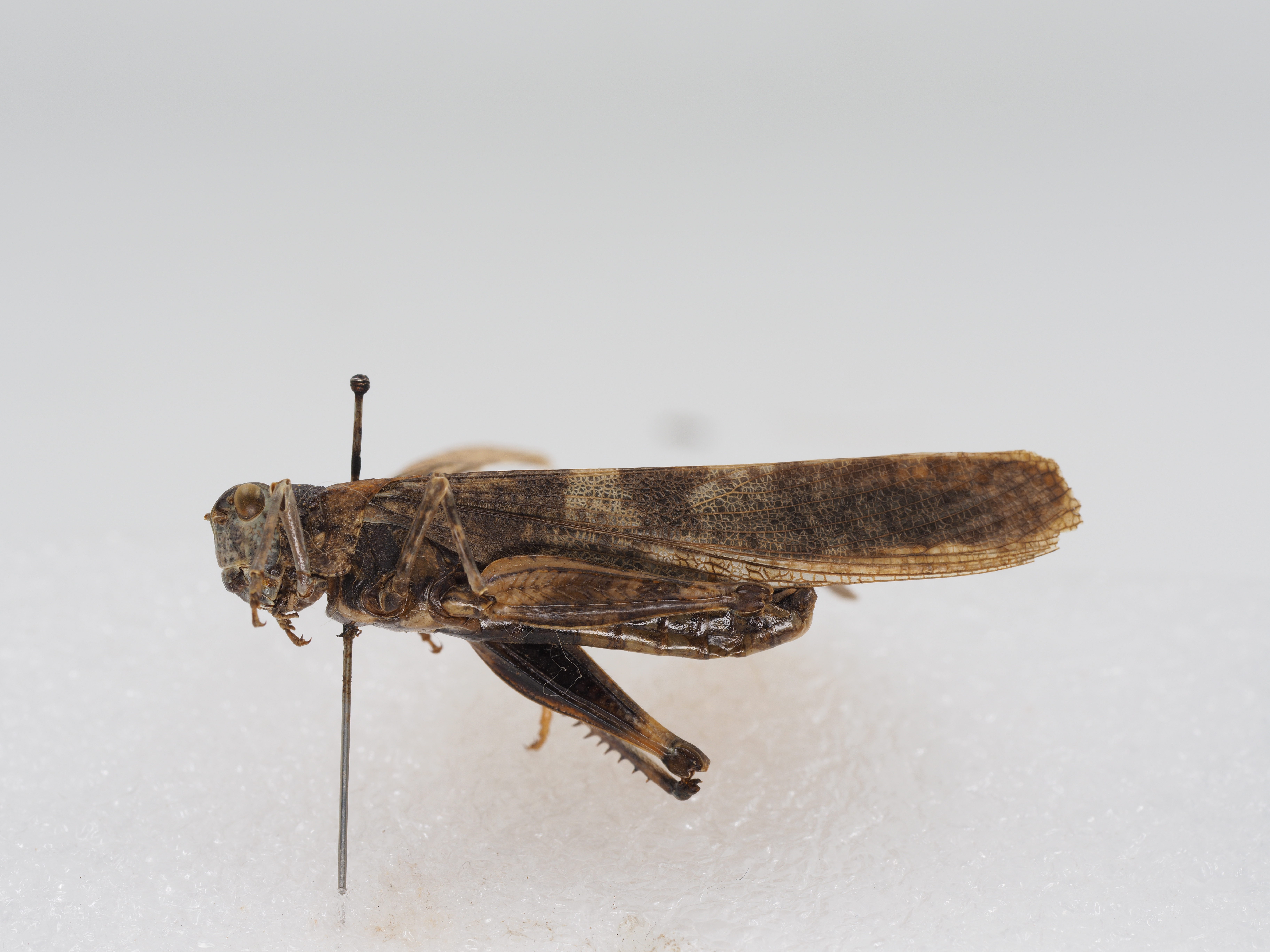 体色 暗褐色,具有细小的暗色斑点。头顶暗褐色;后头部具二条暗褐色纵纹,在后头部无暗蓝色。颜面灰褐色或近灰白色。触角褐色。复眼黄褐色。前胸背板暗褐色。前翅暗褐色,具不明显的暗色斑点。后翅全部暗黑色,在基部略带蓝色;后翅具有较粗的黑色纵脉。雌性后翅较雄性为淡,顶端略淡,其余部分全黑色。前、中足暗褐色或褐色。后足股节外侧暗褐色,暗色横斑不明显或无横斑,近端部有一黄褐色环;内侧和下侧的内缘黑色,近端部有一黄褐色膝前环;内、外膝侧片暗褐色。后足胫节内侧和上侧暗蓝紫色,外侧暗褐色。后足跗节黄褐色。腹部暗褐色。