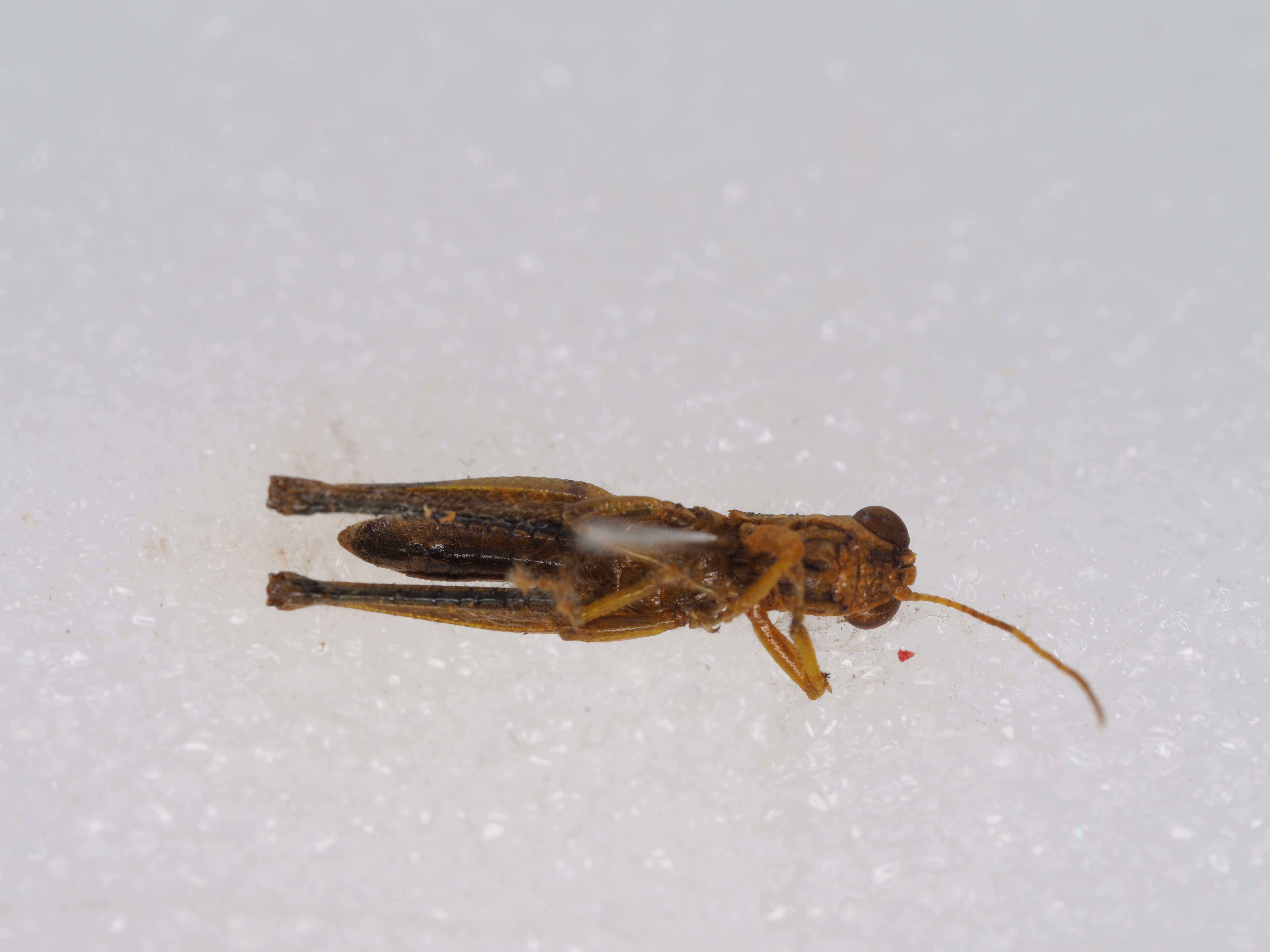 体色:体红褐色。头部、前胸背板及前翅颜色一致,无斑纹。后胸前侧片具一黄色斜纹。后翅透明,基部玫瑰色。后足股节外侧粉红色,外侧上隆线近中部具一近圆形黑斑;内侧红色具两块形状不规则的黑斑,近基部的一块甚大,从基部始延伸至中部。后足胫节及跗节红色。