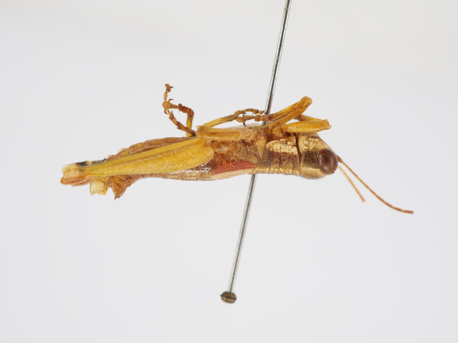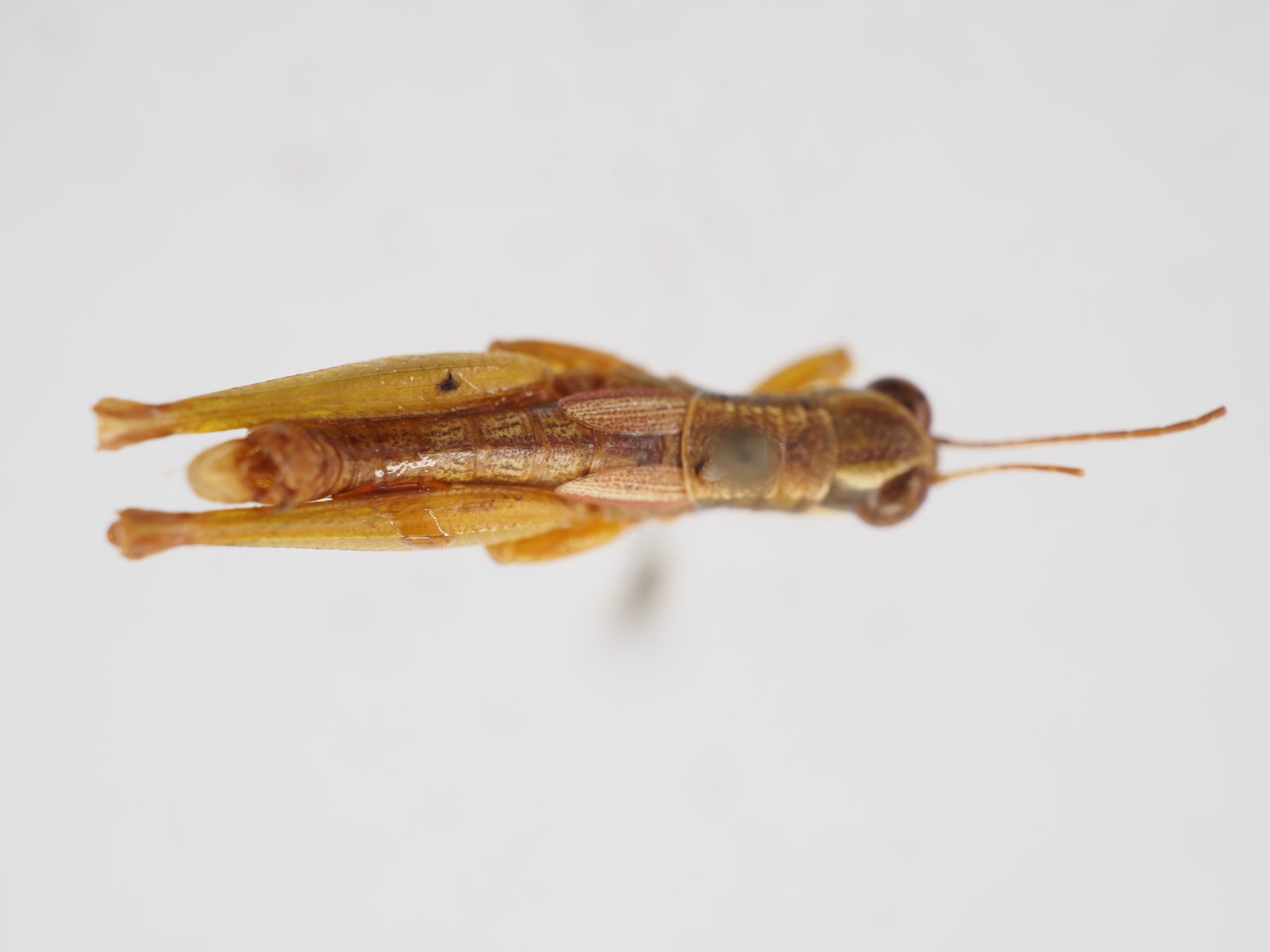体色:体红褐色。头部、前胸背板及前翅颜色一致,无斑纹。后胸前侧片具一黄色斜纹。后翅透明,基部玫瑰色。后足股节外侧粉红色,外侧上隆线近中部具一近圆形黑斑;内侧红色具两块形状不规则的黑斑,近基部的一块甚大,从基部始延伸至中部。后足胫节及跗节红色。