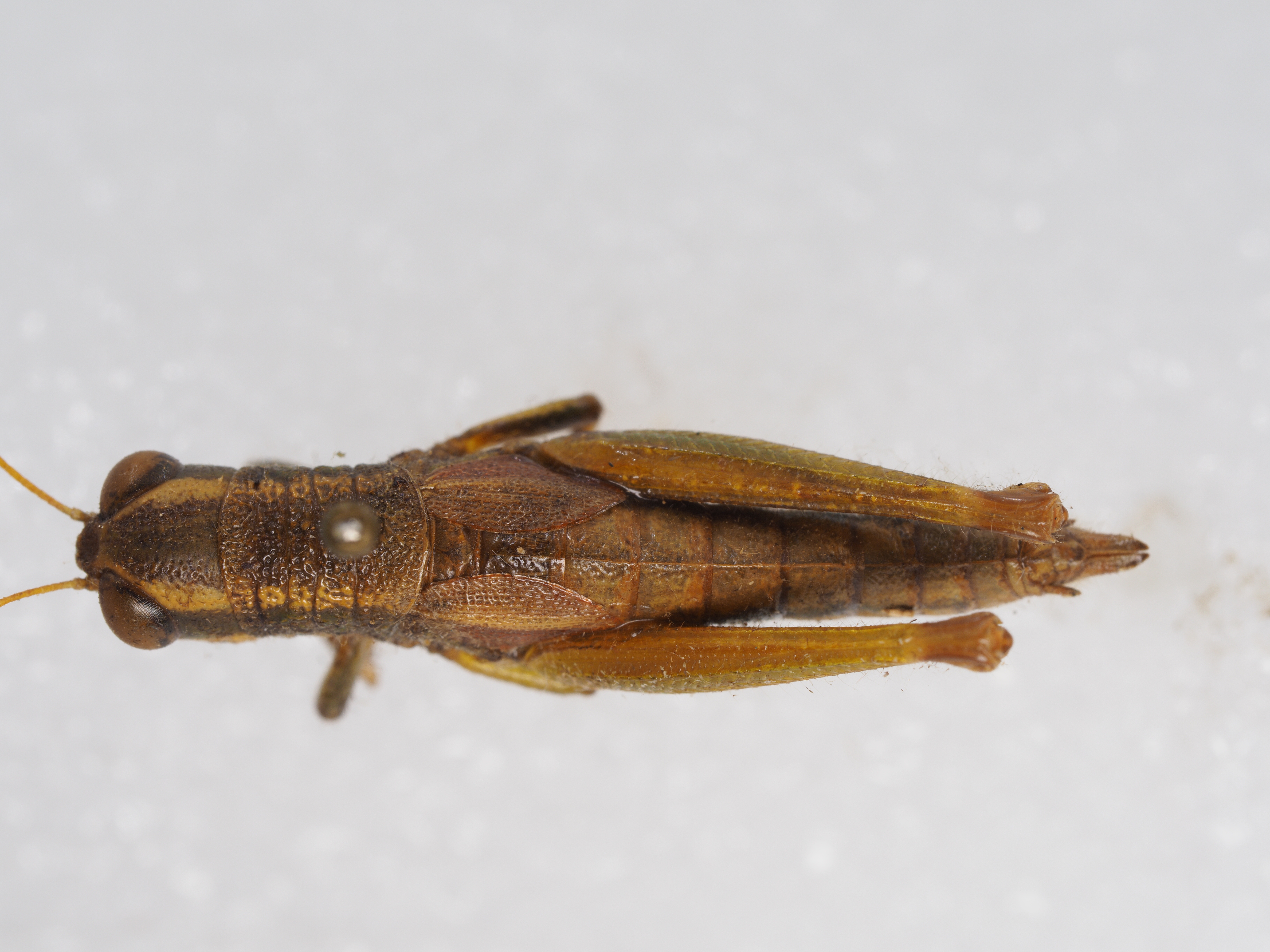 描述:雄性 体型中等。头短于前胸背板。头顶略向前倾斜。缺头侧窝。颜面侧观略向后倾斜,颜面隆起自中单眼之下略凹陷。复眼卵形。触角丝状,到达前胸背板的后缘,中段一节的长略大于宽。前胸背板前缘平直,后缘呈钝角状;中隆线细,缺侧隆线;3条横沟明显割断中隆线,后横沟位于中部,沟前区和沟后区近等长。前胸腹板突圆柱状,顶端钝圆。中胸腹板侧叶间之中隔较狭,中隔的长度约为其最狭处的3倍;后胸腹板侧叶的端部相互毗连。前、后翅发达,前翅超过后足股节的端部。后足股节匀称,长约为宽的4倍,上侧的中隆线具细齿。腹部第1节背板两侧的鼓膜孔呈宽卵形。肛上板端部呈锐角状,基部中央具一仅达中部的短宽纵沟。下生殖板长锥形,端部甚尖。尾须细长,端部弯曲,超过肛上板的顶端。阳具基背片见图284f。