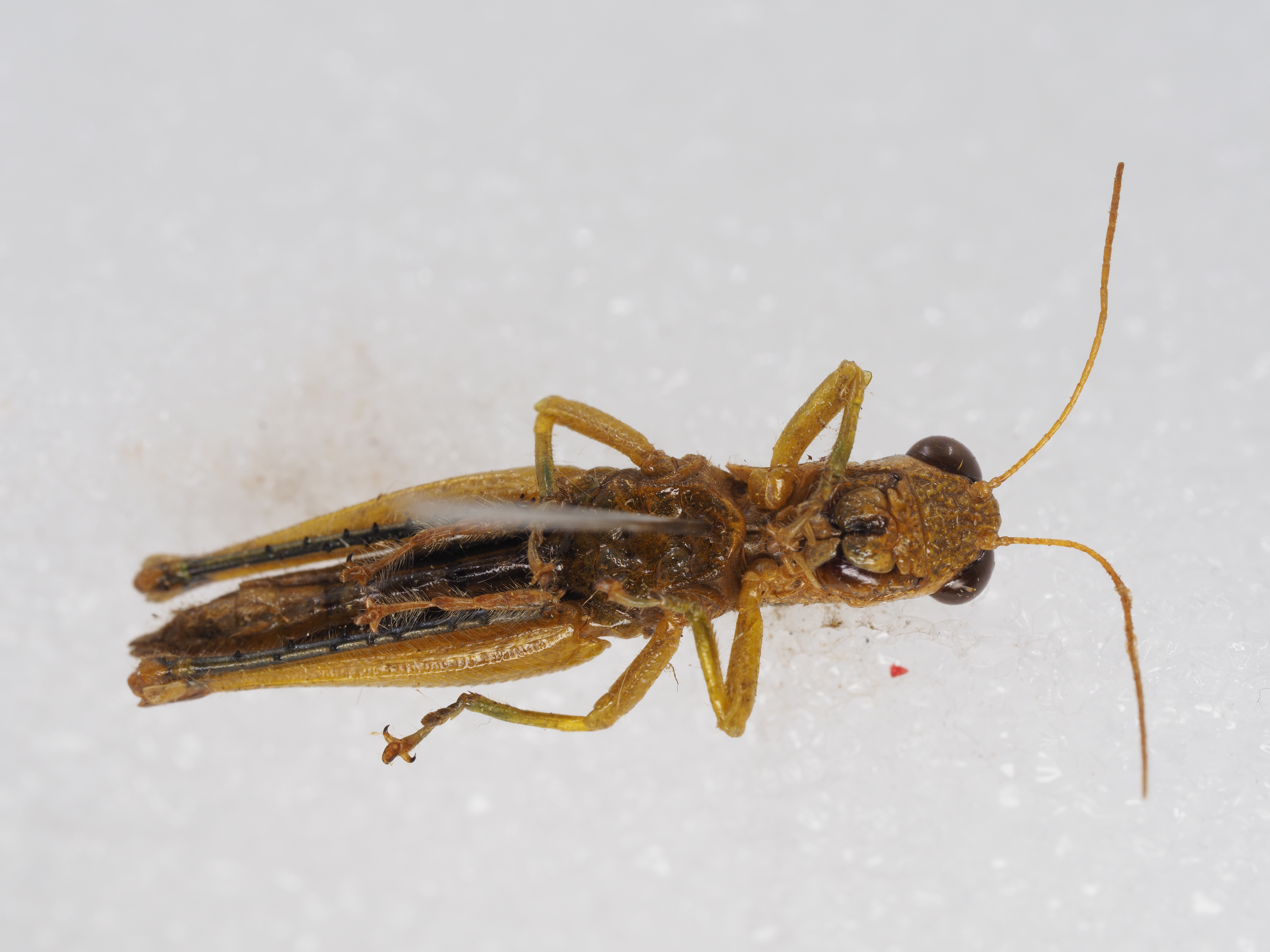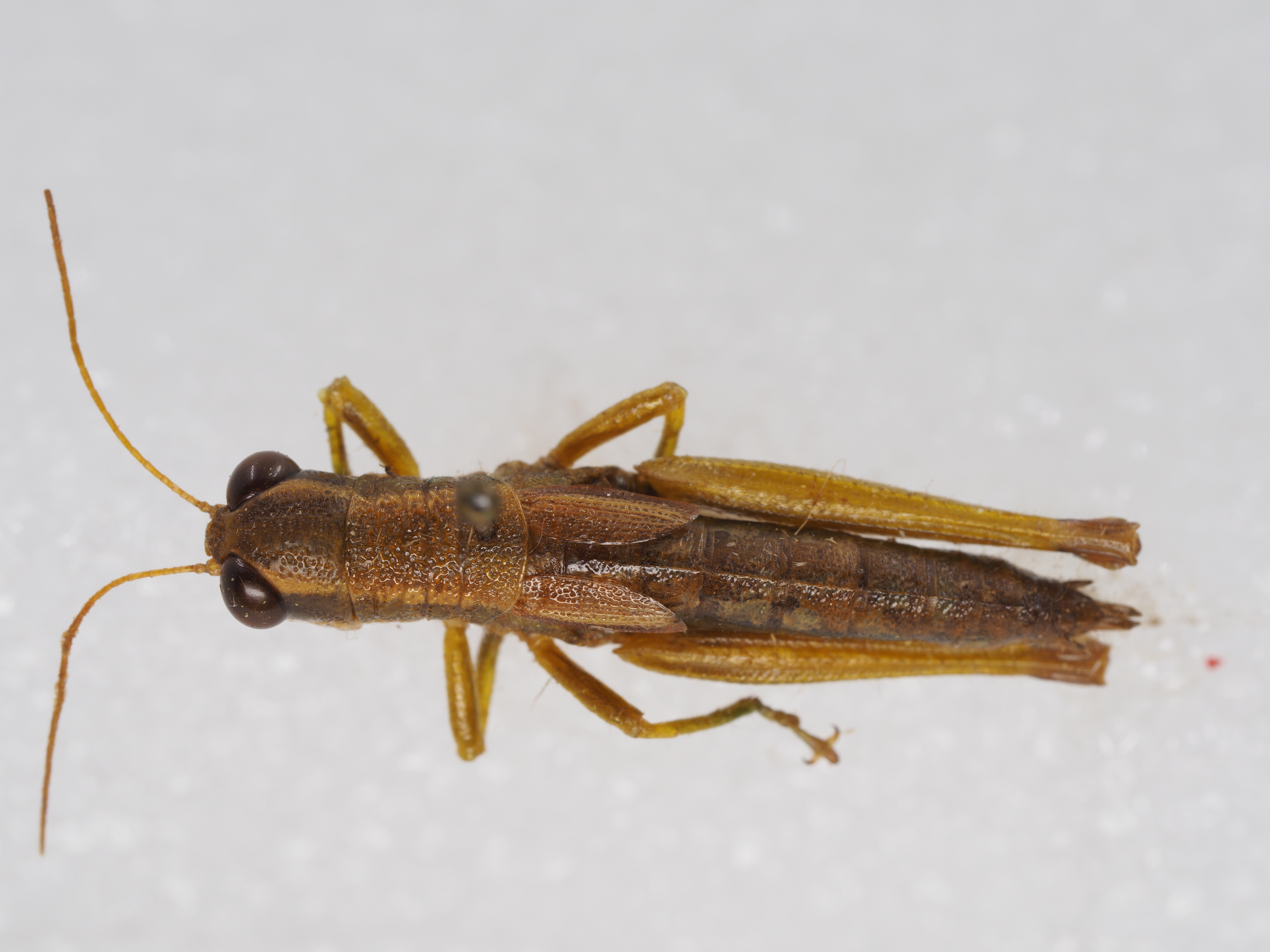 体色:体红褐色。头部、前胸背板及前翅颜色一致,无斑纹。后胸前侧片具一黄色斜纹。后翅透明,基部玫瑰色。后足股节外侧粉红色,外侧上隆线近中部具一近圆形黑斑;内侧红色具两块形状不规则的黑斑,近基部的一块甚大,从基部始延伸至中部。后足胫节及跗节红色。