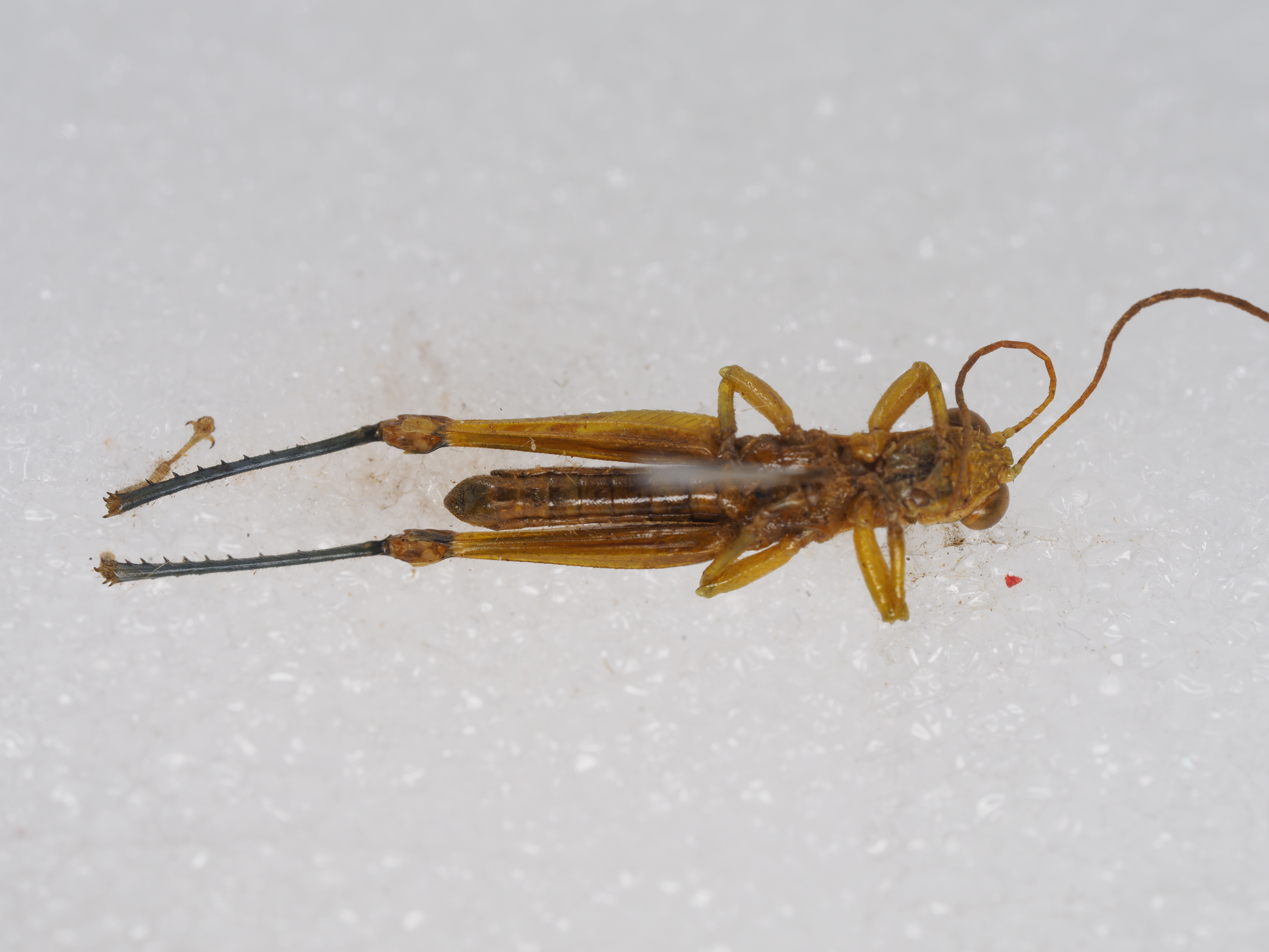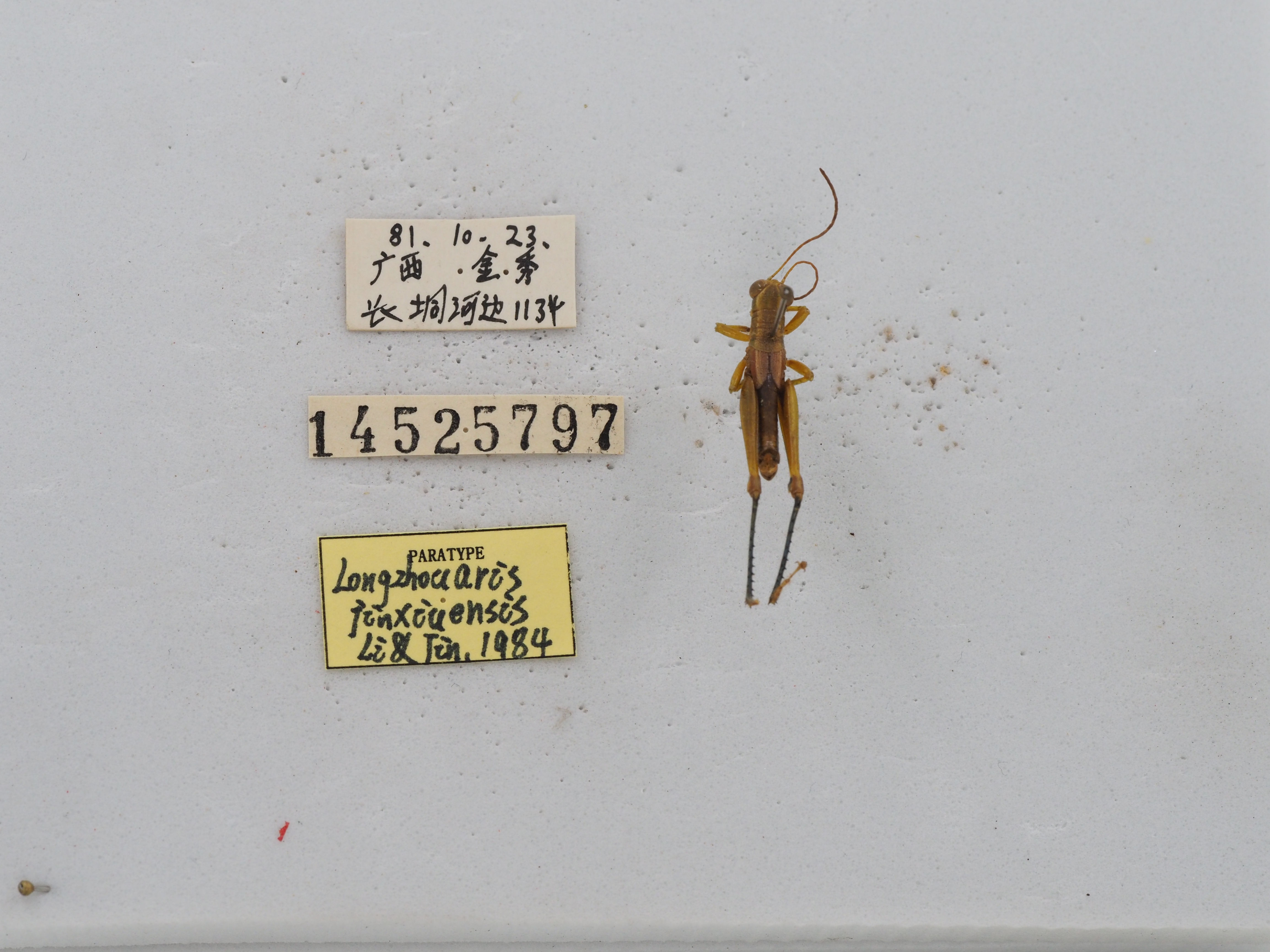 描述:雄性 体型中等。头短于前胸背板。头顶略向前倾斜。缺头侧窝。颜面侧观略向后倾斜,颜面隆起自中单眼之下略凹陷。复眼卵形。触角丝状,到达前胸背板的后缘,中段一节的长略大于宽。前胸背板前缘平直,后缘呈钝角状;中隆线细,缺侧隆线;3条横沟明显割断中隆线,后横沟位于中部,沟前区和沟后区近等长。前胸腹板突圆柱状,顶端钝圆。中胸腹板侧叶间之中隔较狭,中隔的长度约为其最狭处的3倍;后胸腹板侧叶的端部相互毗连。前、后翅发达,前翅超过后足股节的端部。后足股节匀称,长约为宽的4倍,上侧的中隆线具细齿。腹部第1节背板两侧的鼓膜孔呈宽卵形。肛上板端部呈锐角状,基部中央具一仅达中部的短宽纵沟。下生殖板长锥形,端部甚尖。尾须细长,端部弯曲,超过肛上板的顶端。阳具基背片见图284f。