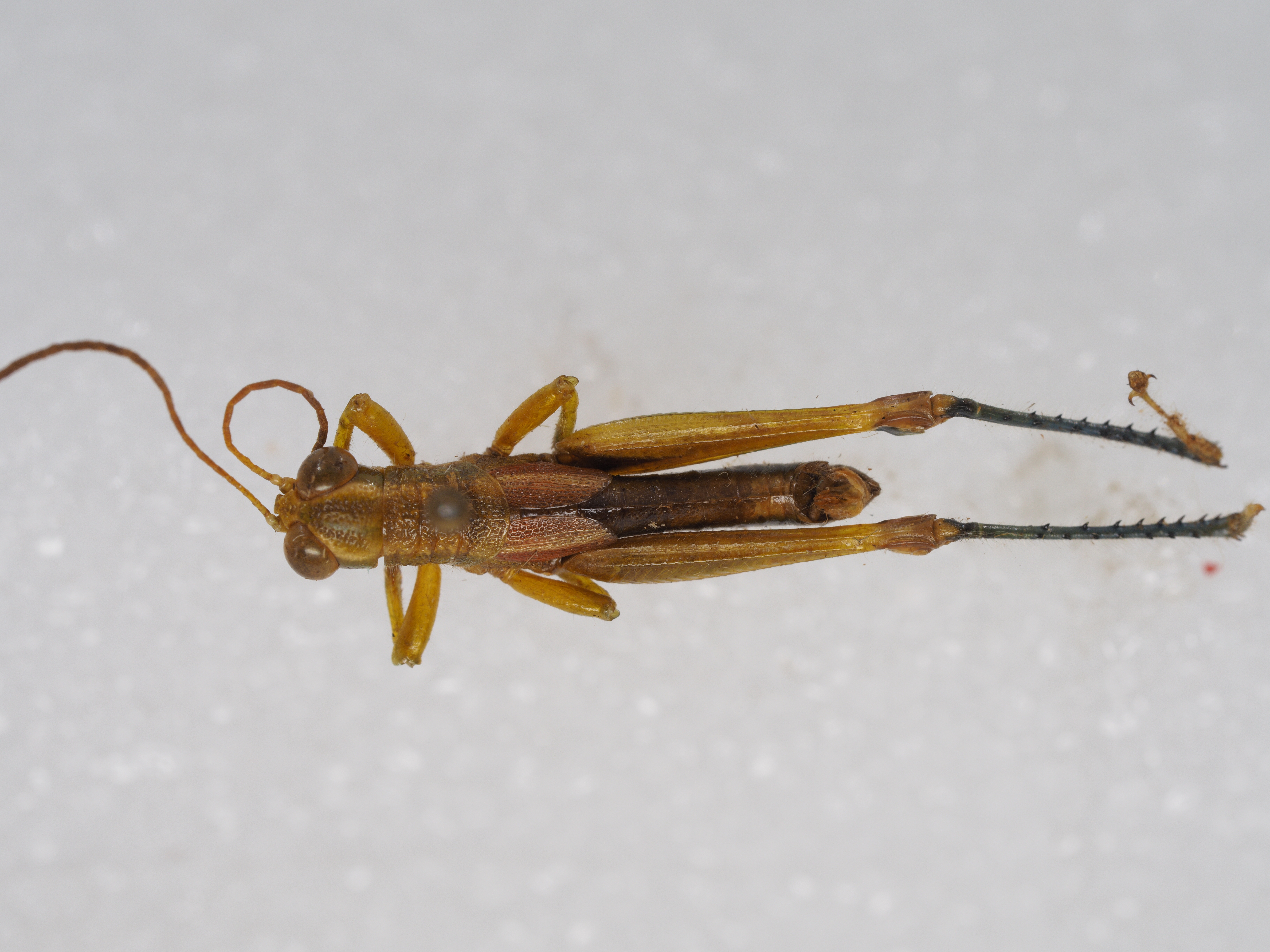 体色:体红褐色。头部、前胸背板及前翅颜色一致,无斑纹。后胸前侧片具一黄色斜纹。后翅透明,基部玫瑰色。后足股节外侧粉红色,外侧上隆线近中部具一近圆形黑斑;内侧红色具两块形状不规则的黑斑,近基部的一块甚大,从基部始延伸至中部。后足胫节及跗节红色。