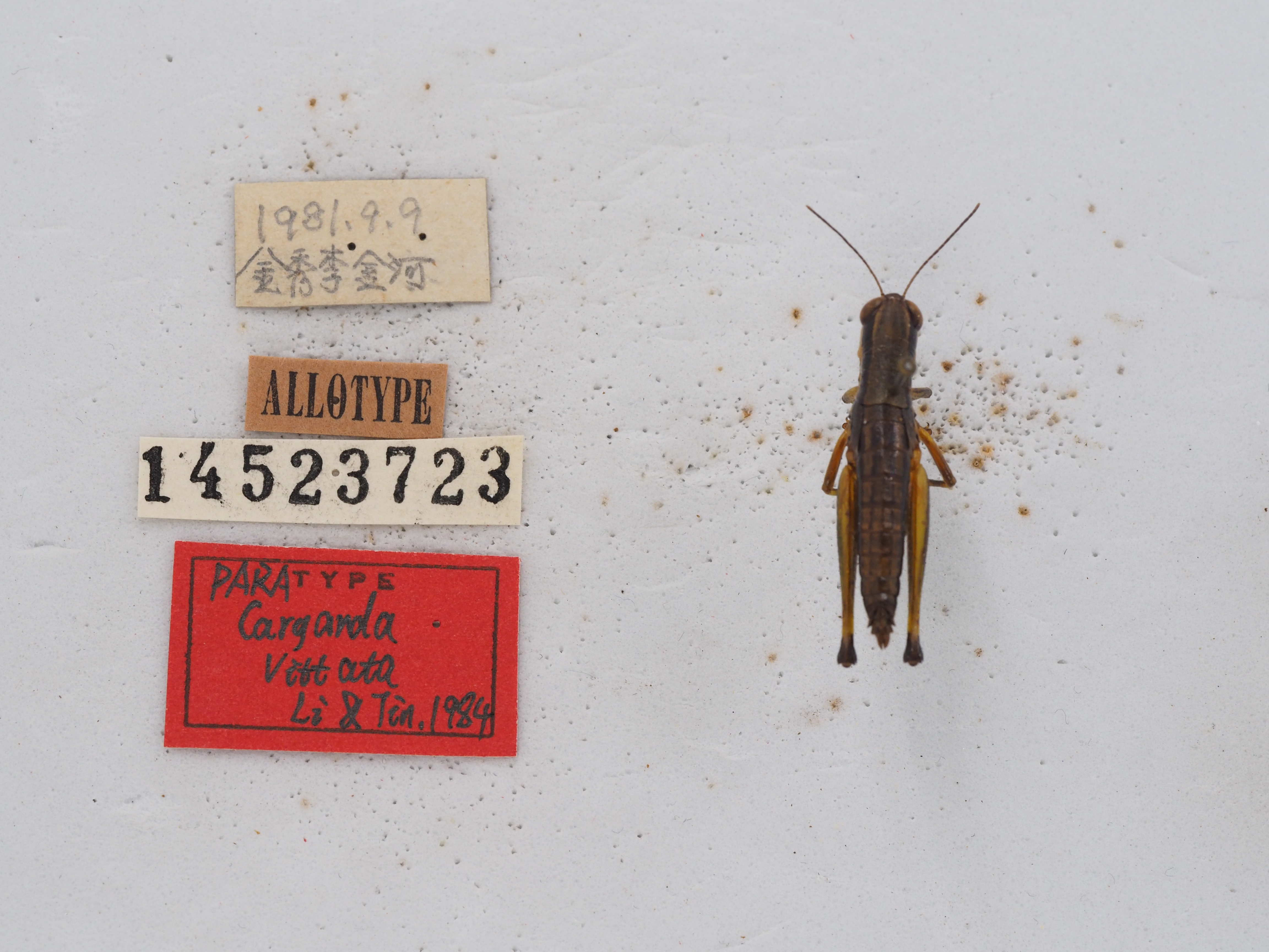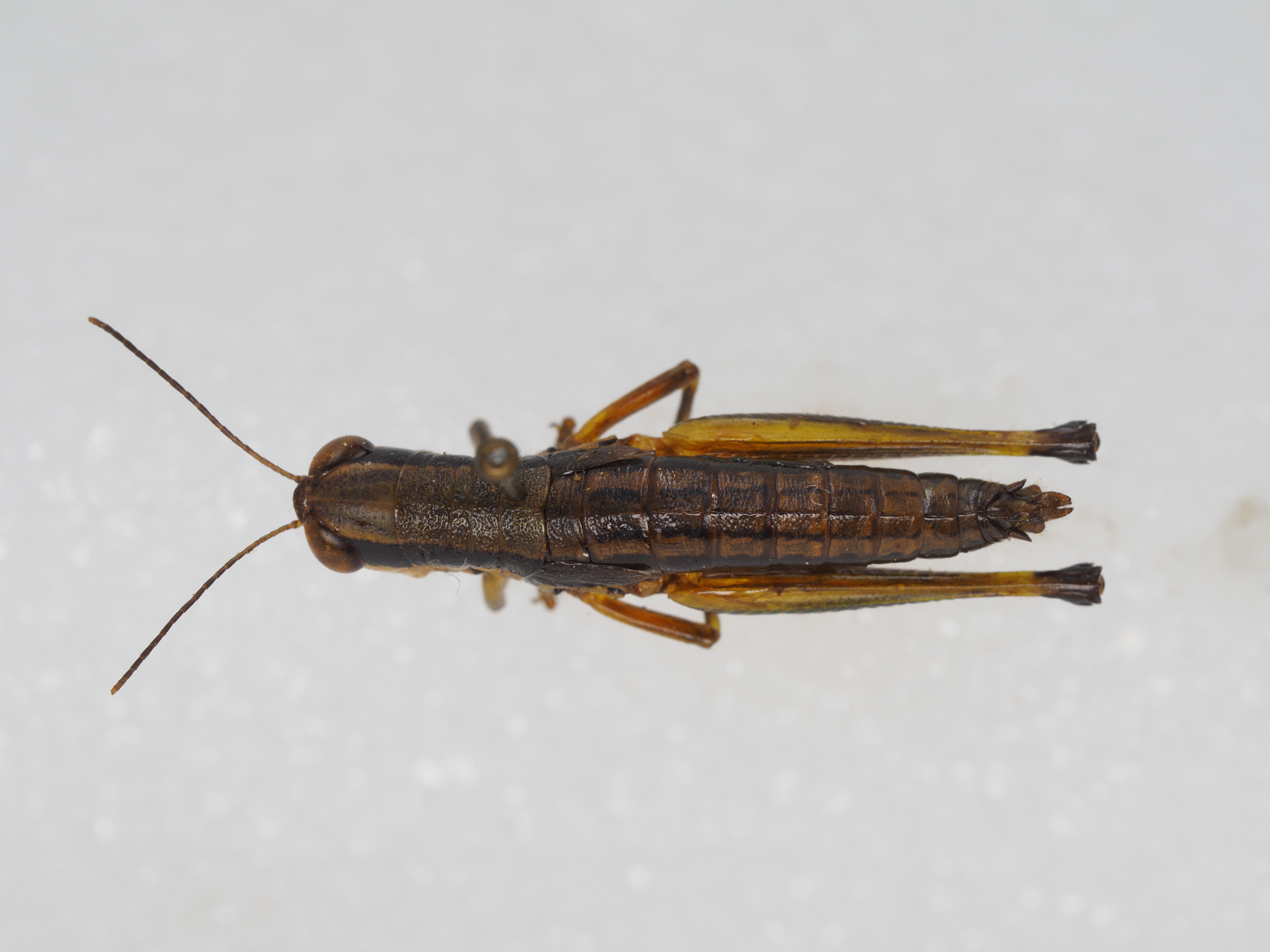 描述:雄性 体小型。头顶突出较短,在复眼前最宽处为其长度的2倍,眼间距的宽度大于颜面隆起在触角间宽度的1.7~1.85倍。颜面侧观向后倾斜,颜面隆起侧缘平行,全长具狭的纵沟。复眼卵圆形,复眼的垂直直径为横径的1.3倍,而为眼下沟长度的2.6倍。触角丝状,超过前胸背板的后缘,中段一节的长度为宽度的3~3.2倍。前胸背板圆柱形,前缘弧形,后缘中央凹陷;中隆线极细,较不明显,缺侧隆线;后横沟位于近后端,沟前区的长度为沟后区长的2.5倍。前胸腹板突圆锥形,顶端较尖。中胸腹板侧叶间中隔的长度为最狭处的2倍。后胸腹板侧叶在后端毗连。前翅狭长,鳞片状,侧置,到达第1腹节背板的后缘,其长度为宽度的3.13~3.5倍。后翅甚微。后足股节匀称,长为宽的5.5倍;上侧之中隆线平滑,顶端形成刺状;下膝侧片顶端尖锐。后足胫节外缘具刺10个,内缘具刺11~13个,具外端刺。鼓膜孔宽卵形。雄性腹部末节背板后缘具小尾片。肛上板盾形,基半中央具浅纵沟。尾须短锥形,略超过肛上板的顶端。下生殖板短锥形,端部钝圆。阳具基背片具二对冠突,内冠突极小,锥形。